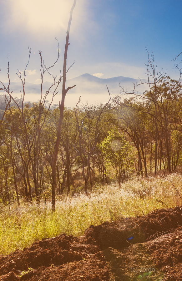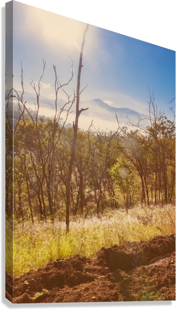 In the serene landscape of Mount Perry Queensland a mist blankets the valley at dawn creating a tranquil mood among the trees and rolling hills