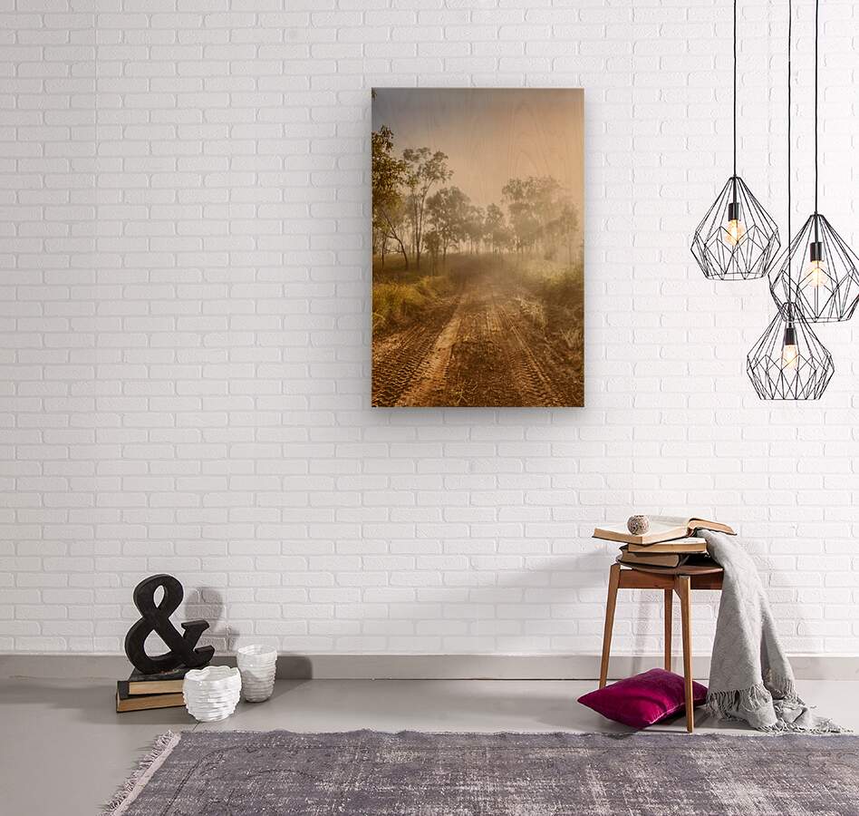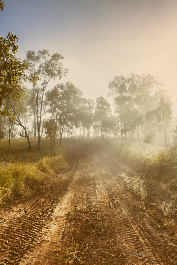 A tranquil dirt road winds through the uplands of Mount Perry Queensland as early morning fog clings to the trees. Sunlight breaks through illuminating the serene atmosphere of nature.