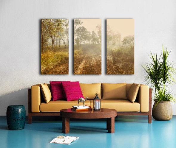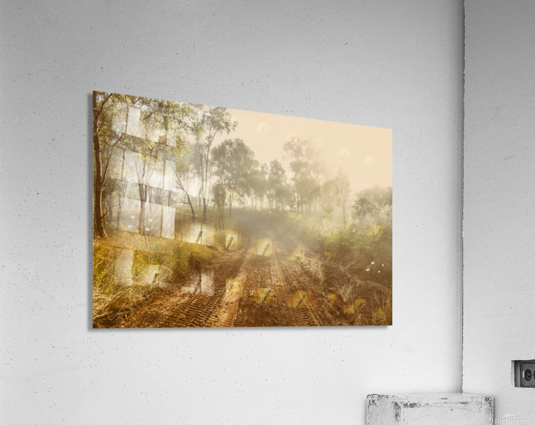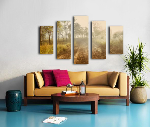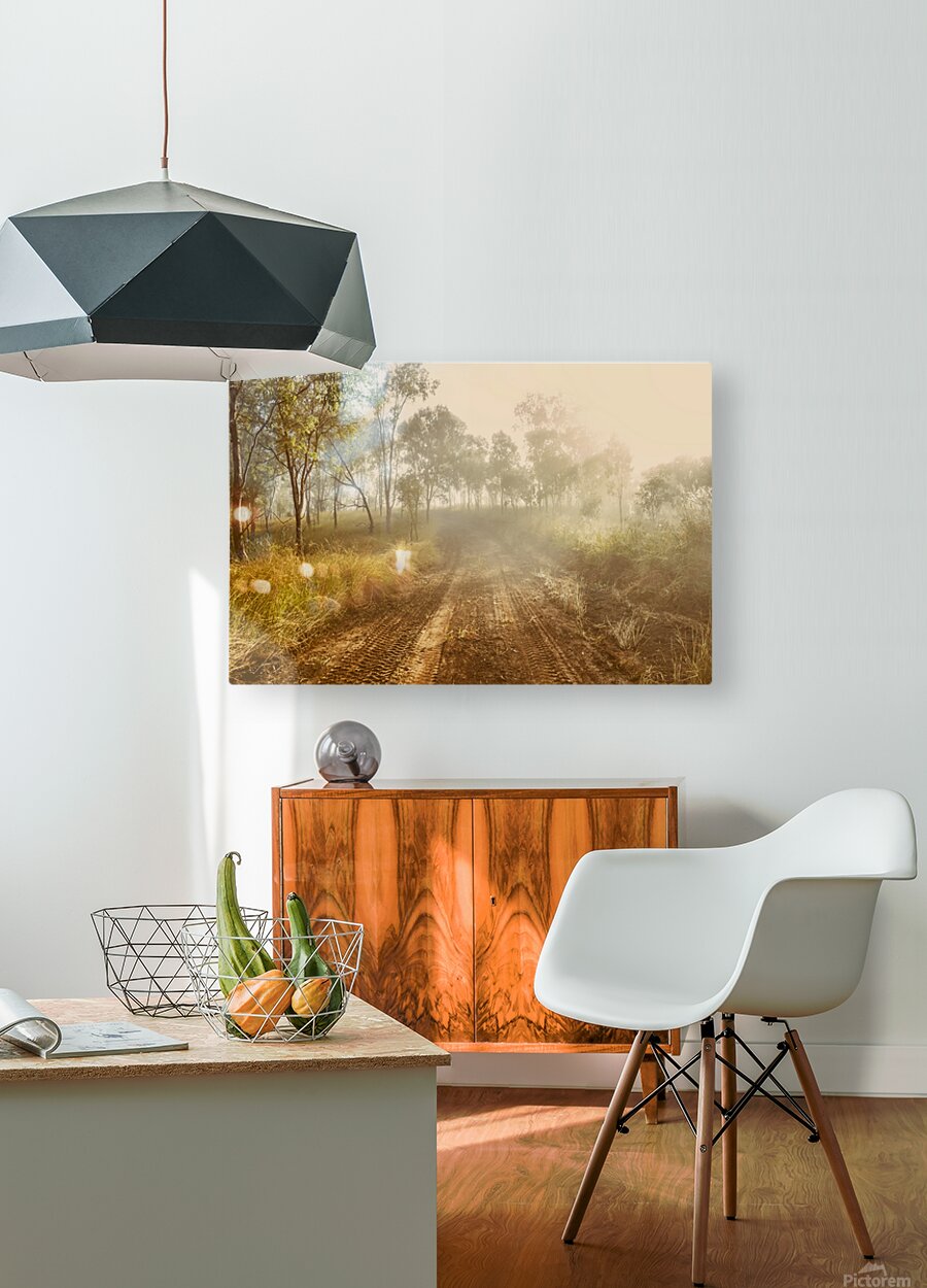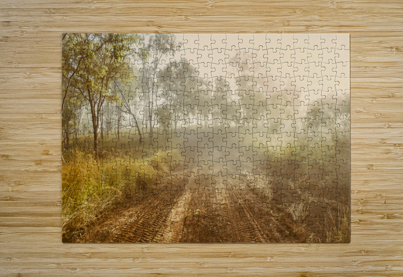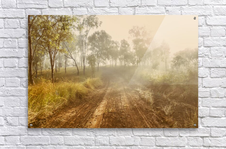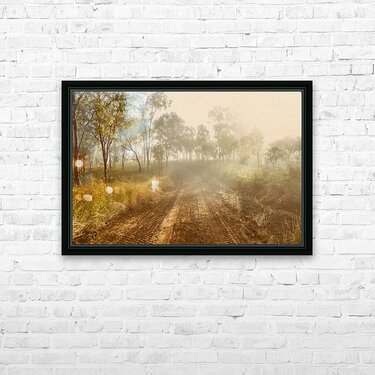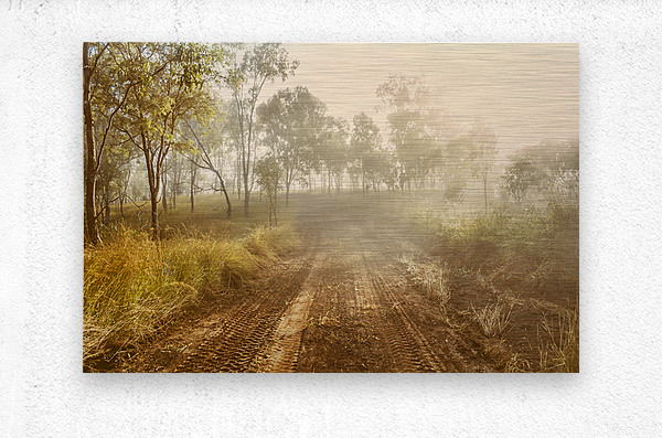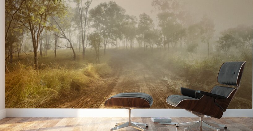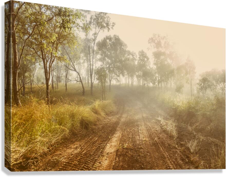 Gentle mist blankets a bushland backroad creating a dreamy scene. Sunlight filters through trees illuminating the dirt path leading into the serene wilderness. Taken: Mt Perry Queensland Australia