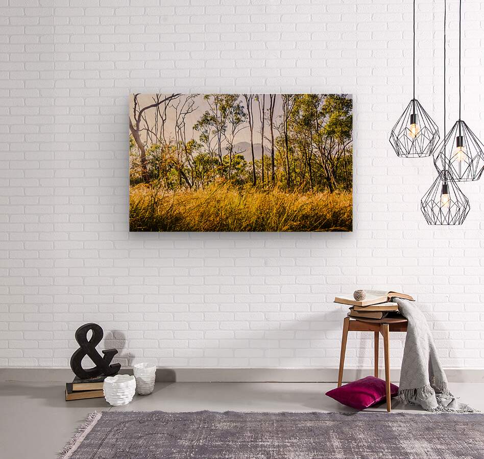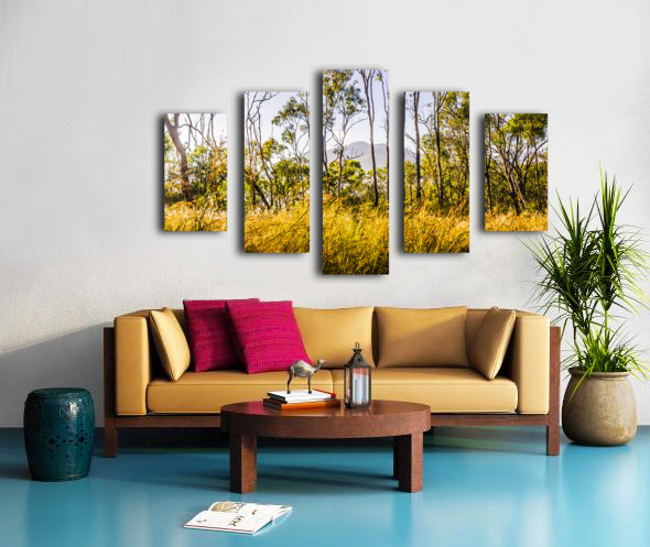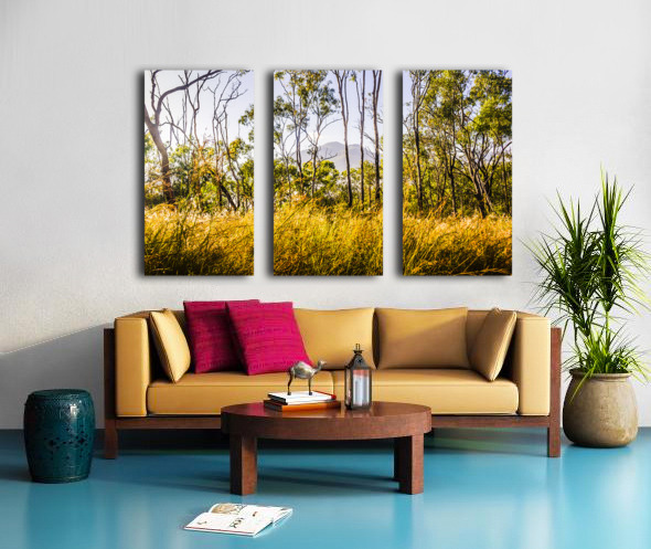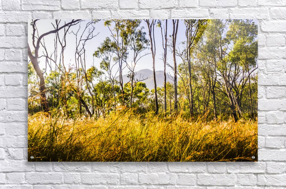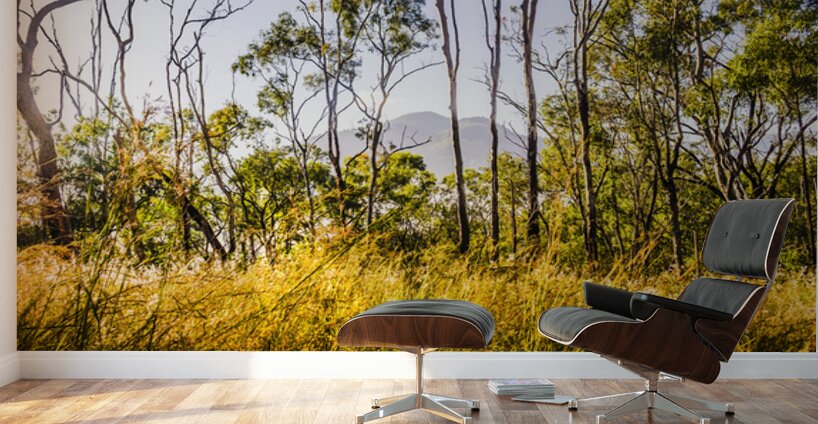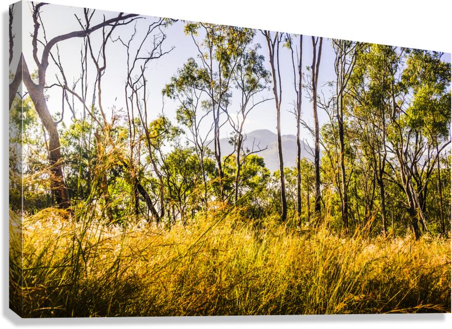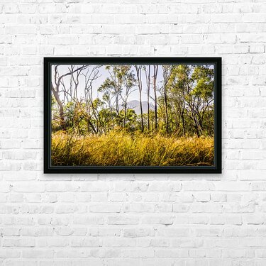 Golden grasses sway gently in the morning breeze framed by tall trees with the gorgeous Mt Perry hazed out softly in the background by morning mist capturing the beauty of Queenslands natural heritage