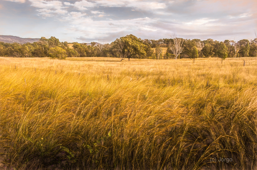 Scrub and fields lit in bright autumnal light of a classic country day in the outbacks. Taken: New Moonta Queensland Australia