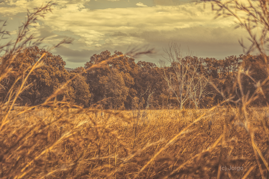 Shabby country landscape of autumn folly with wild grasses swaying in the breeze of a fall farming fields. Captured: New Moonta Queensland Australia