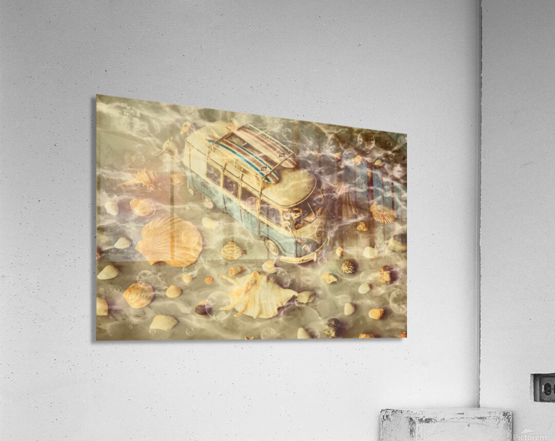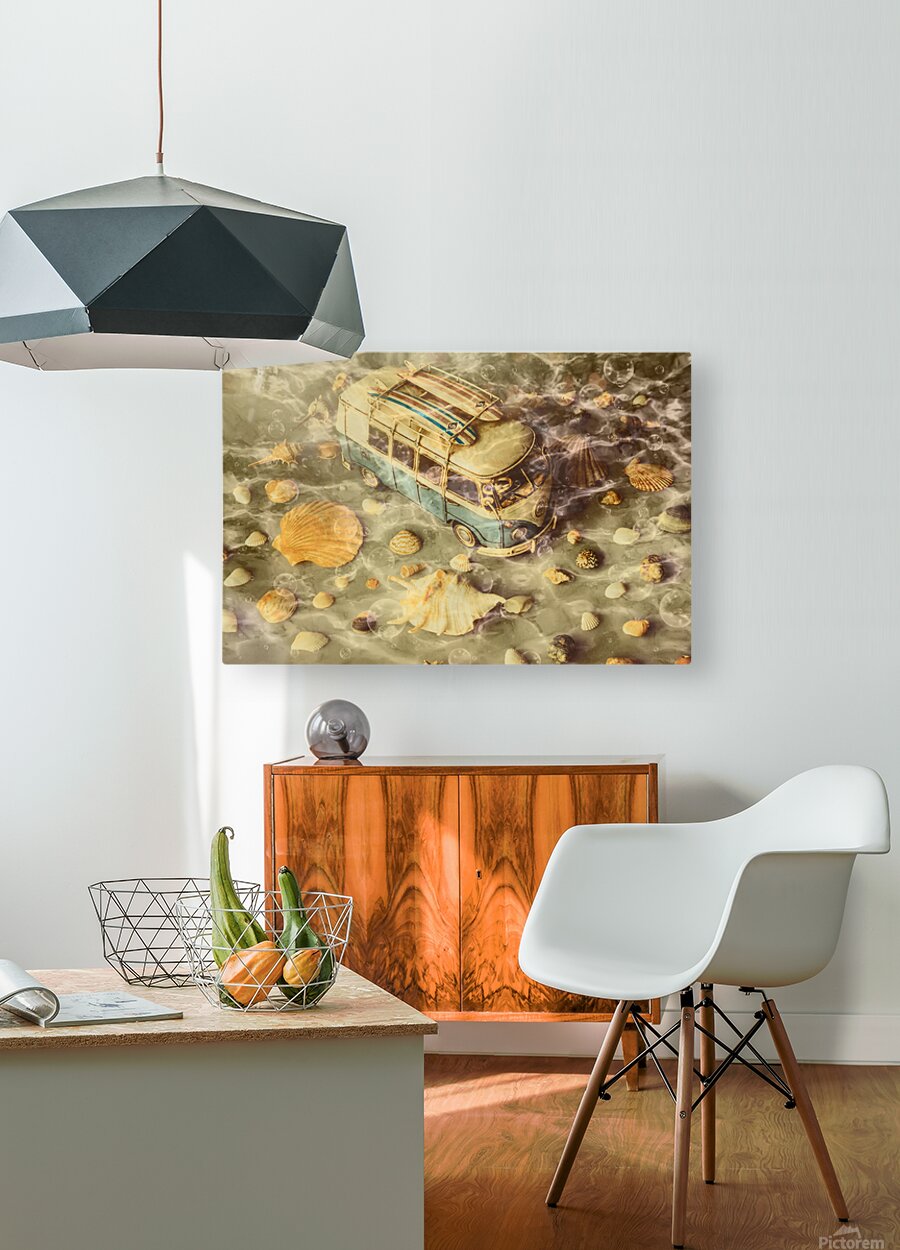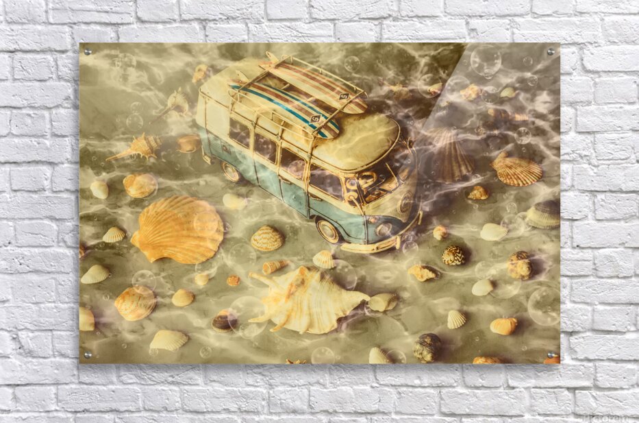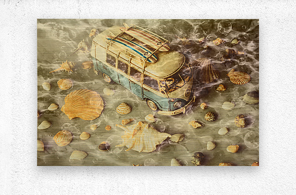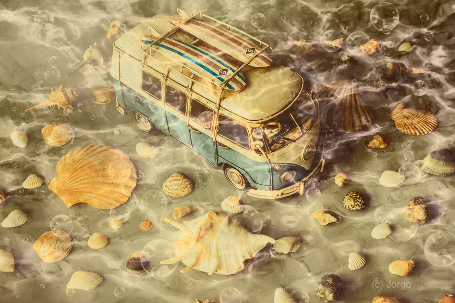 Surfers scene of water waves with seashells and coastal campers abstracted under retro swells of king tide