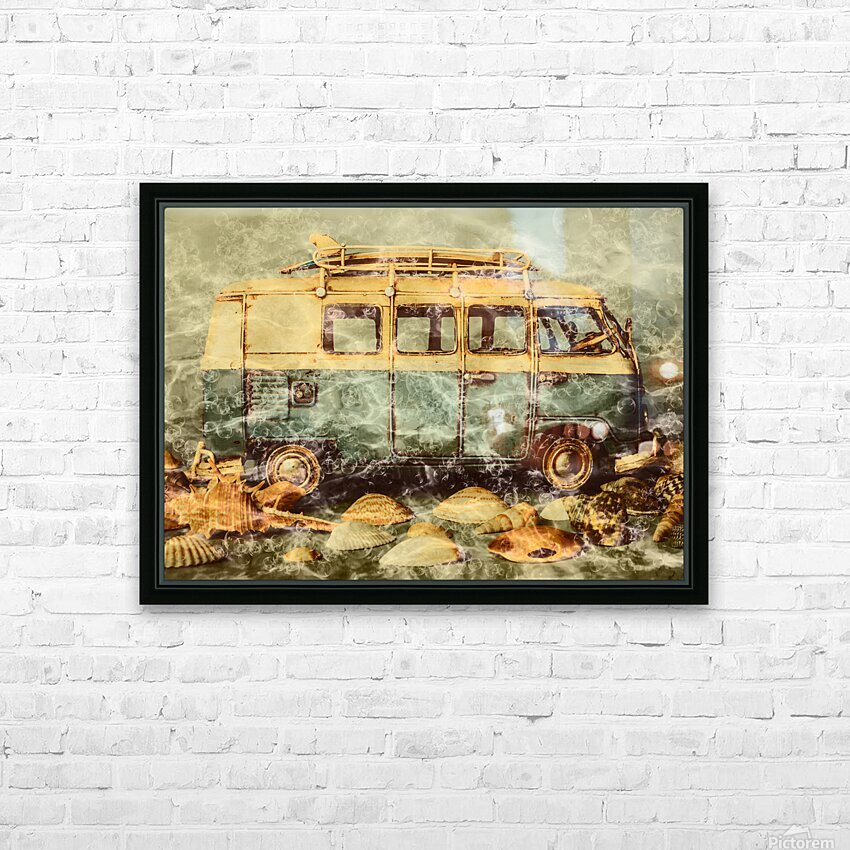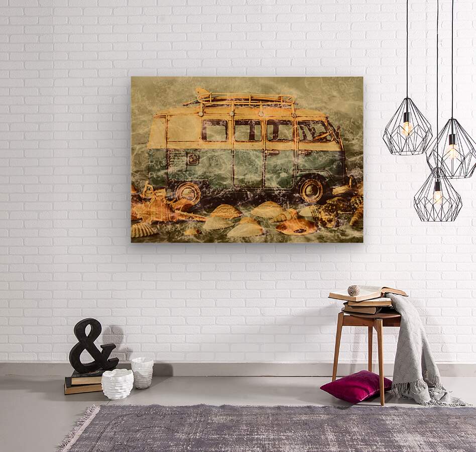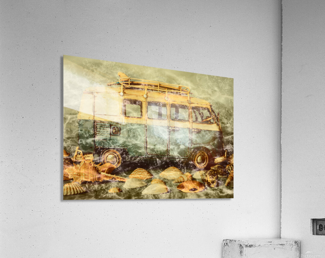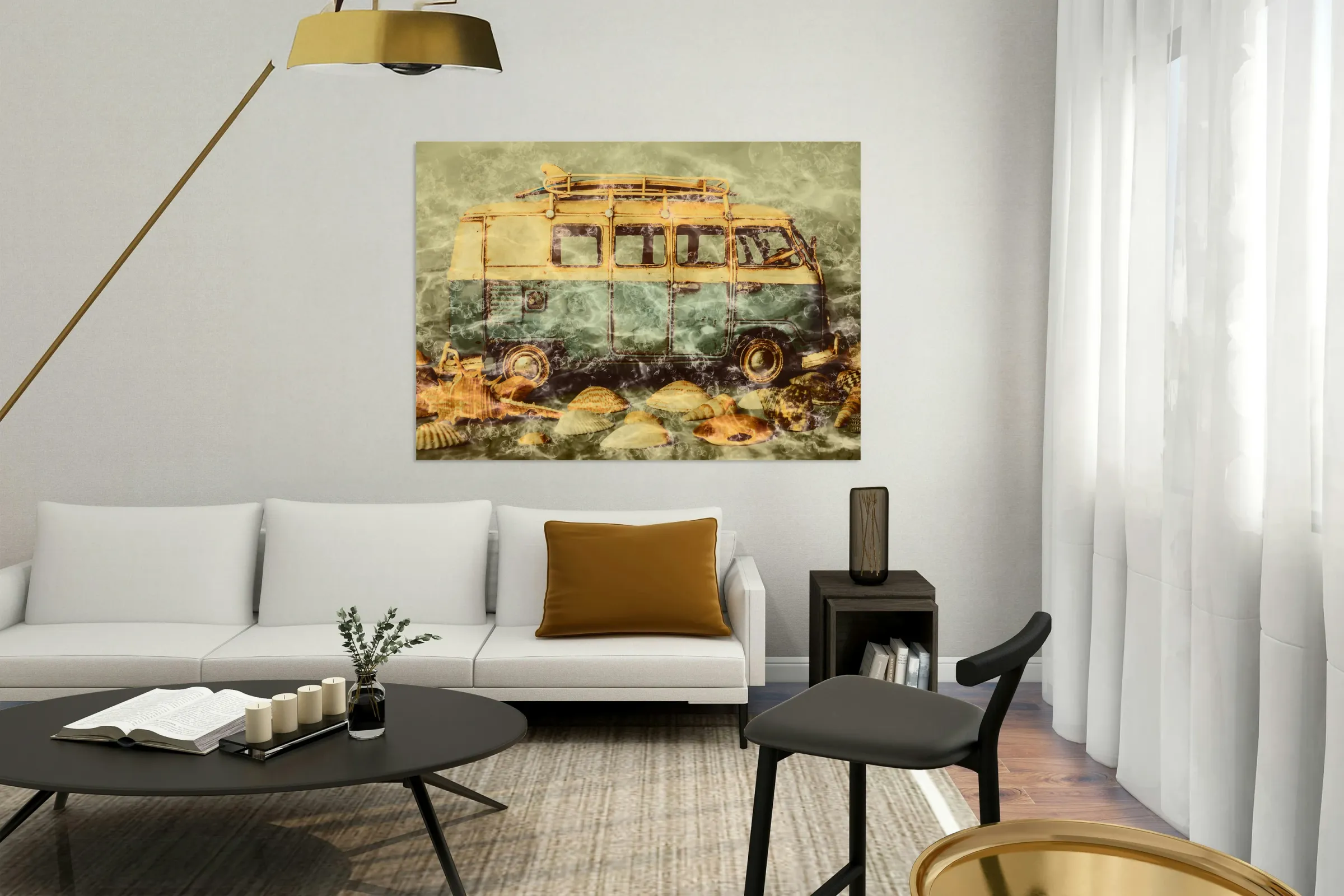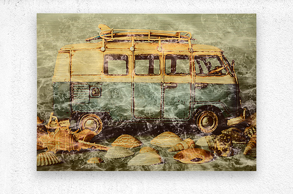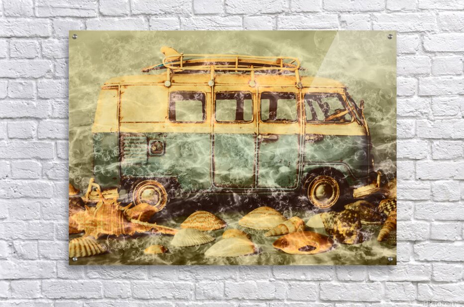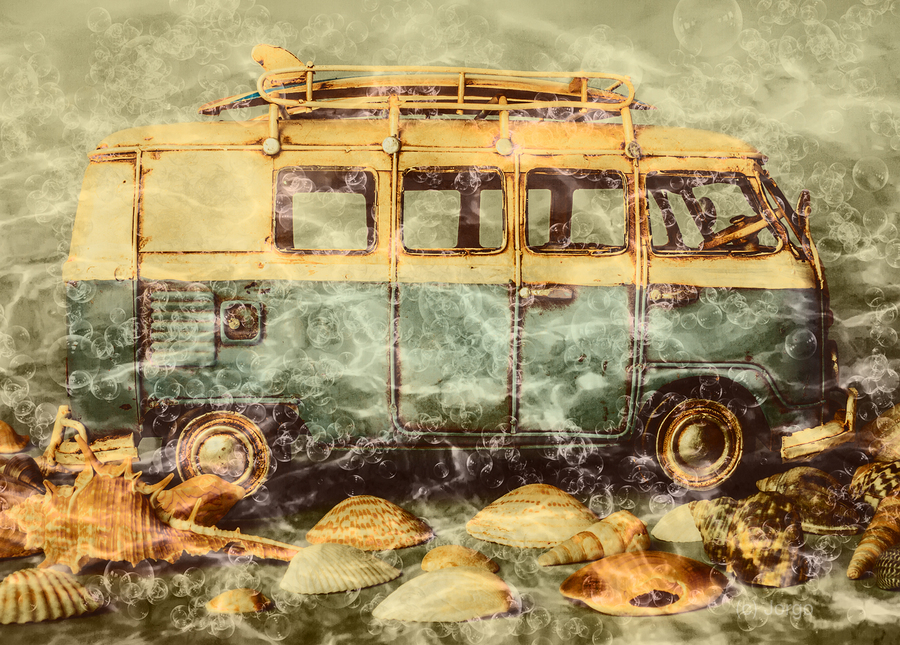 Vintage photography on a wavy underwater world of shells bubbles and beach vans awash down in weathered waters