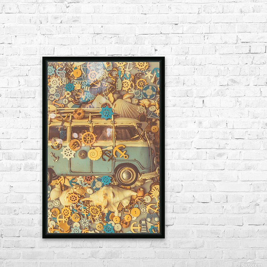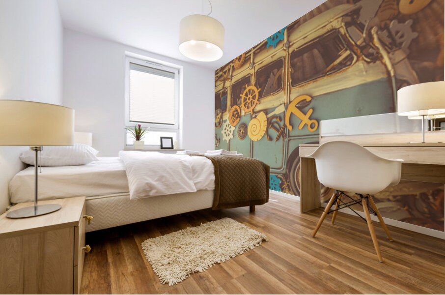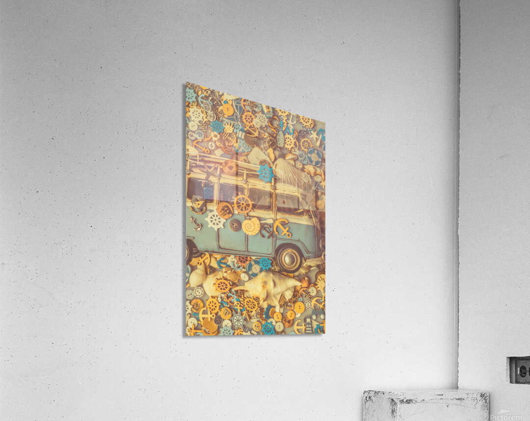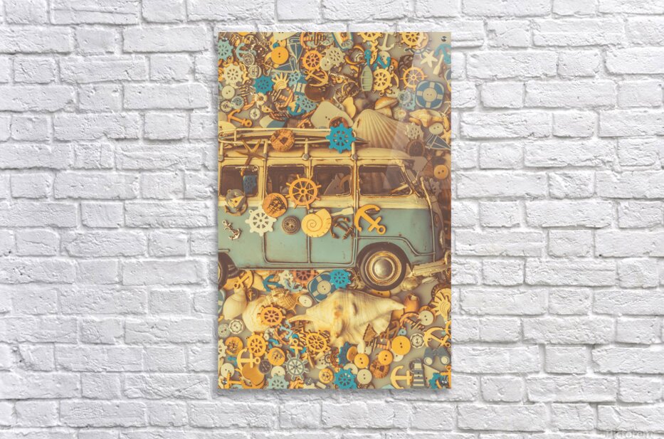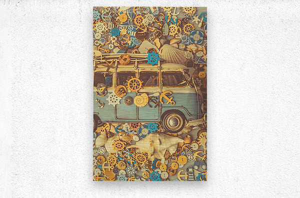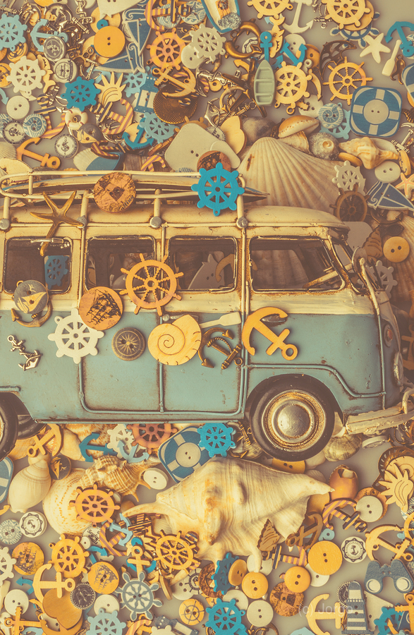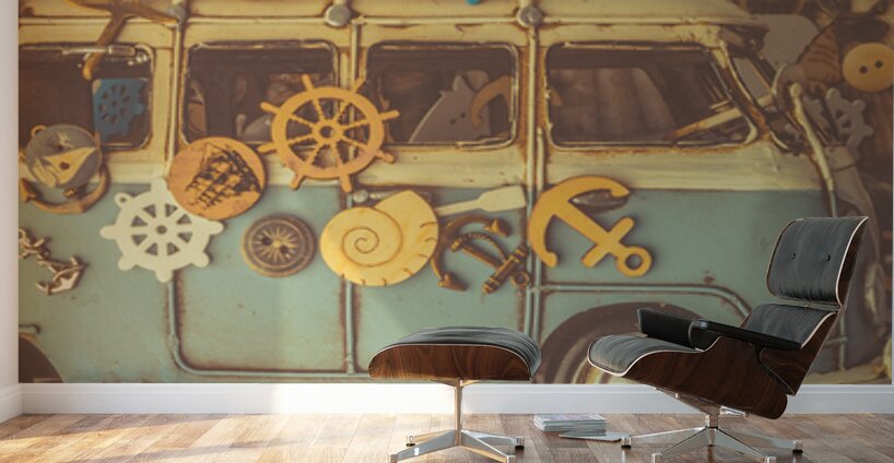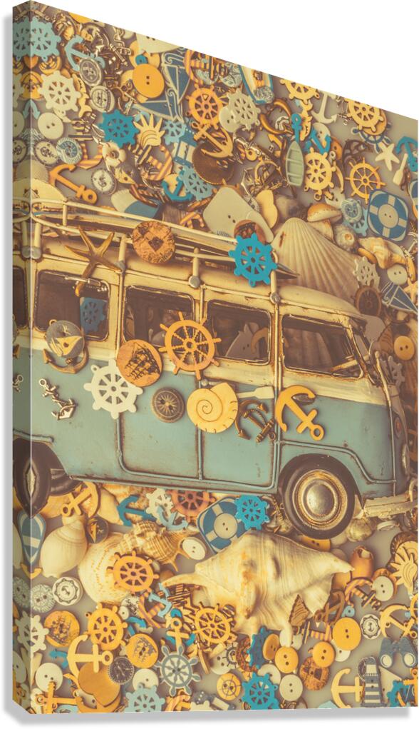 Vintage sea salt scene of nautical tokens and marine motifs abstracted in waves with a rusty van anchored to the sea