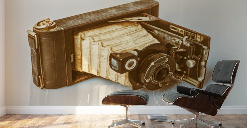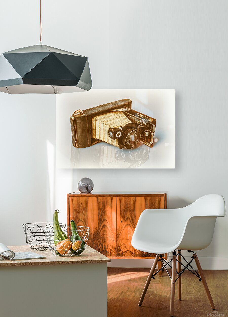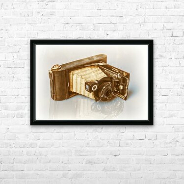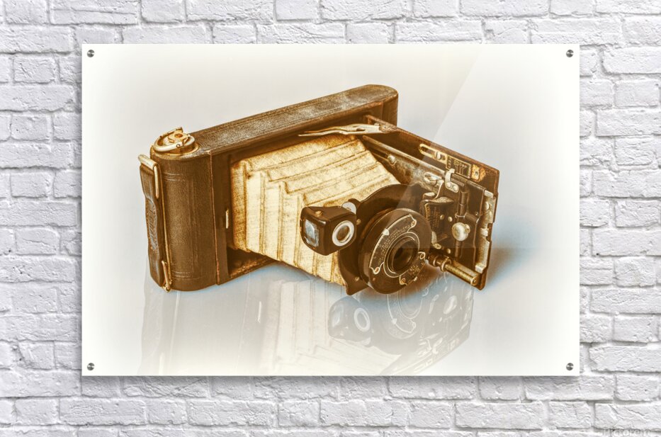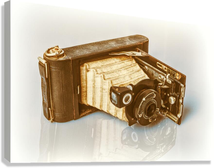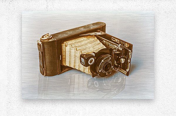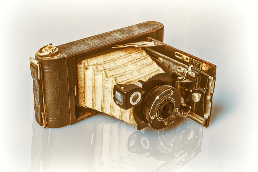 A vintage folding camera reminiscent of the early 20th century rests in an opened position on a white reflective surface
