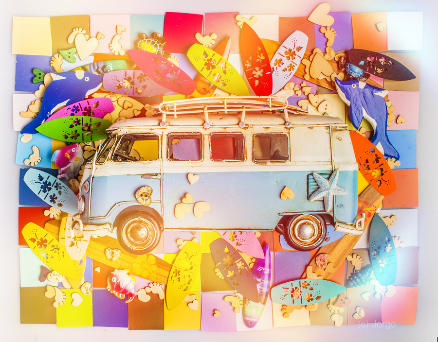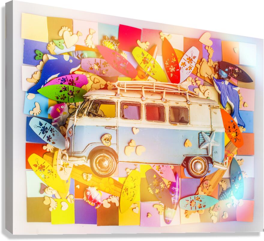 Flared beach composite of camper vans surfboards travel feet and marine motifs in retro styled light leaks