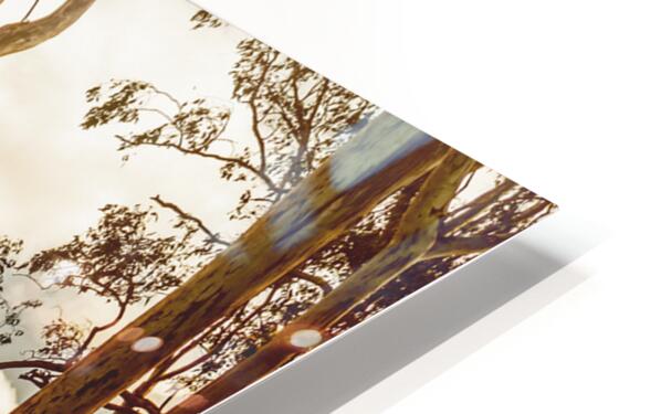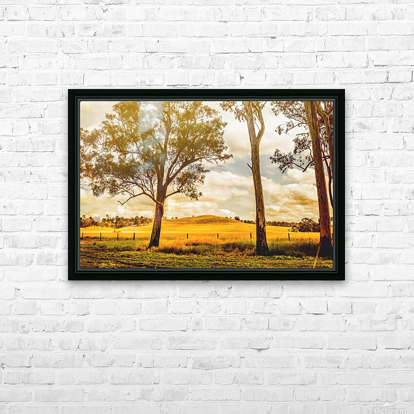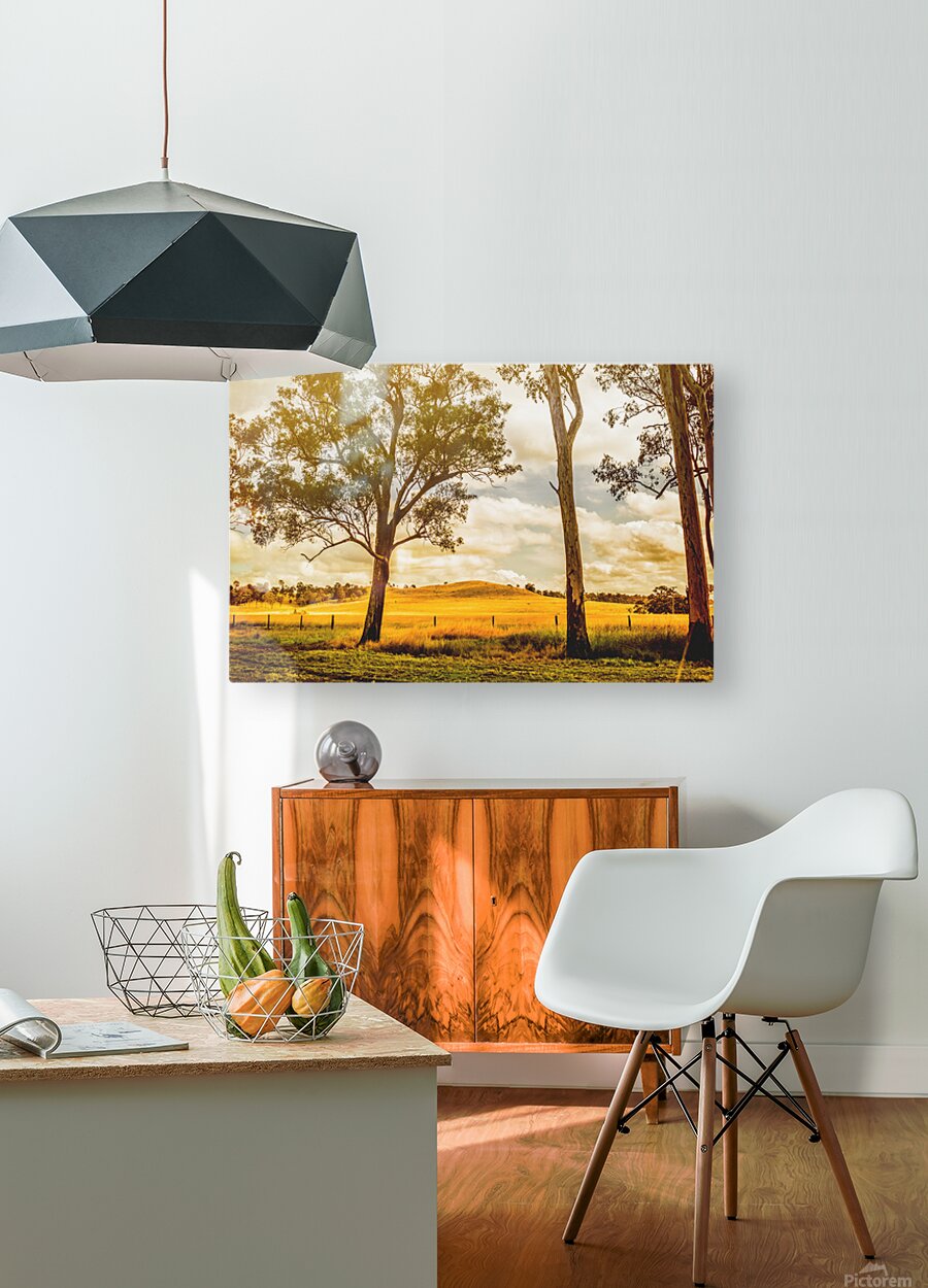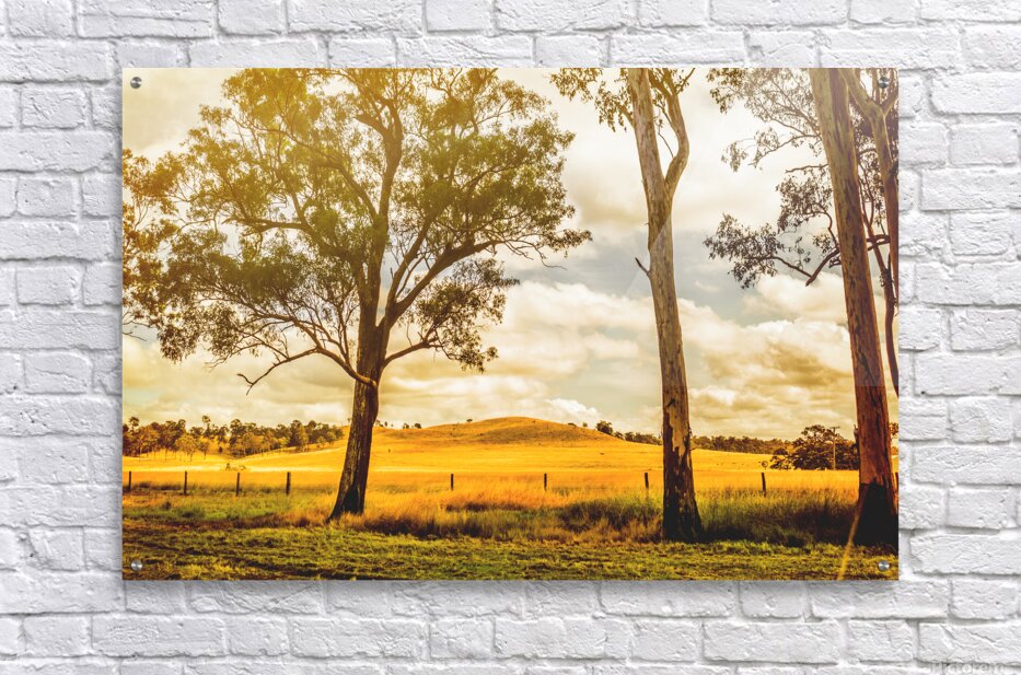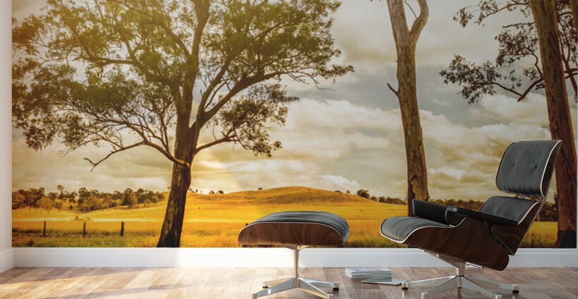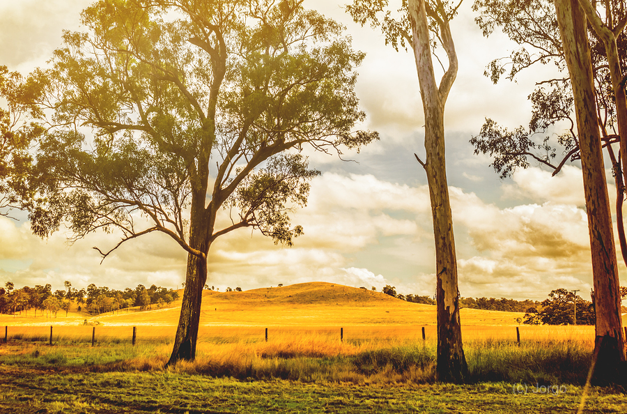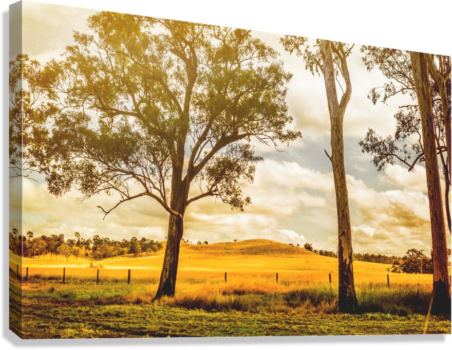 Sunlight bathes a golden field in Gin Gin Queeensland Australia. Tall eucalyptus trees stand guard as a gentle hill rises in the distance