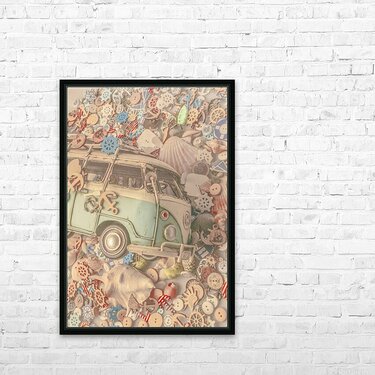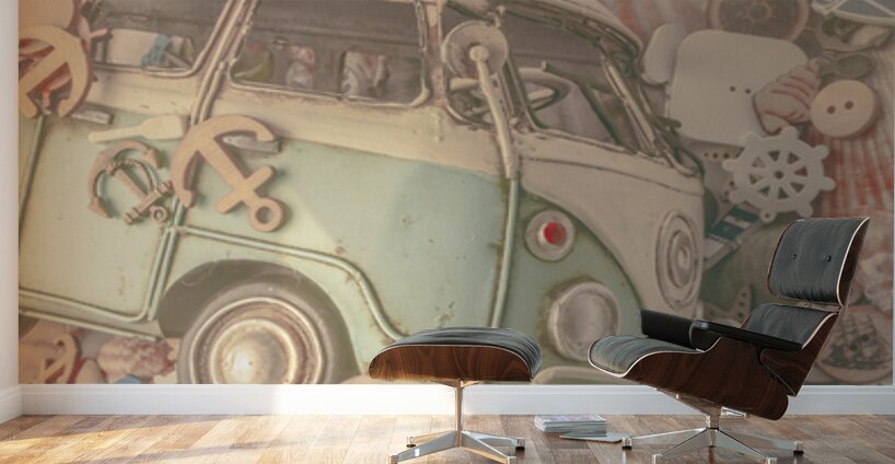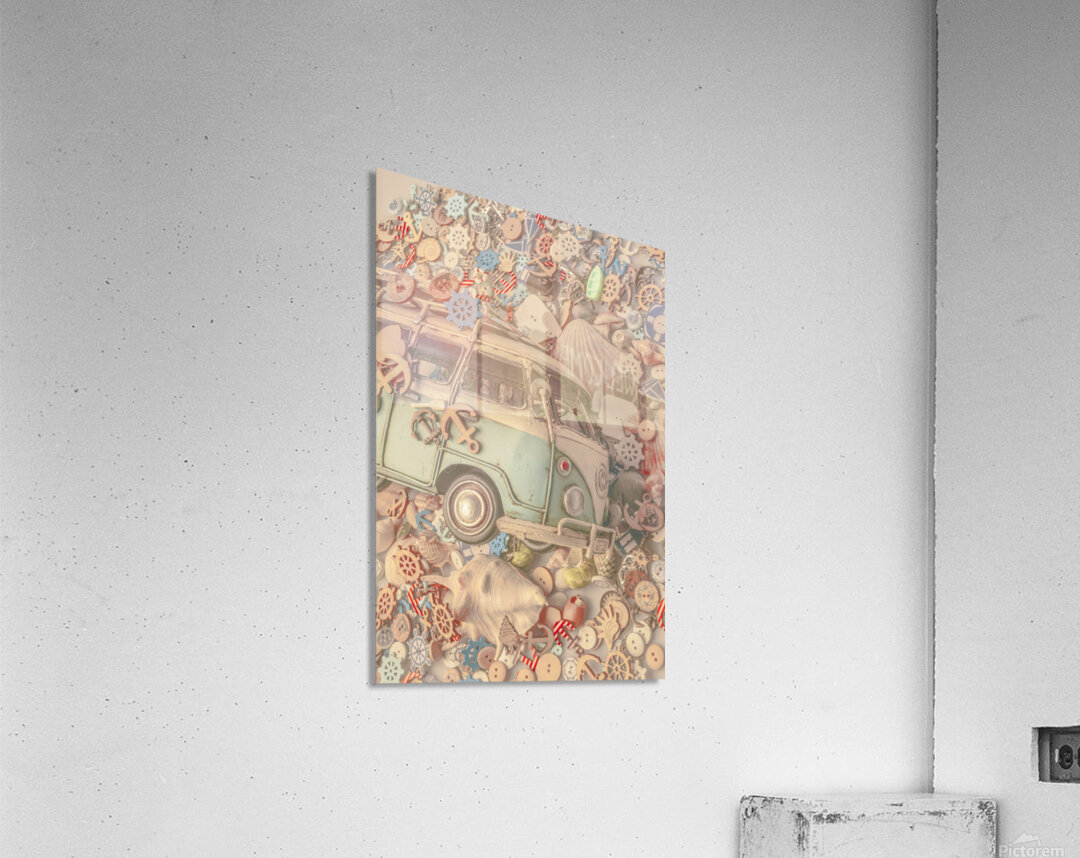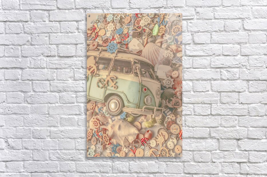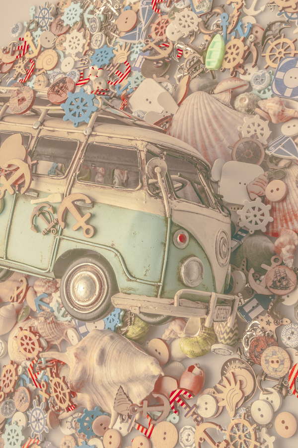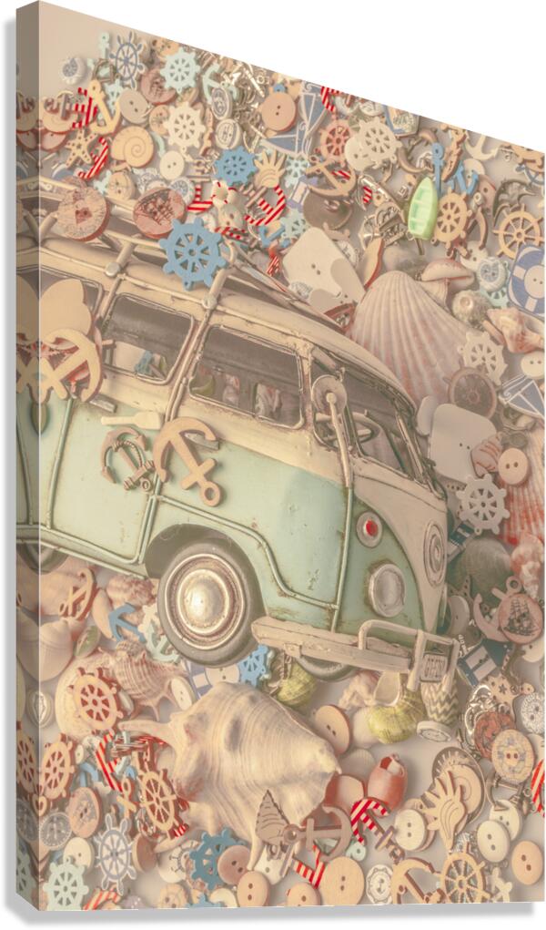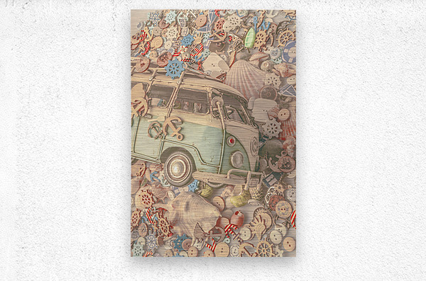 Nostalgic pastel still-life art on a retro tin surf van shore side on to a mix of oceanic icons