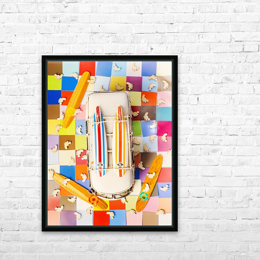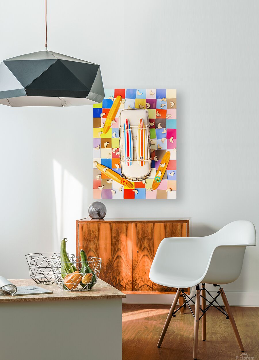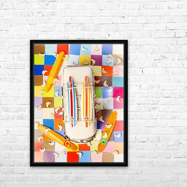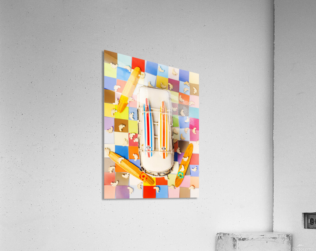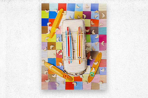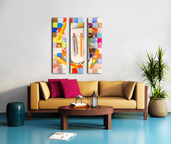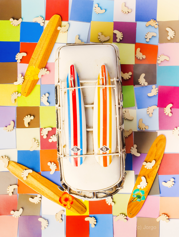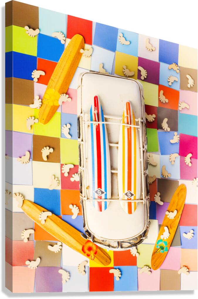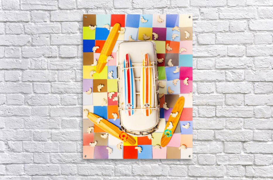 Vibrant surf scene with a boarding bus on a colourful tiling of coastal colors and wooden surfer feet