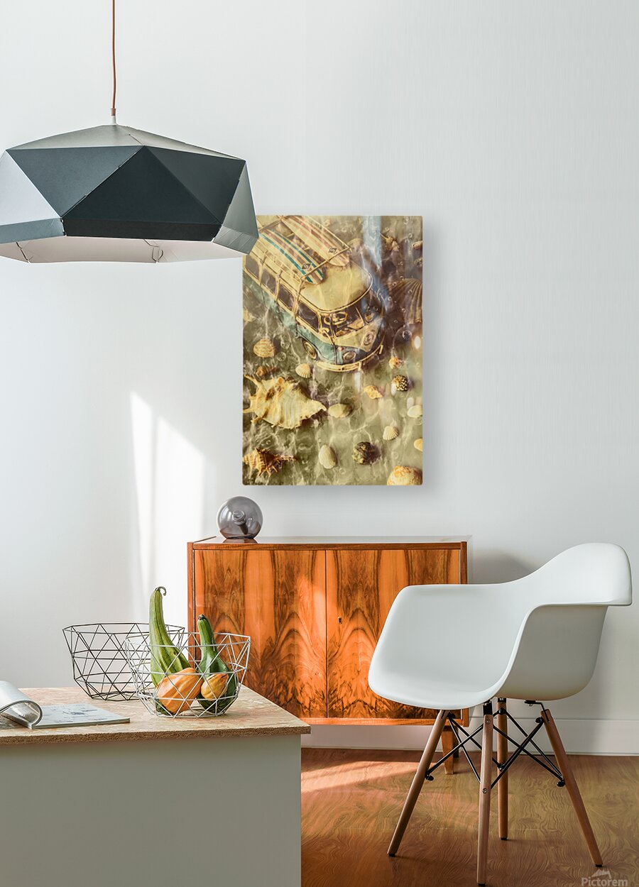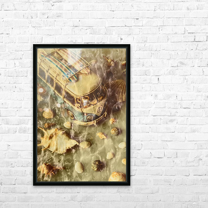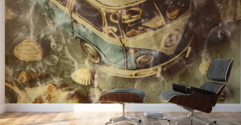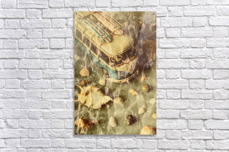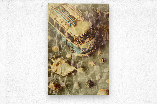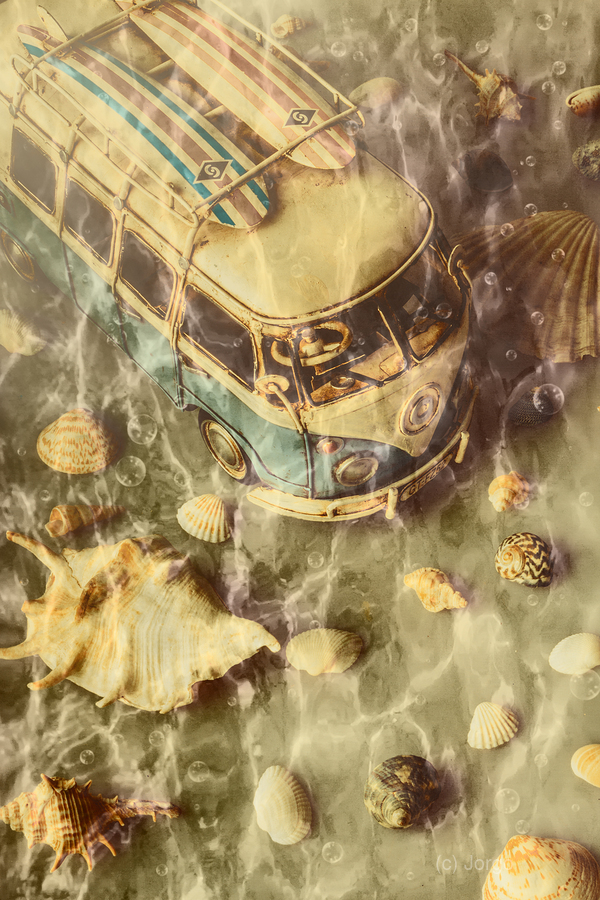 Creative beach scene of down under vans and crazy surf with shells and bubbles submerged
