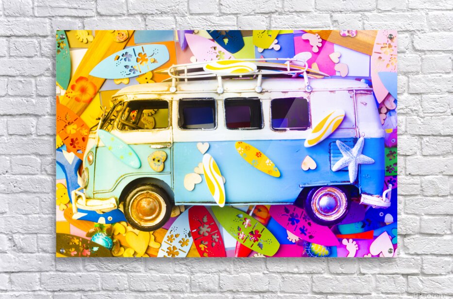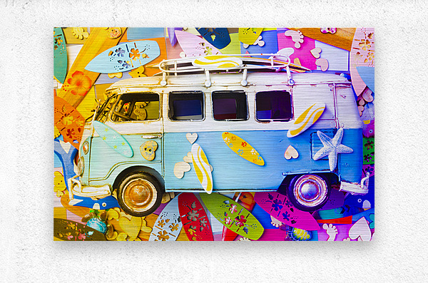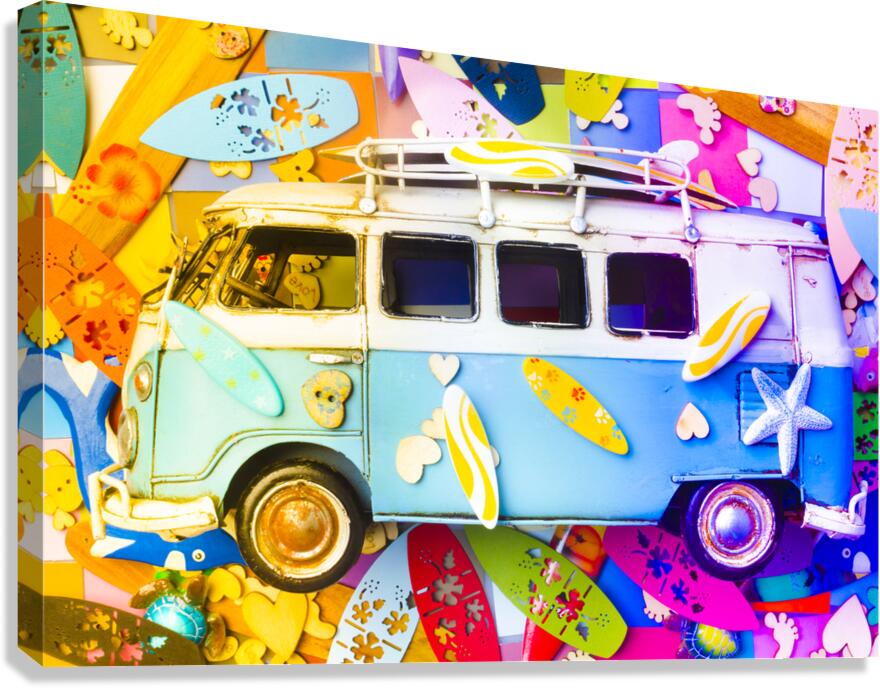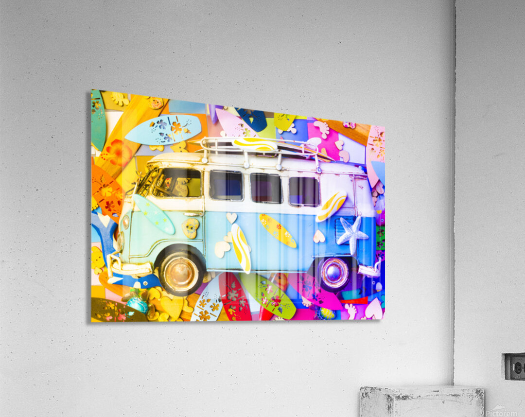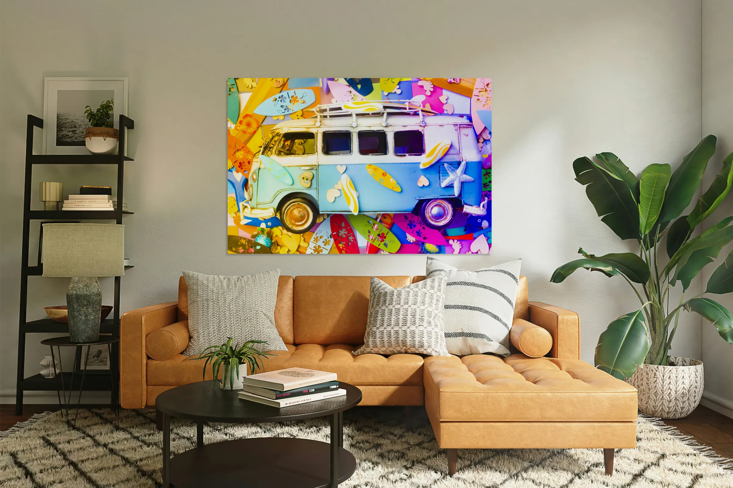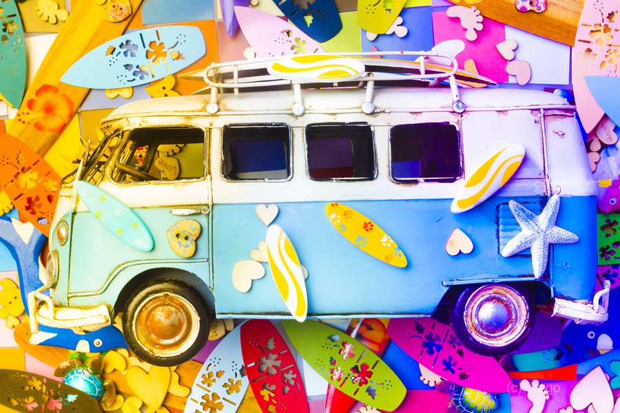 Psychedelic hippy art on a beach trip of colourful contemporaries with surf bus and beach play particulars