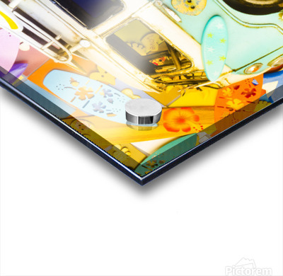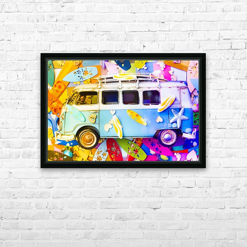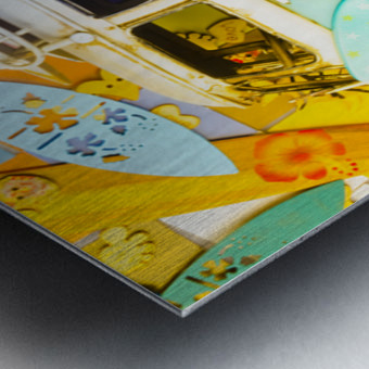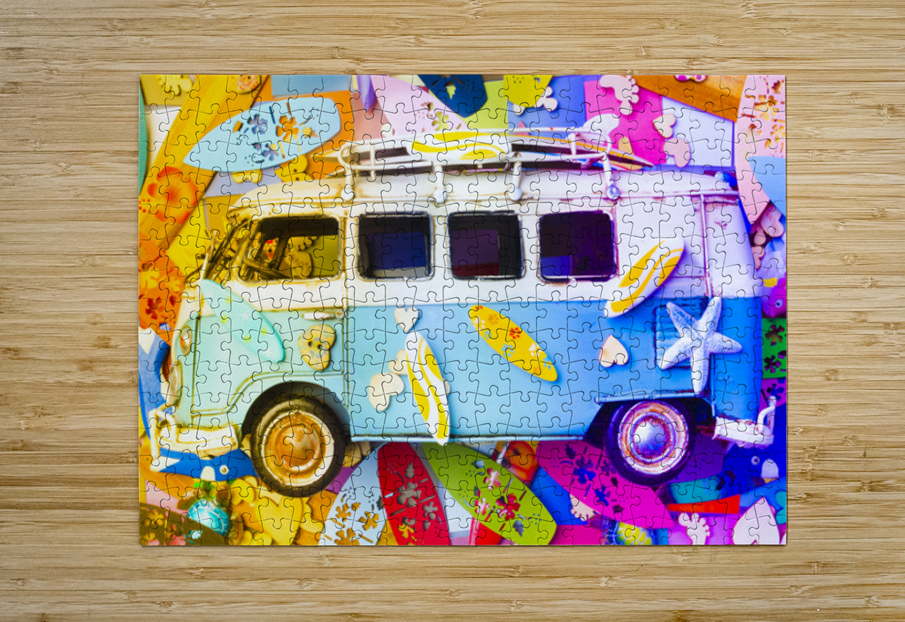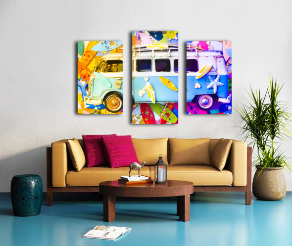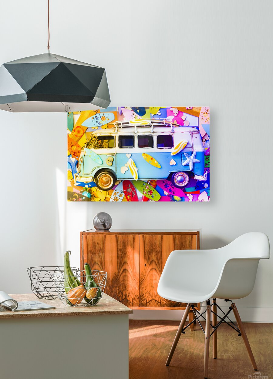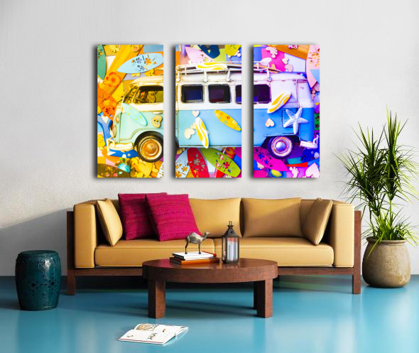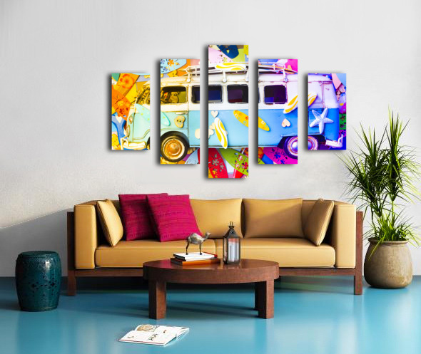 Psychedelic hippy art on a beach trip of colourful contemporaries with surf bus and beach play particulars
