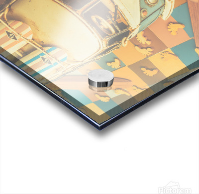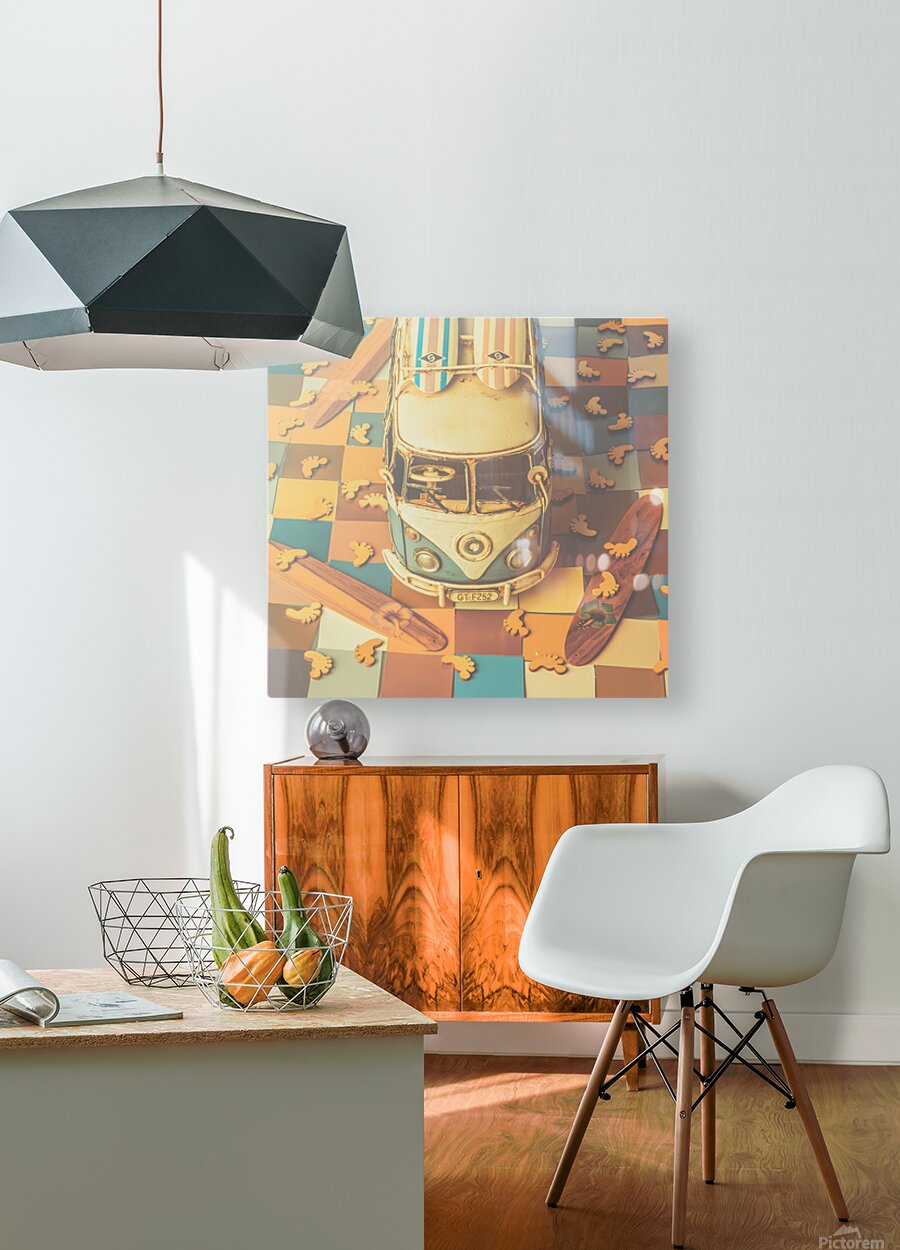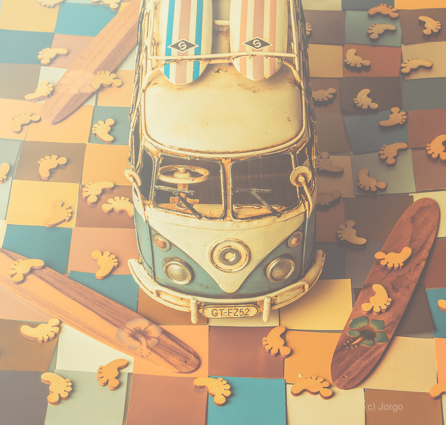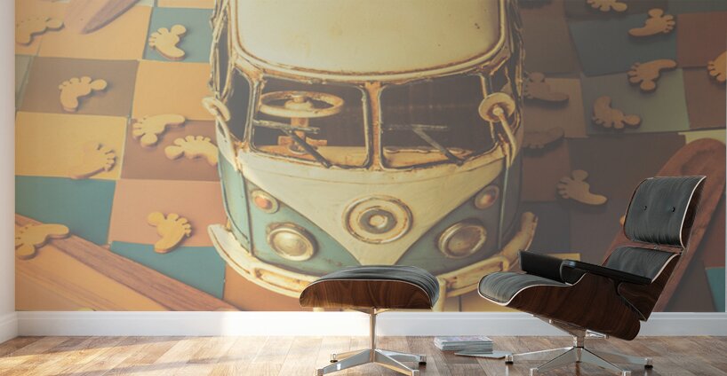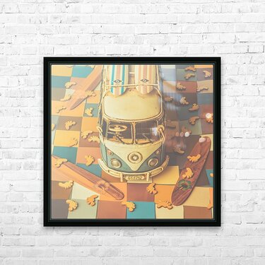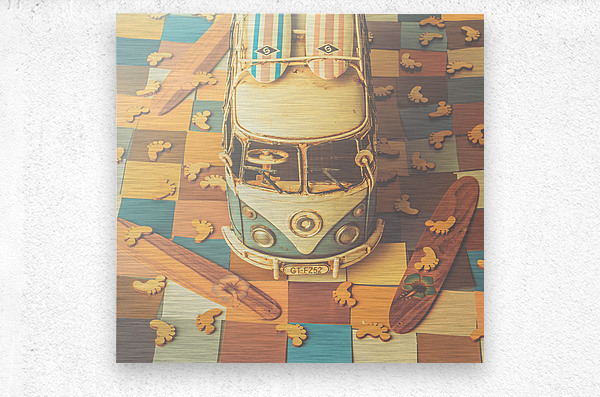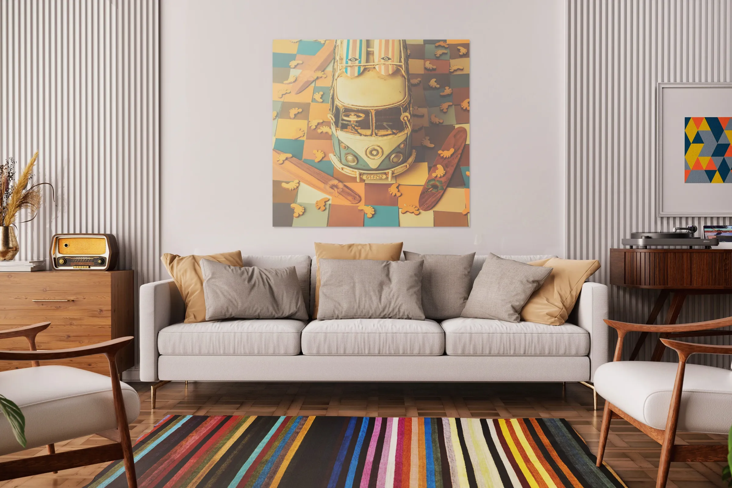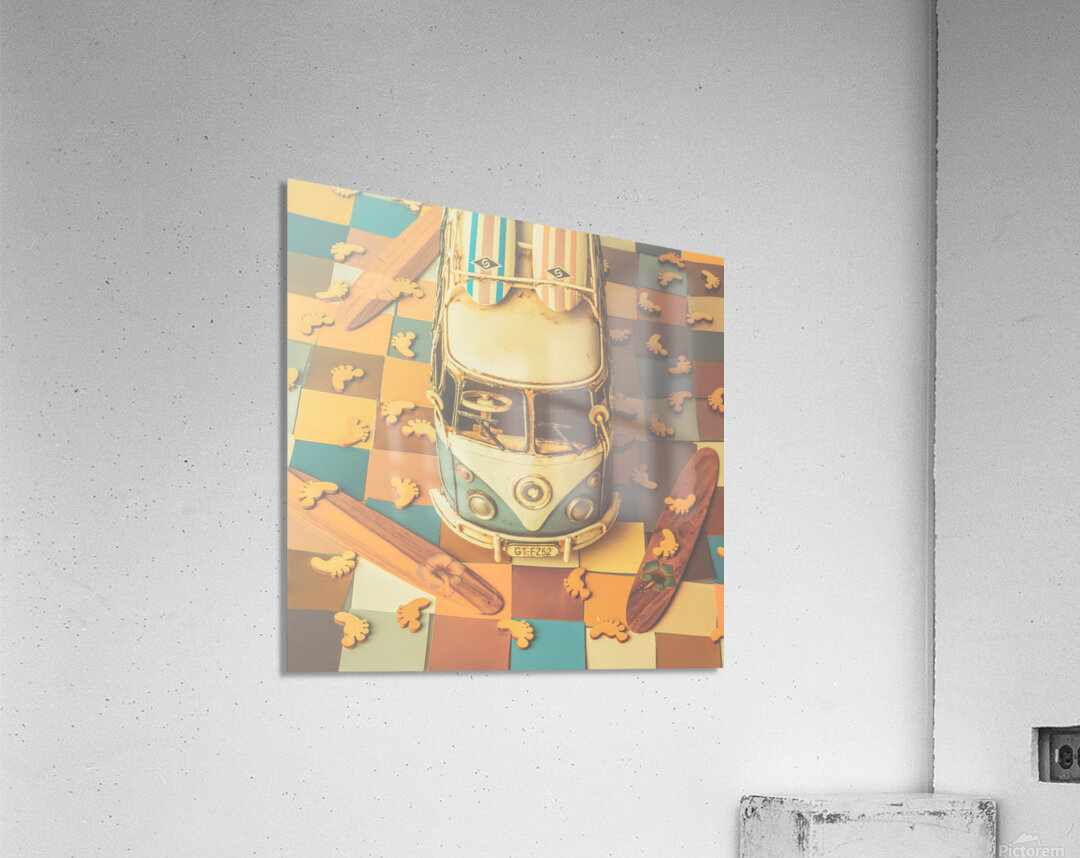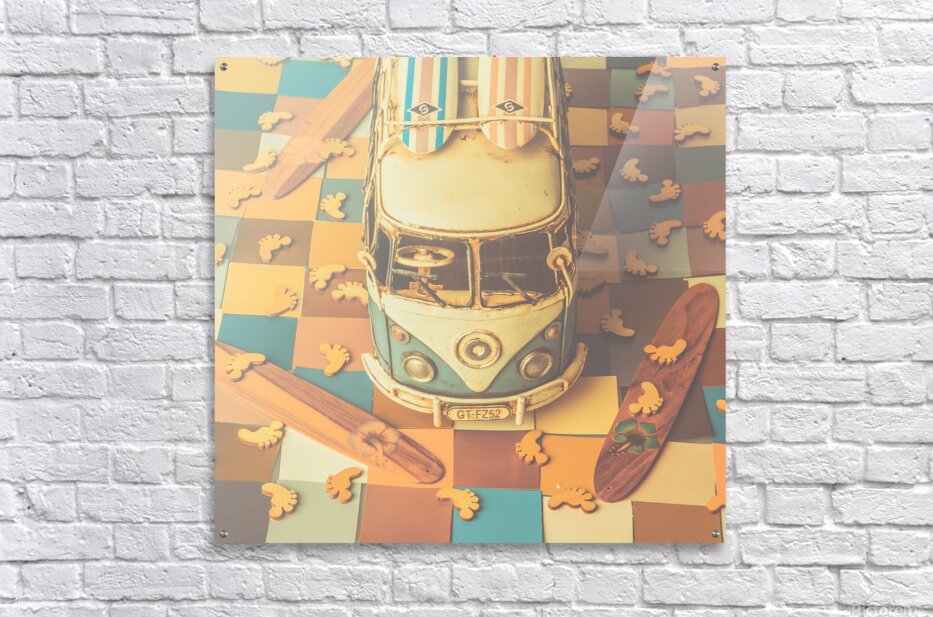 A colorful display captures summer vibes with a vintage van adorned with surfboards. Surrounding are playful footsteps reminiscent of a nostalgic beac...[+]