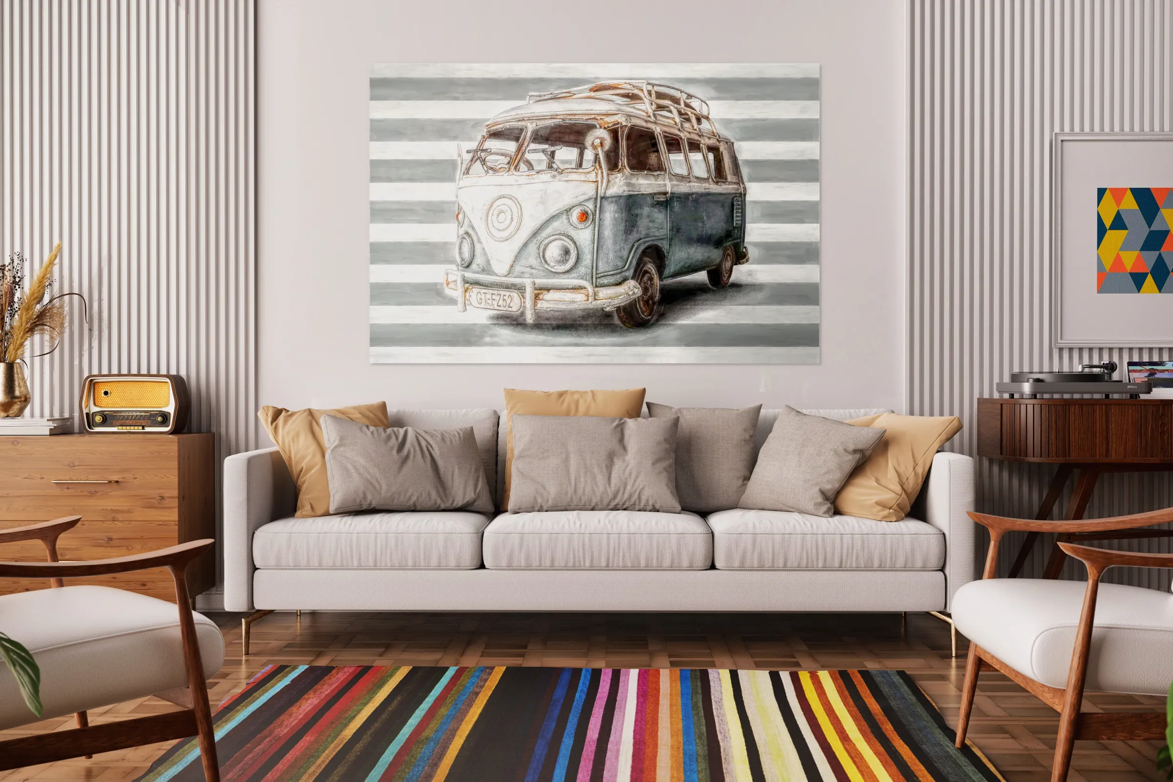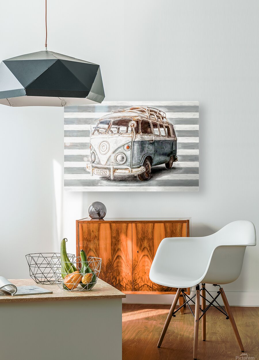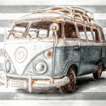 Retro beach stylised artwork of a blue surf camping van on striped background