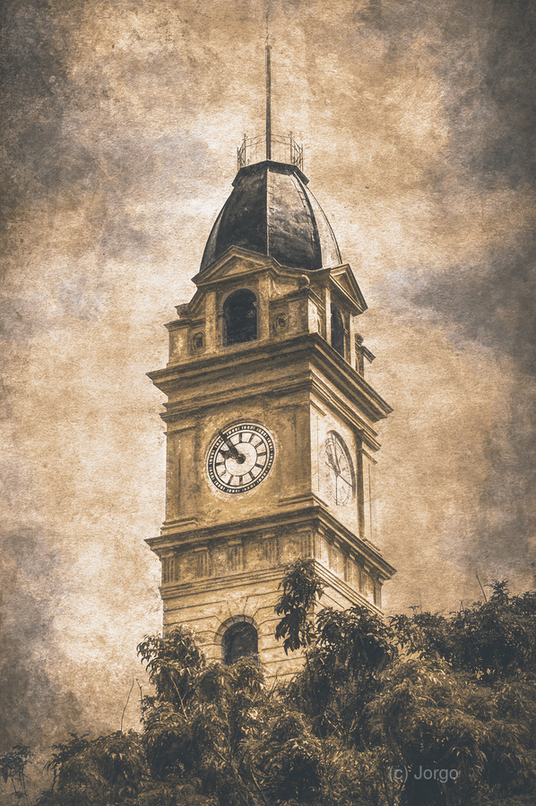Bundaberg Post Office Clock Tower reaches toward a textured sky. The aged facade is surrounded by lush foliage hinting at the warmth and history of Queensland Australia.