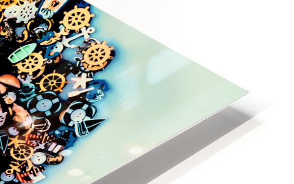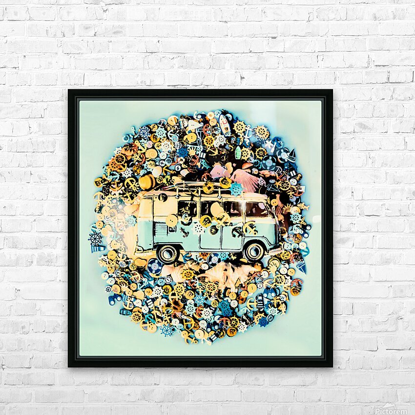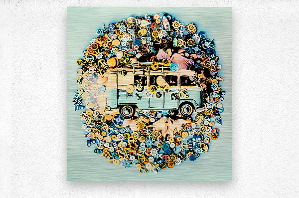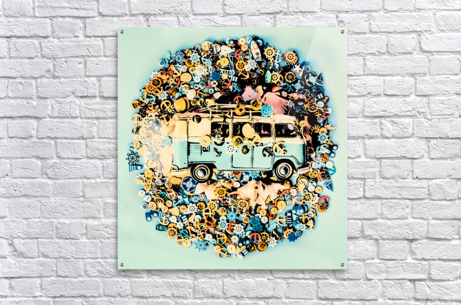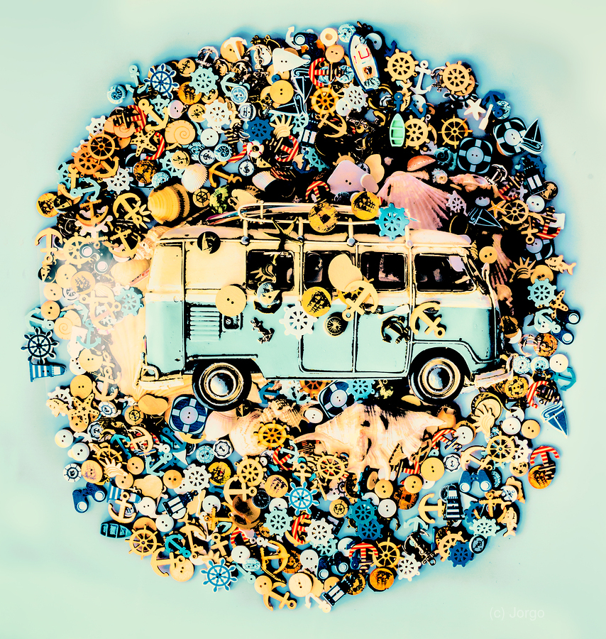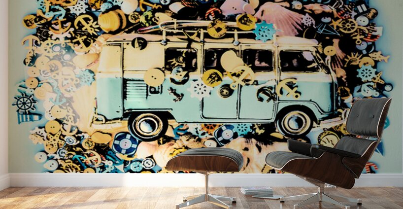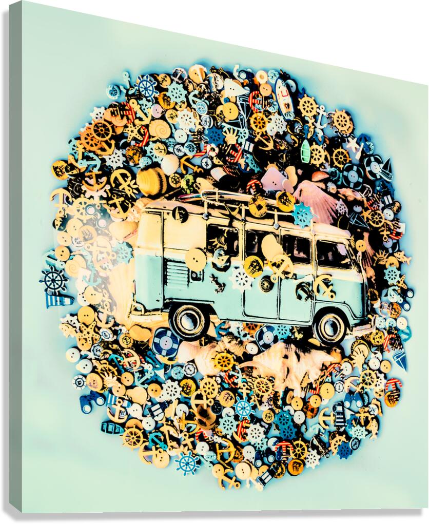 A round trip of beach fun with surf van and a abstract mix of marine travel buttons on retro aqua background