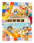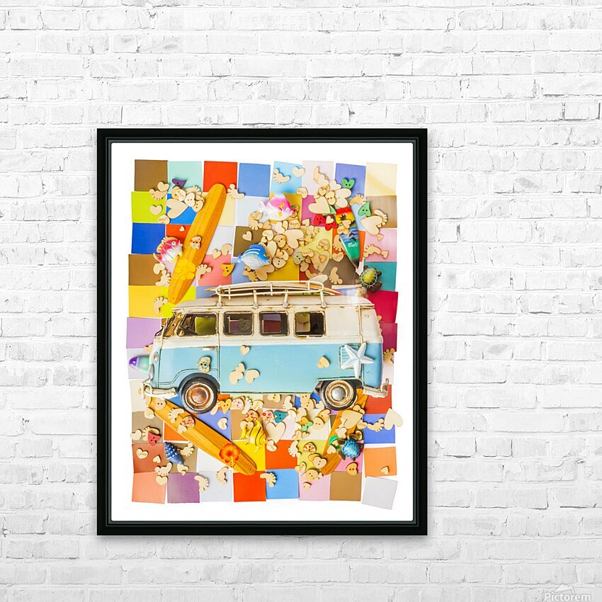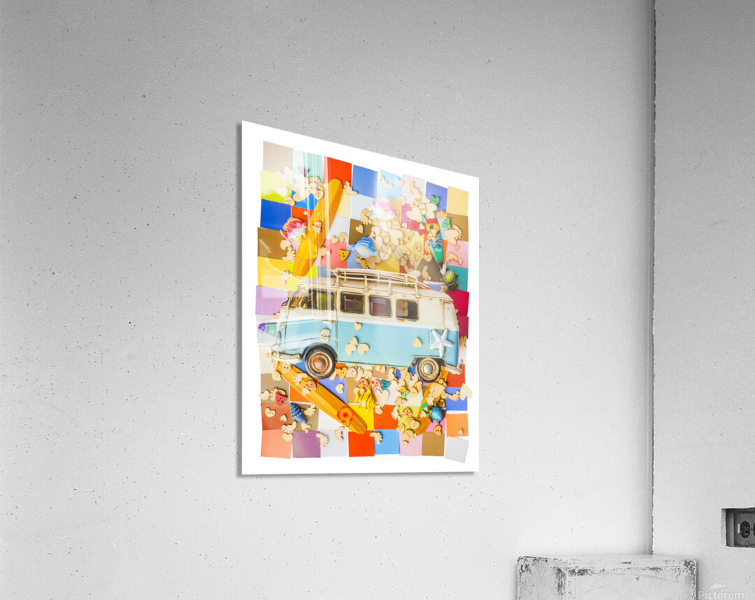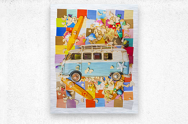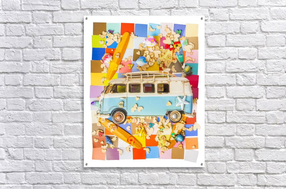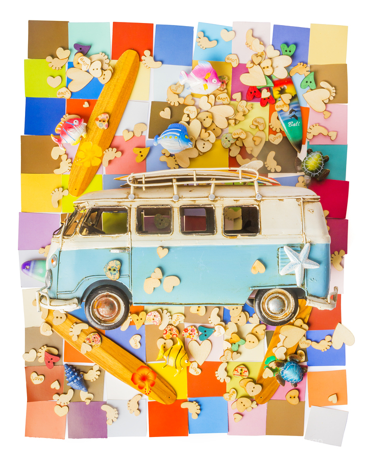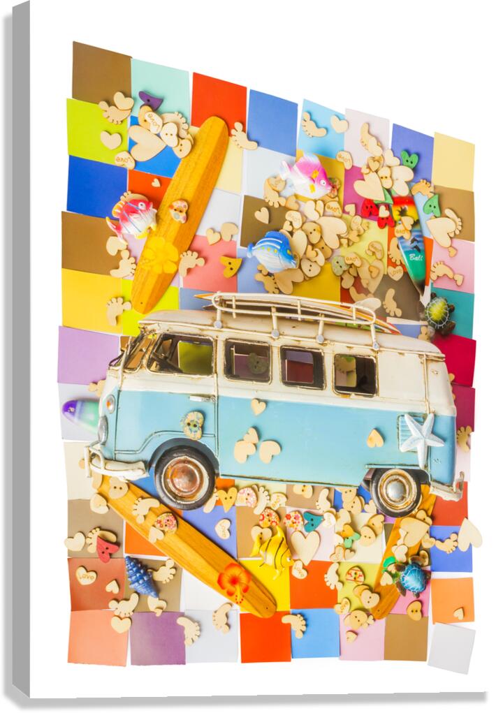 Contemporary coastal art in an abstract layout of hearts fish vans boards and blocks in modern styling