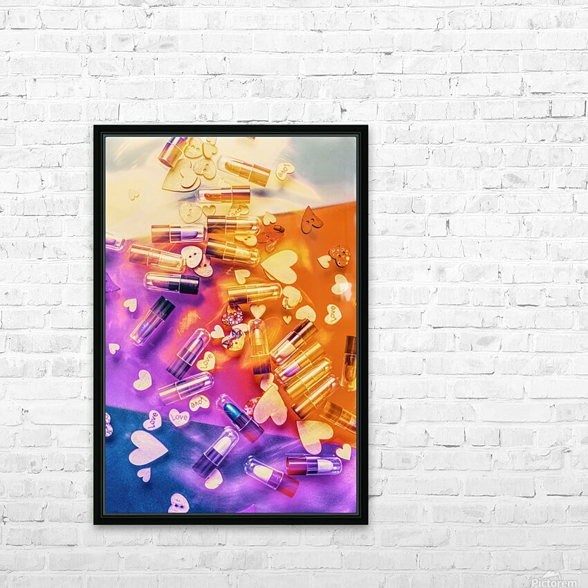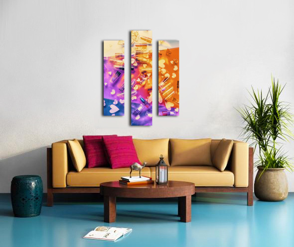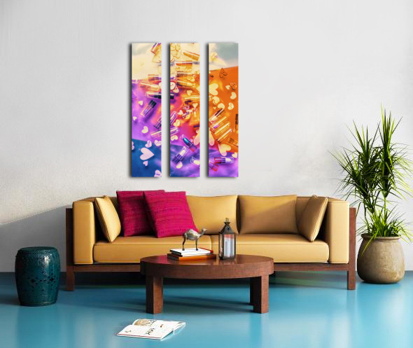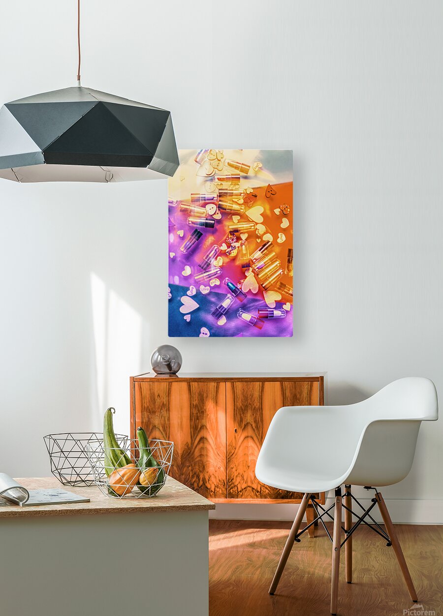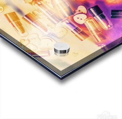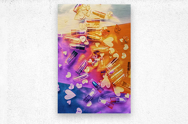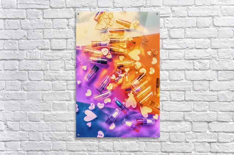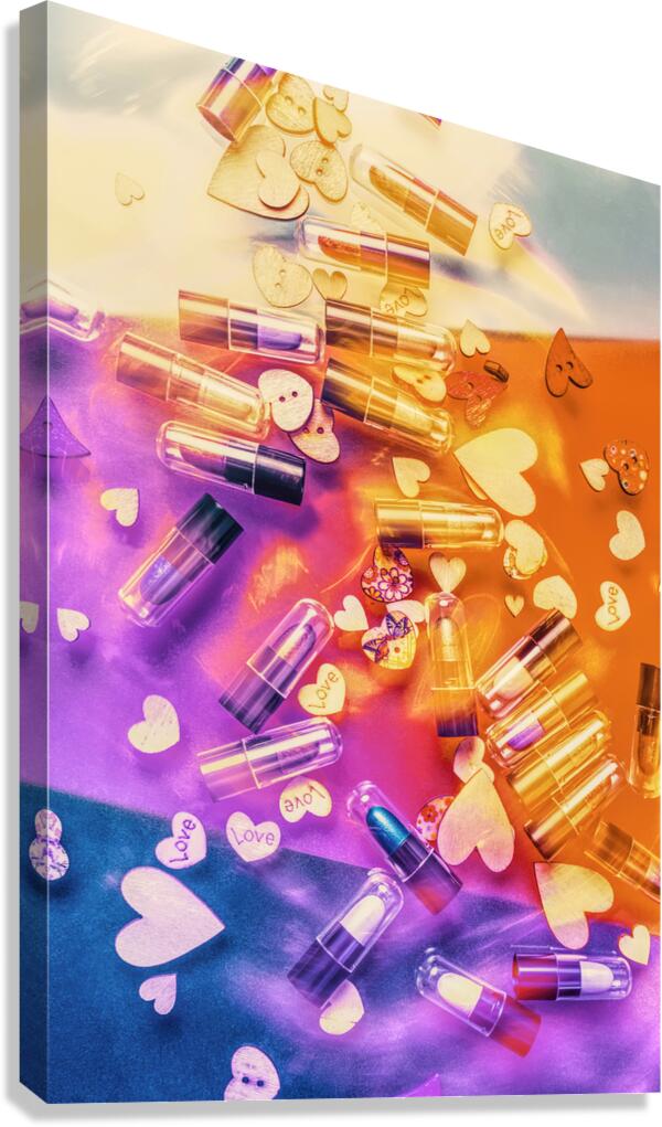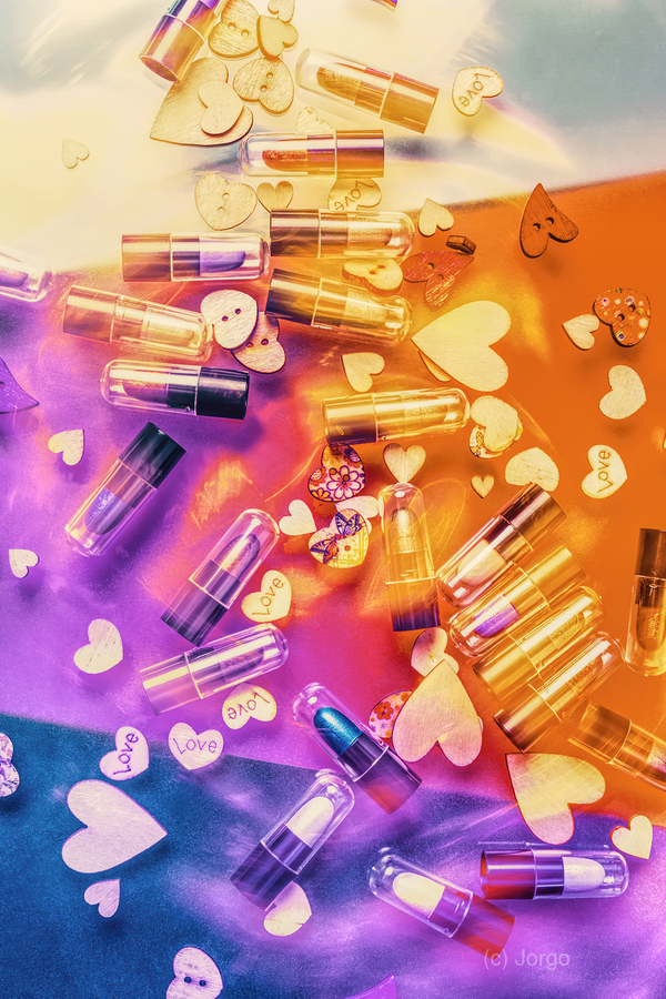 A pop art beauty parade of lipsticks and hearts unifying a color trend in dynamic makeup