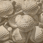 A gathering of golf balls and tees rests on the grass showcasing the wear and tear of golfing stories untold