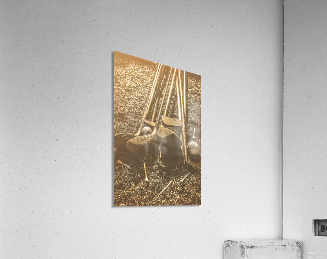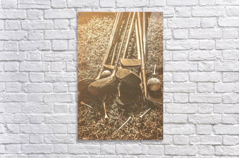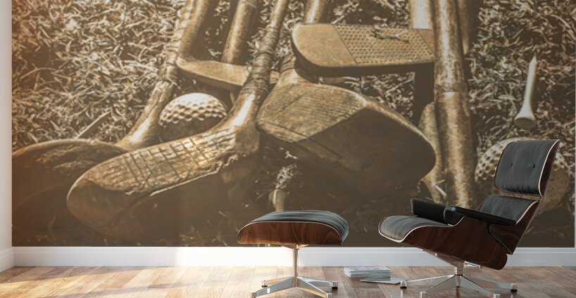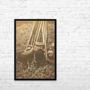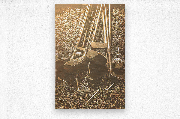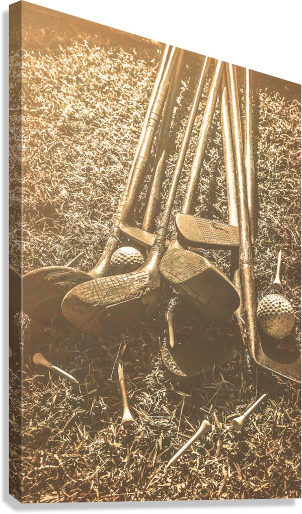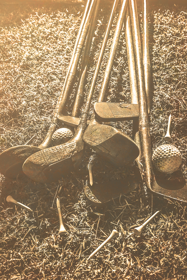 A collection of vintage golf clubs and balls lies scattered on a faded old sunlit fairway in a bygone sports still