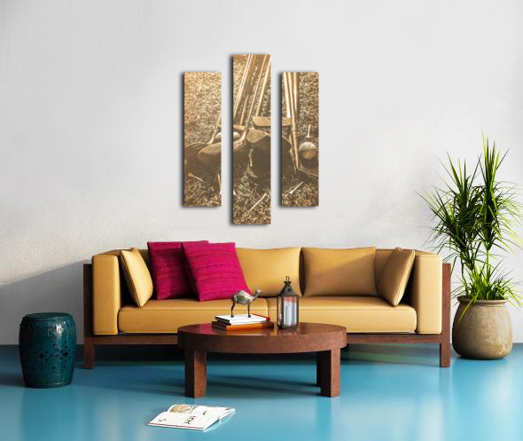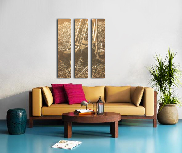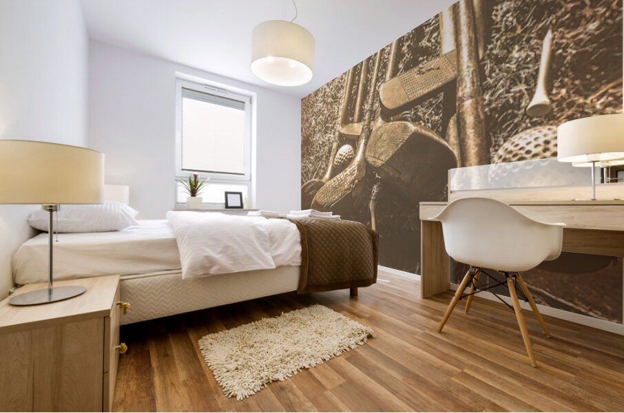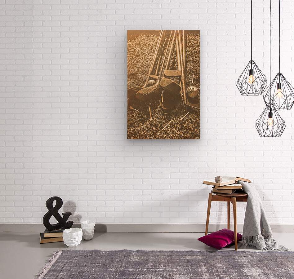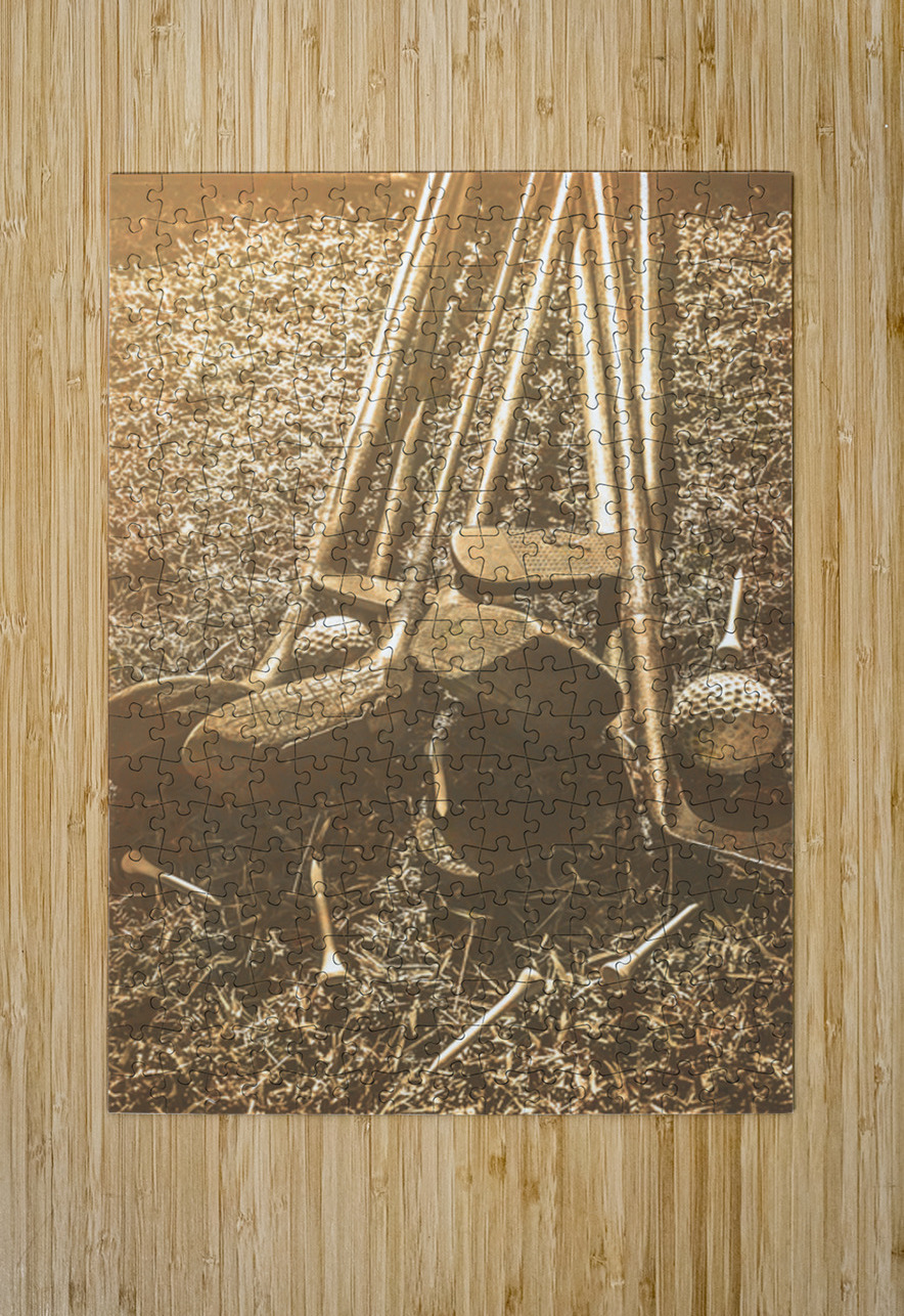 A collection of vintage golf clubs and balls lies scattered on a faded old sunlit fairway in a bygone sports still