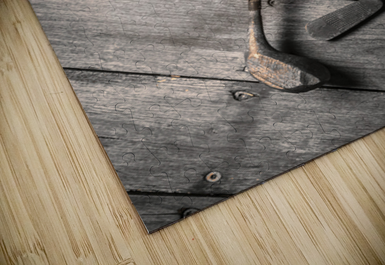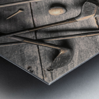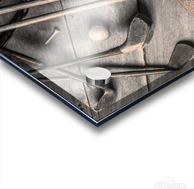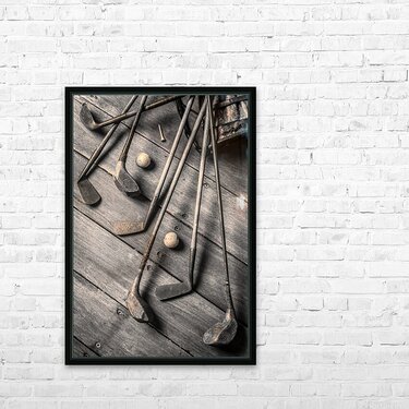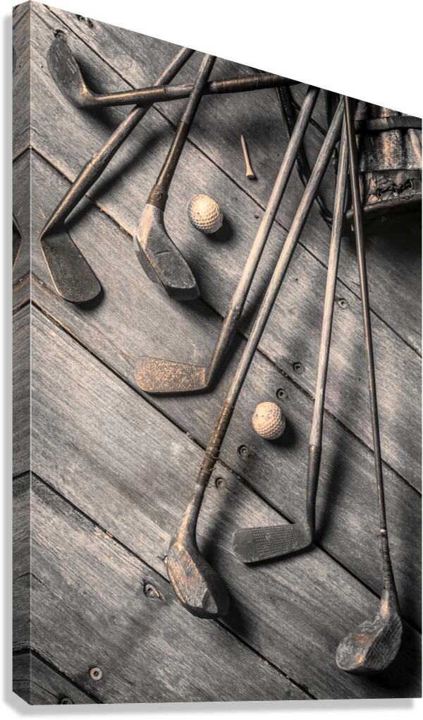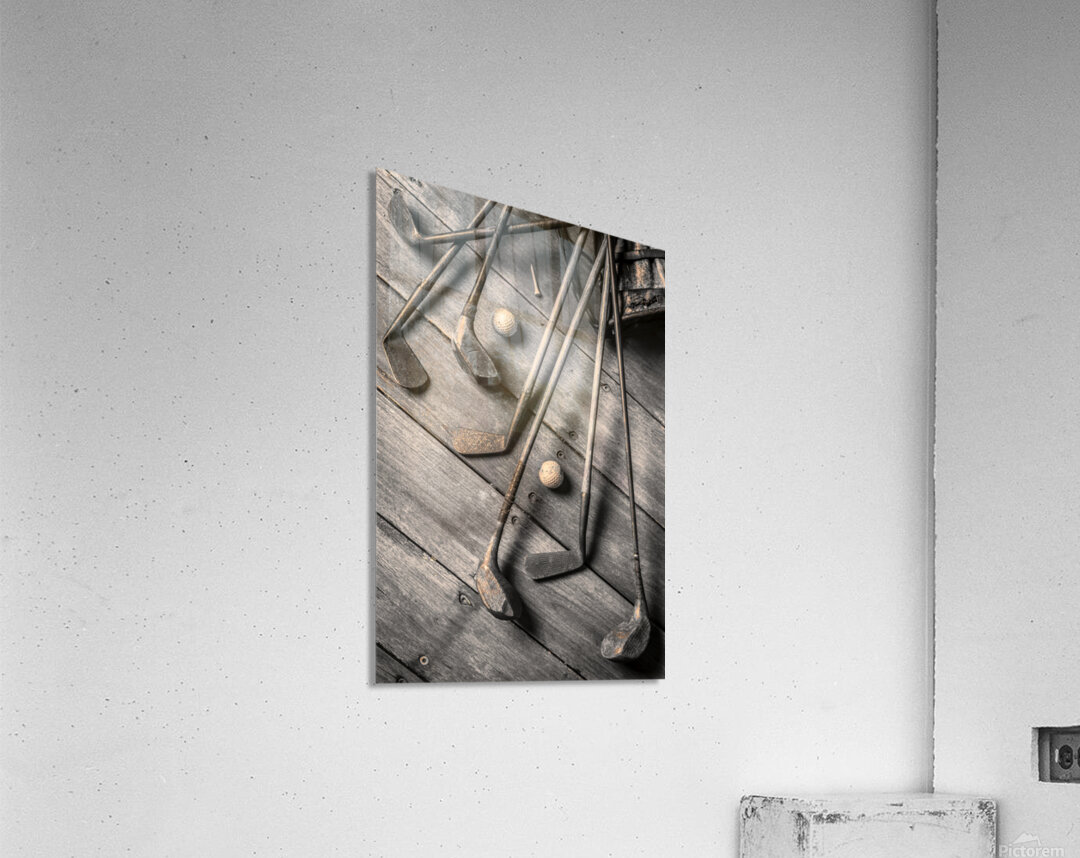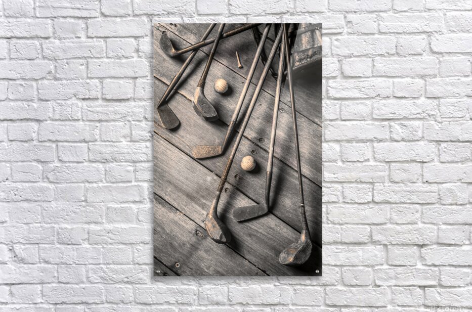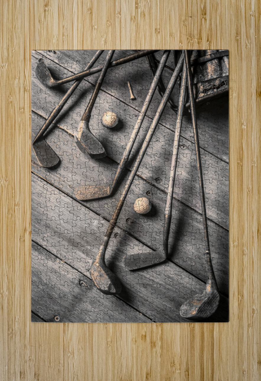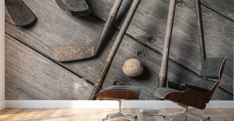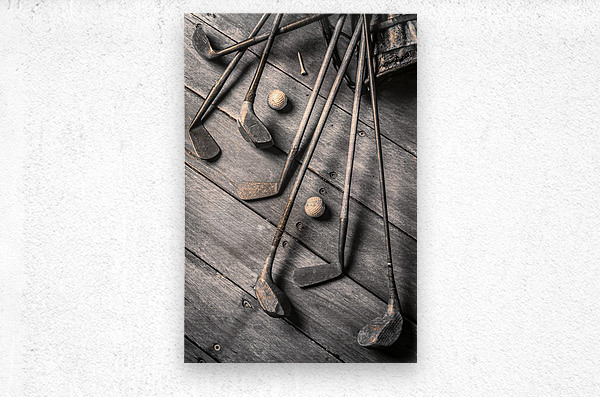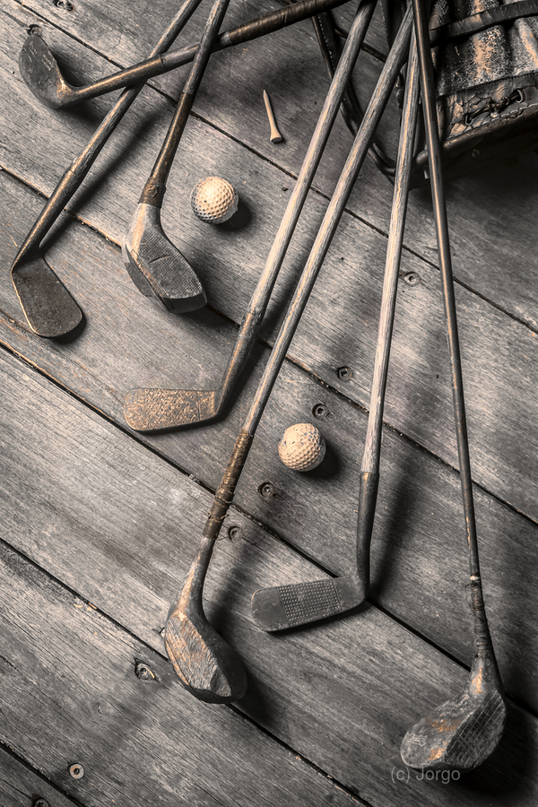 A golfing abstract with a scattering of classic clubhouse clubs in shadows and past play proclivities