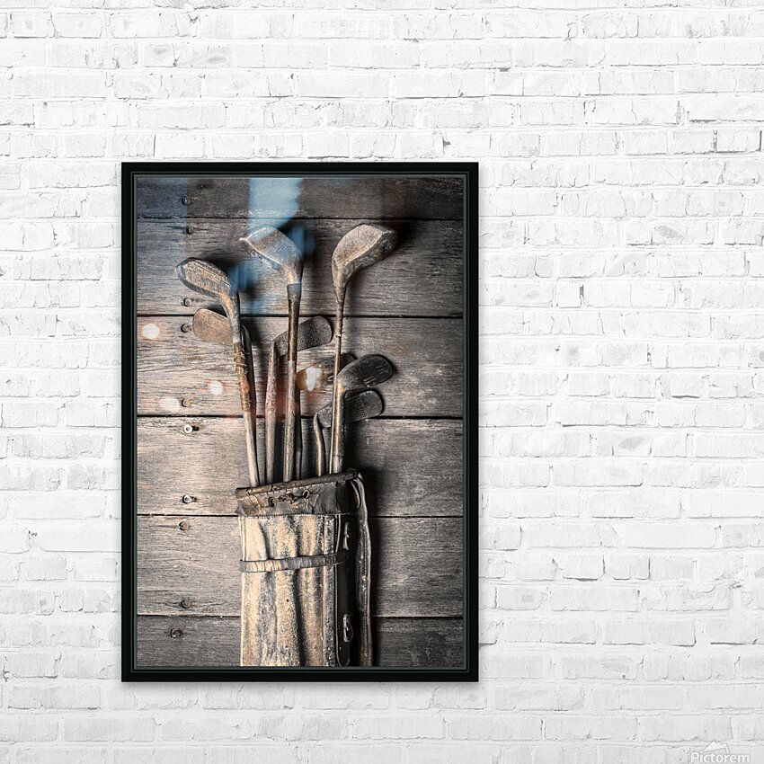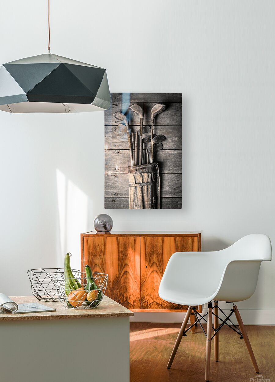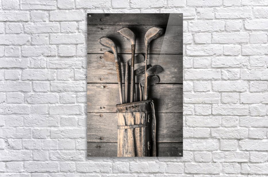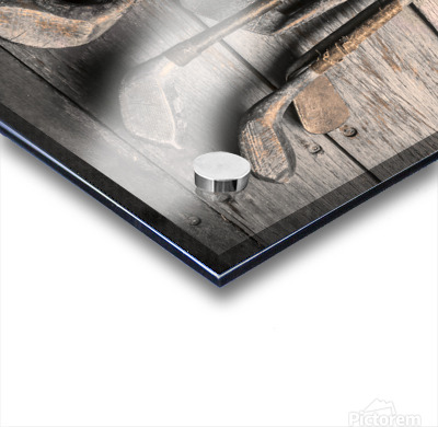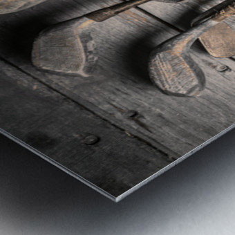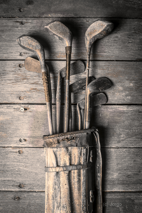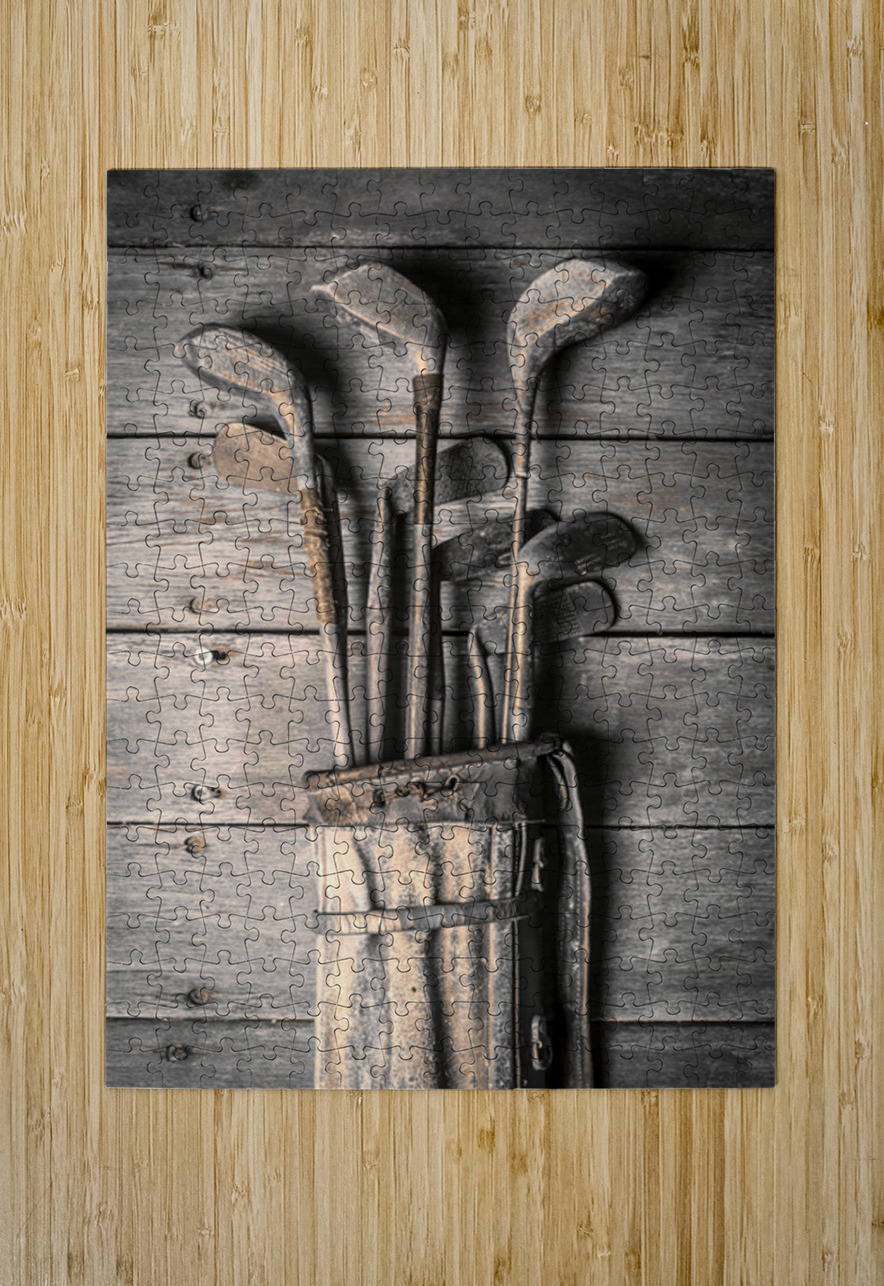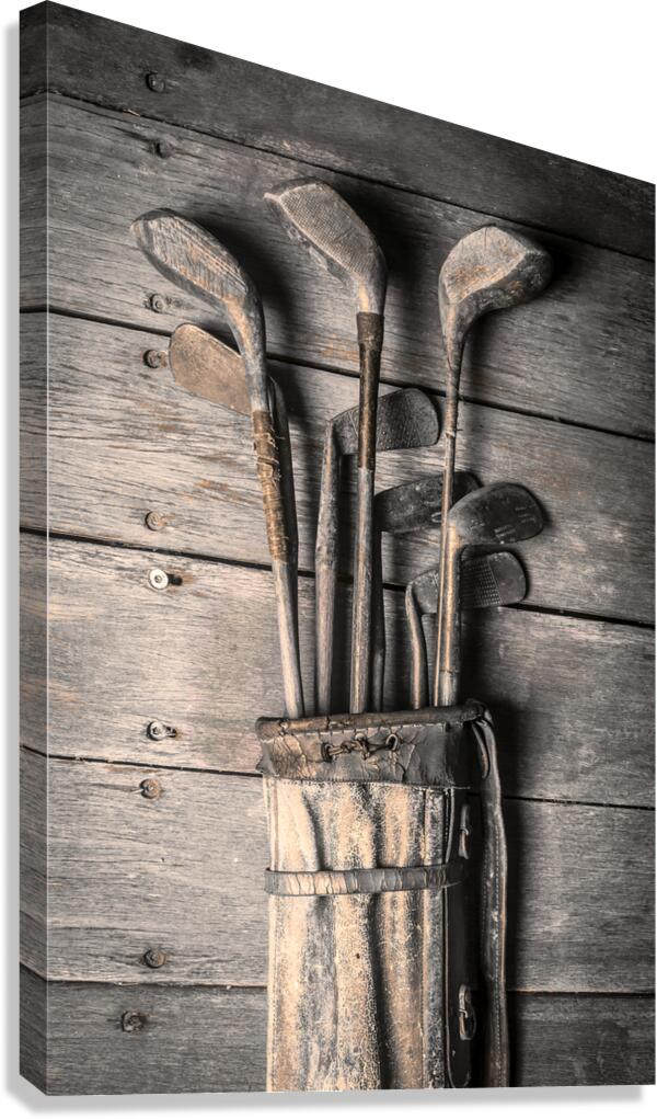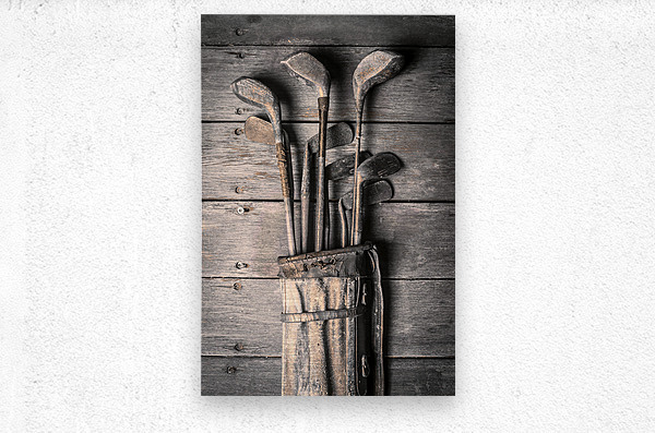 Faded fine art photography on a classic set of golf clubs placed in rustic tones on planks of musty heritage