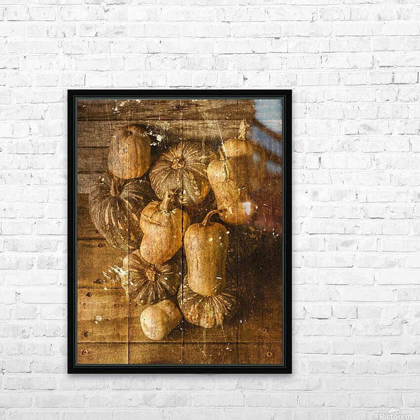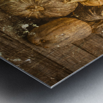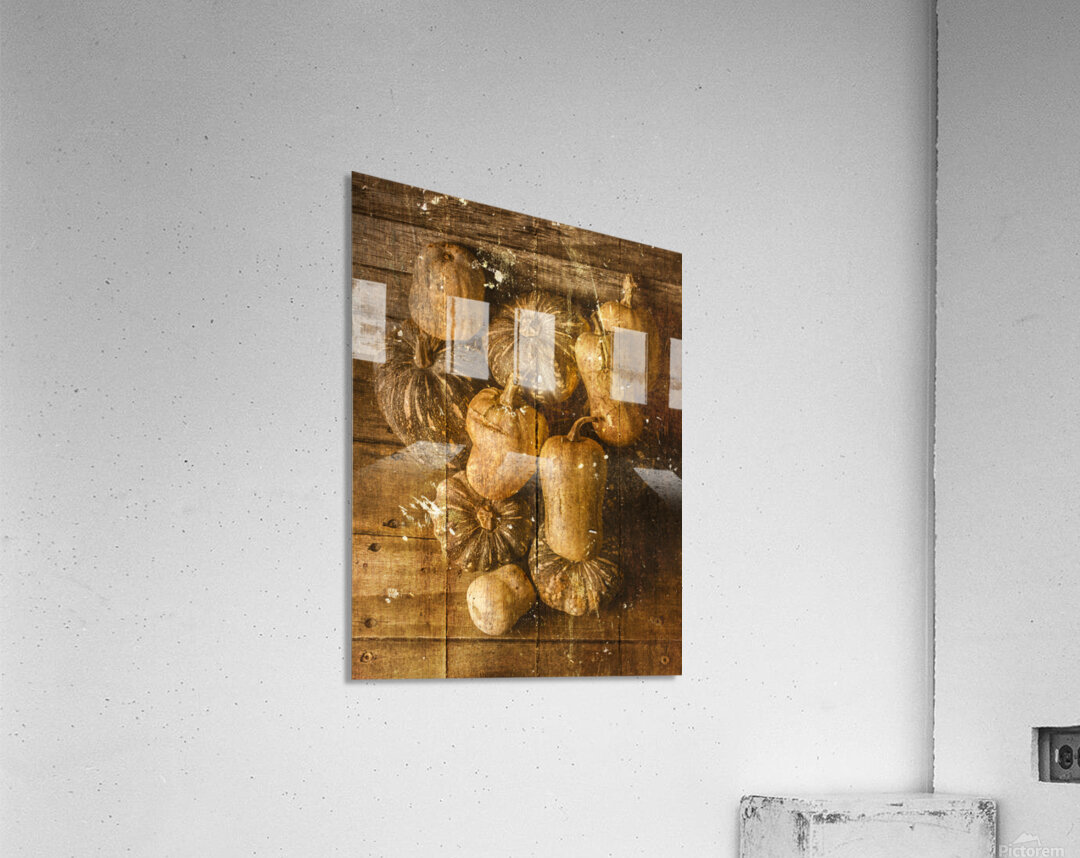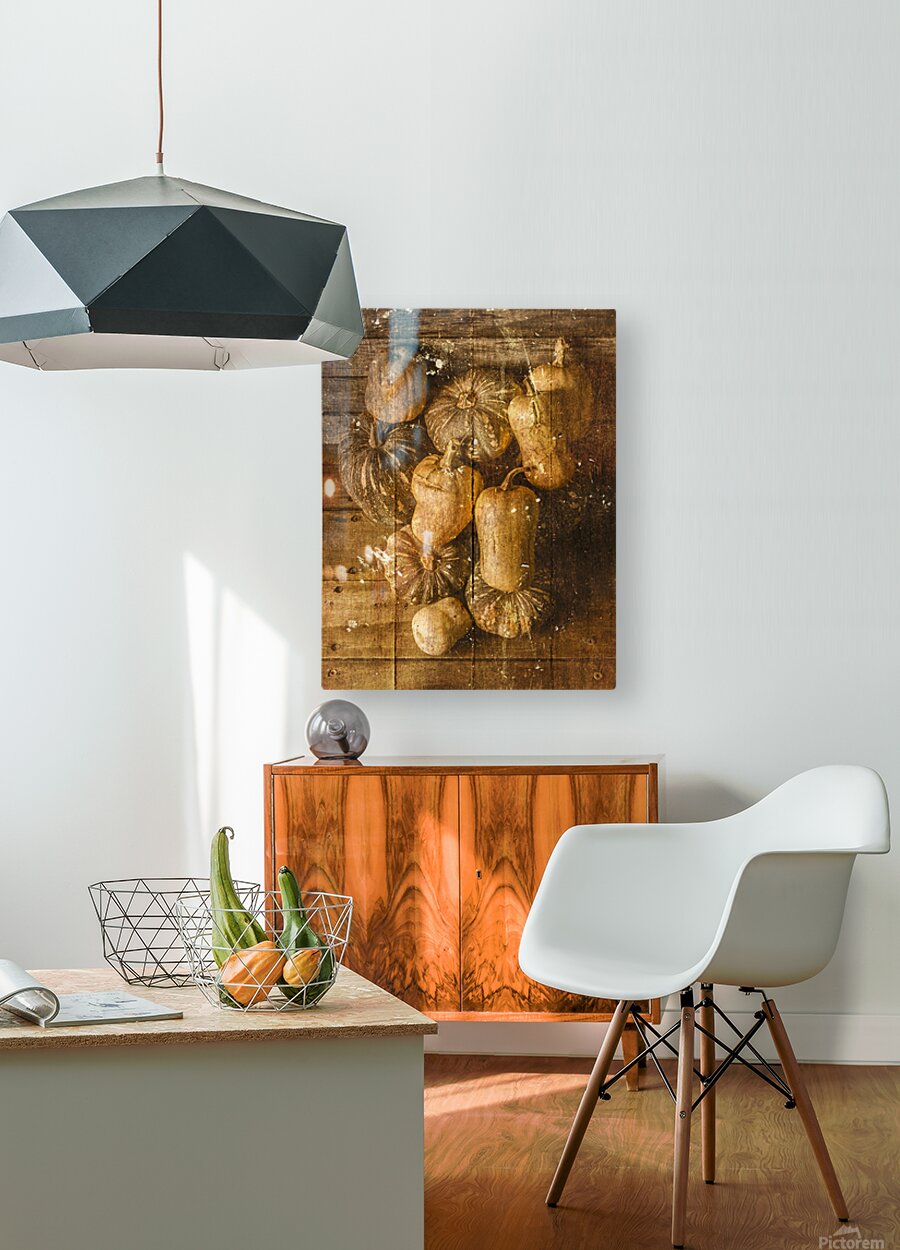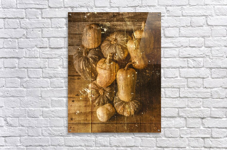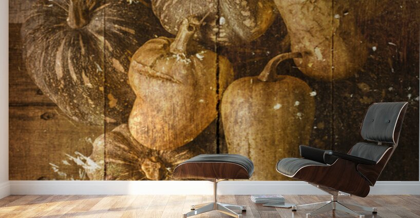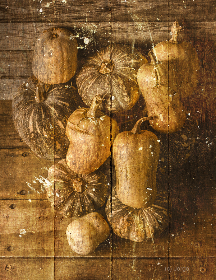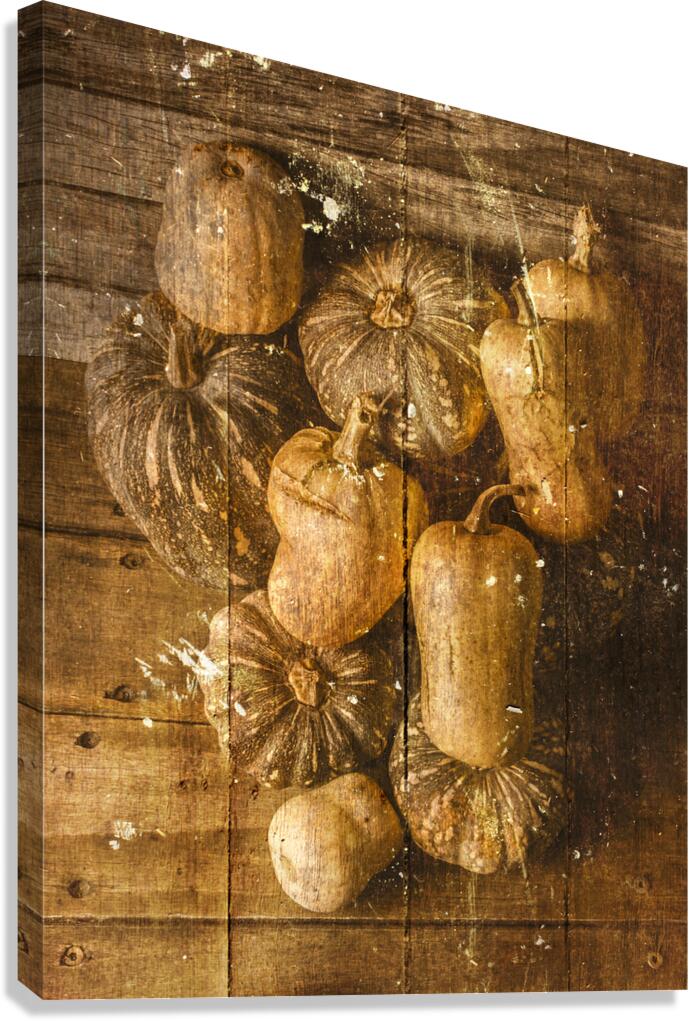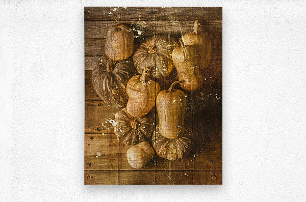 Weathered and worn still life photo on a classic patch of country pumpkins textured by rural styled wooden boards