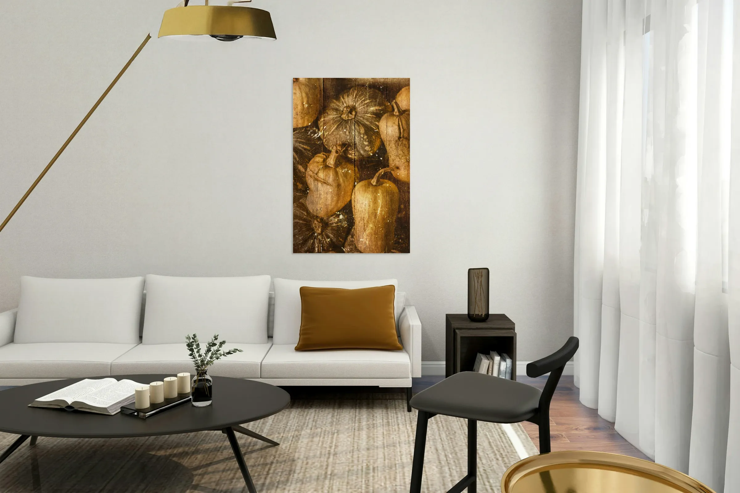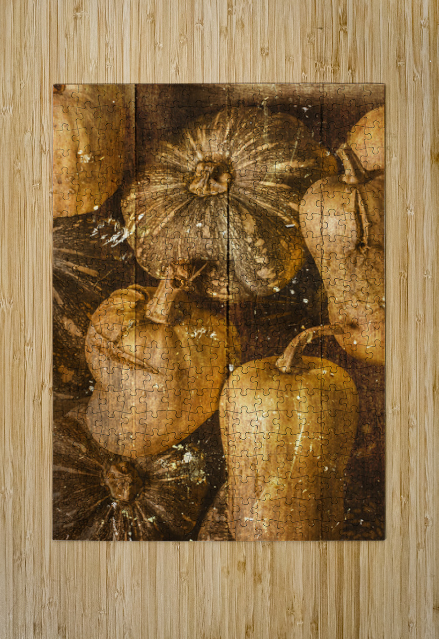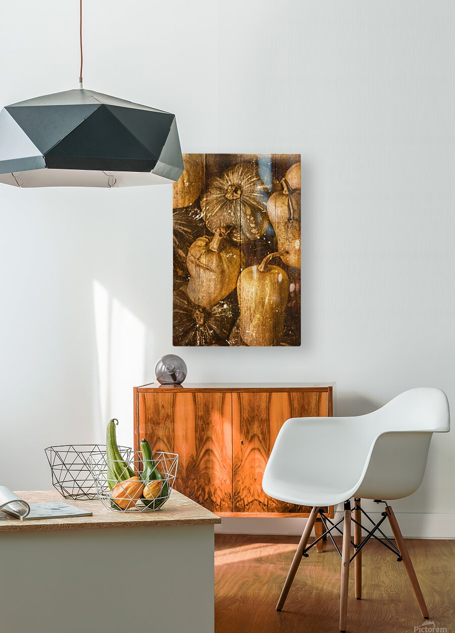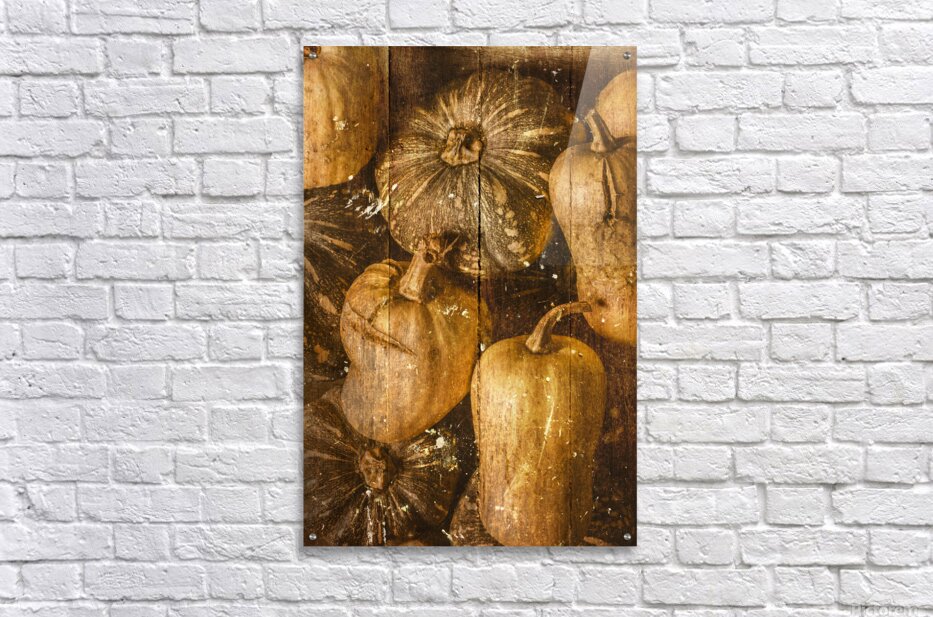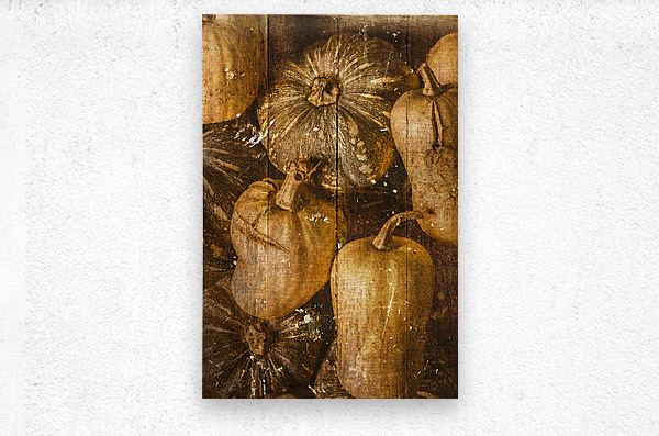 A classic old scene of kent pumpkins and butternut squash with vintage food patch in antique weatherboard style