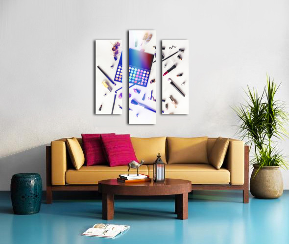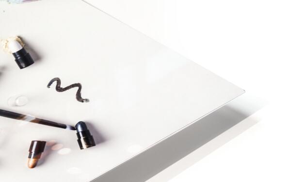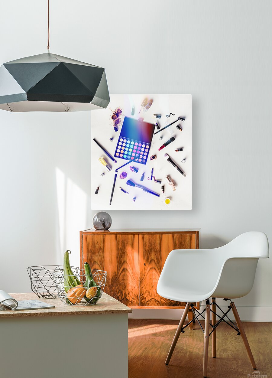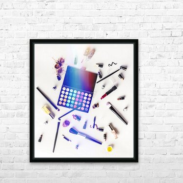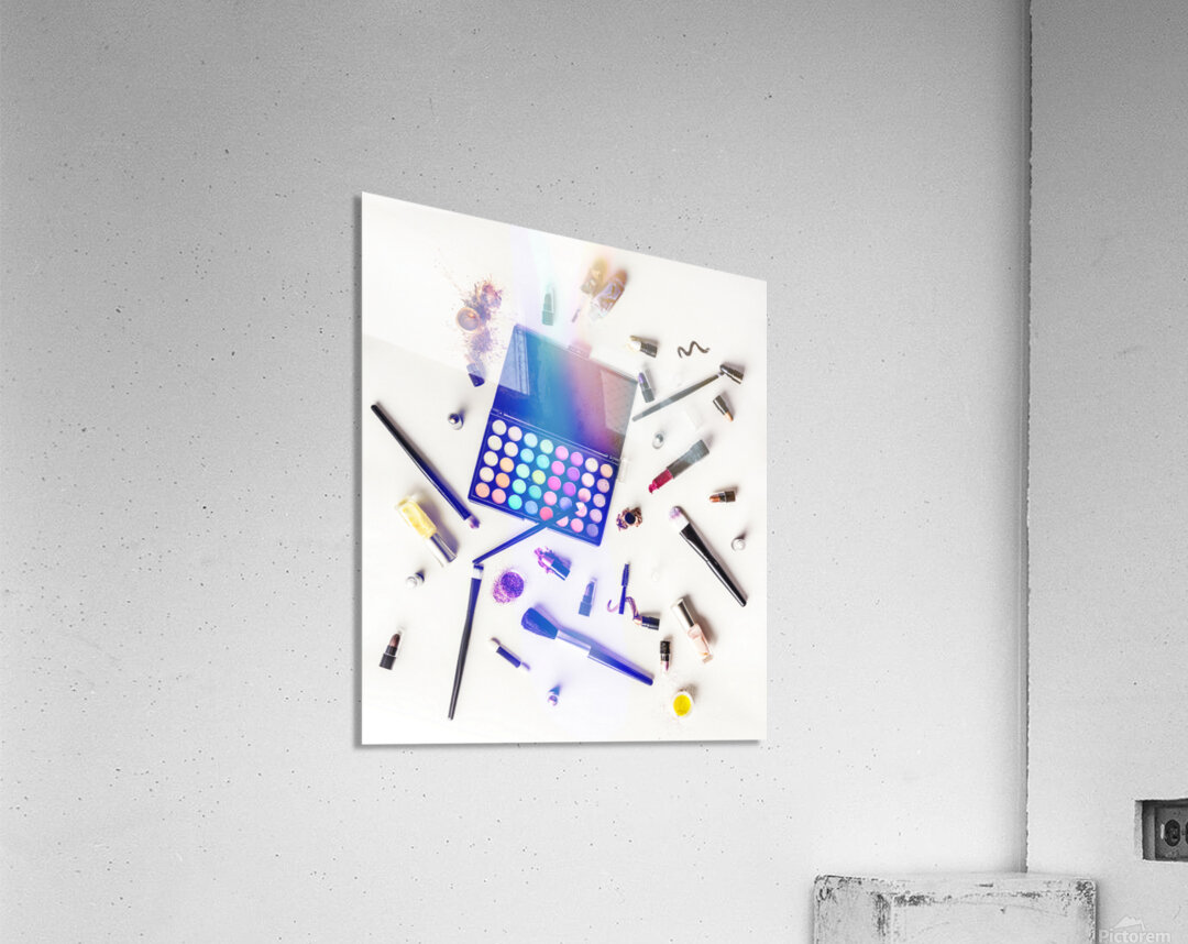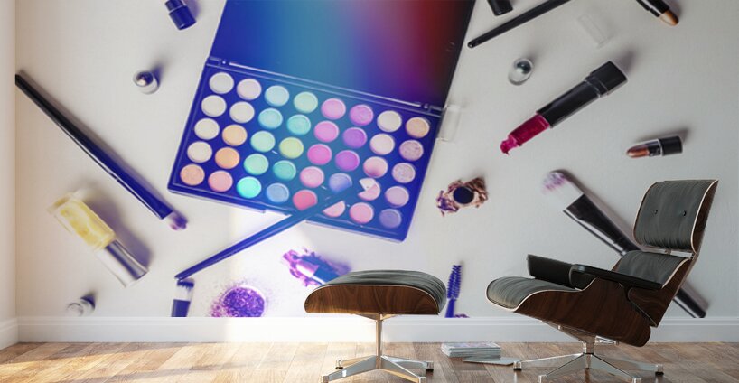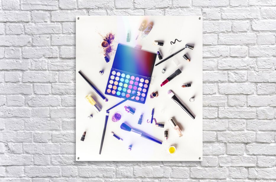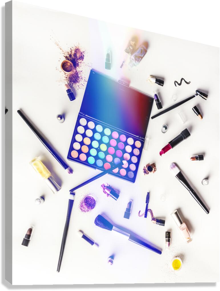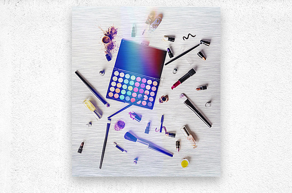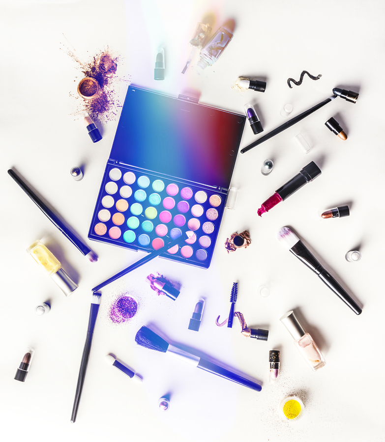 Reflecting contemporary artistry and personal style a sprawling mass of colorful cosmetics lay mixed up on studio white