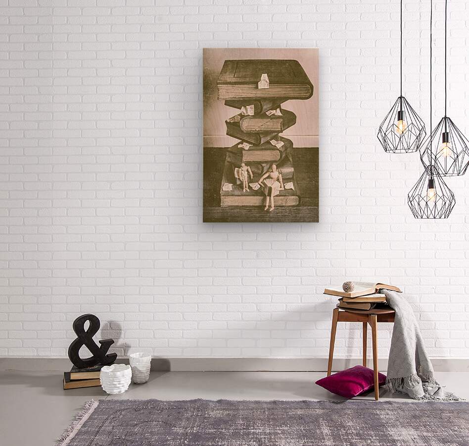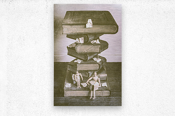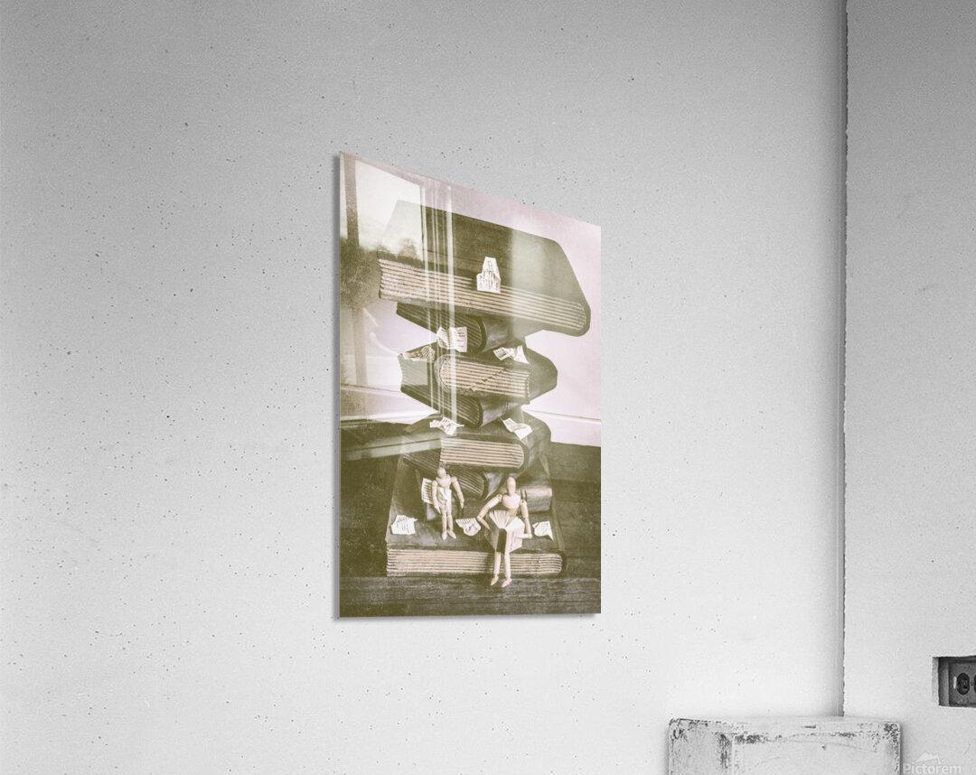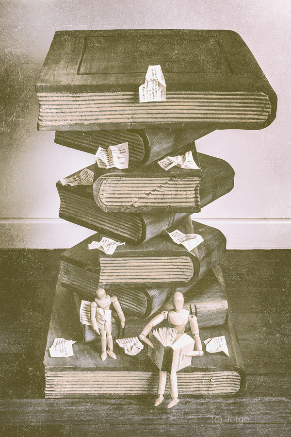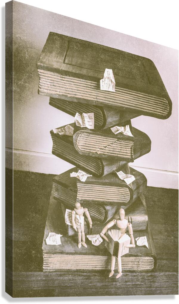 Vintage still-life of old fantasy and vintage discovery as a stacked stand of books gives read to toys and stories of historic design