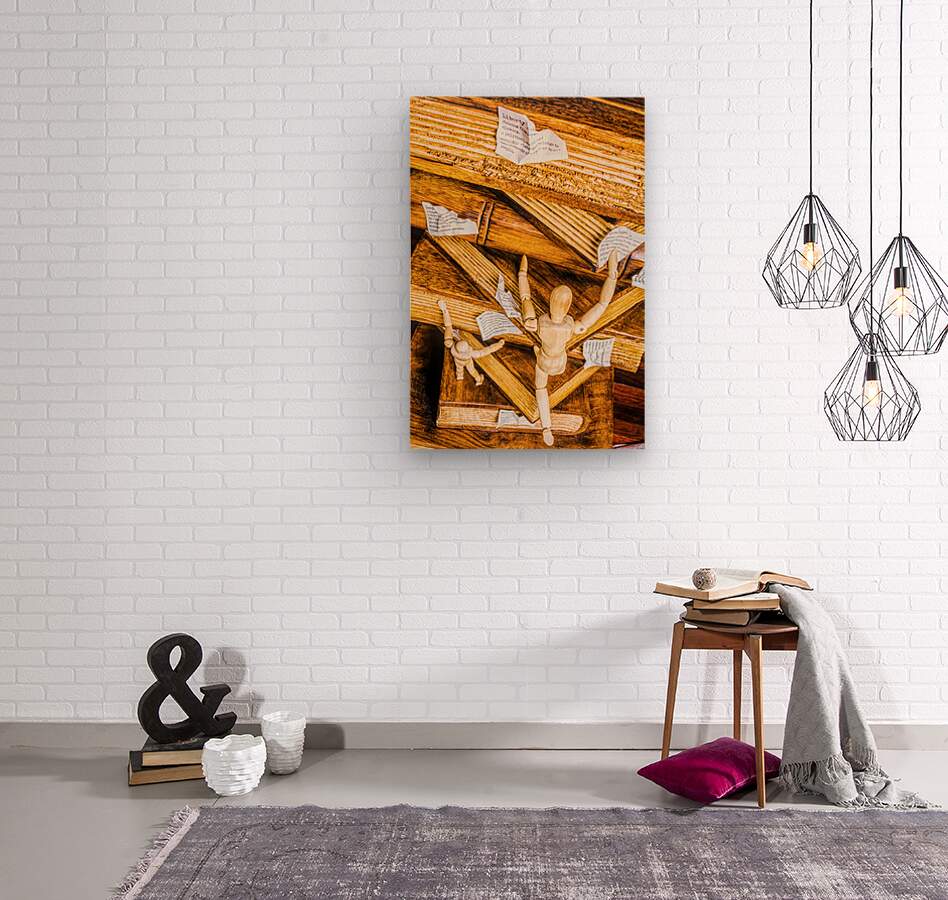 A played out scene many stories high as wooden toy figures take flight from knowledge unbounded trekking up a novel staircases in a release of the mind