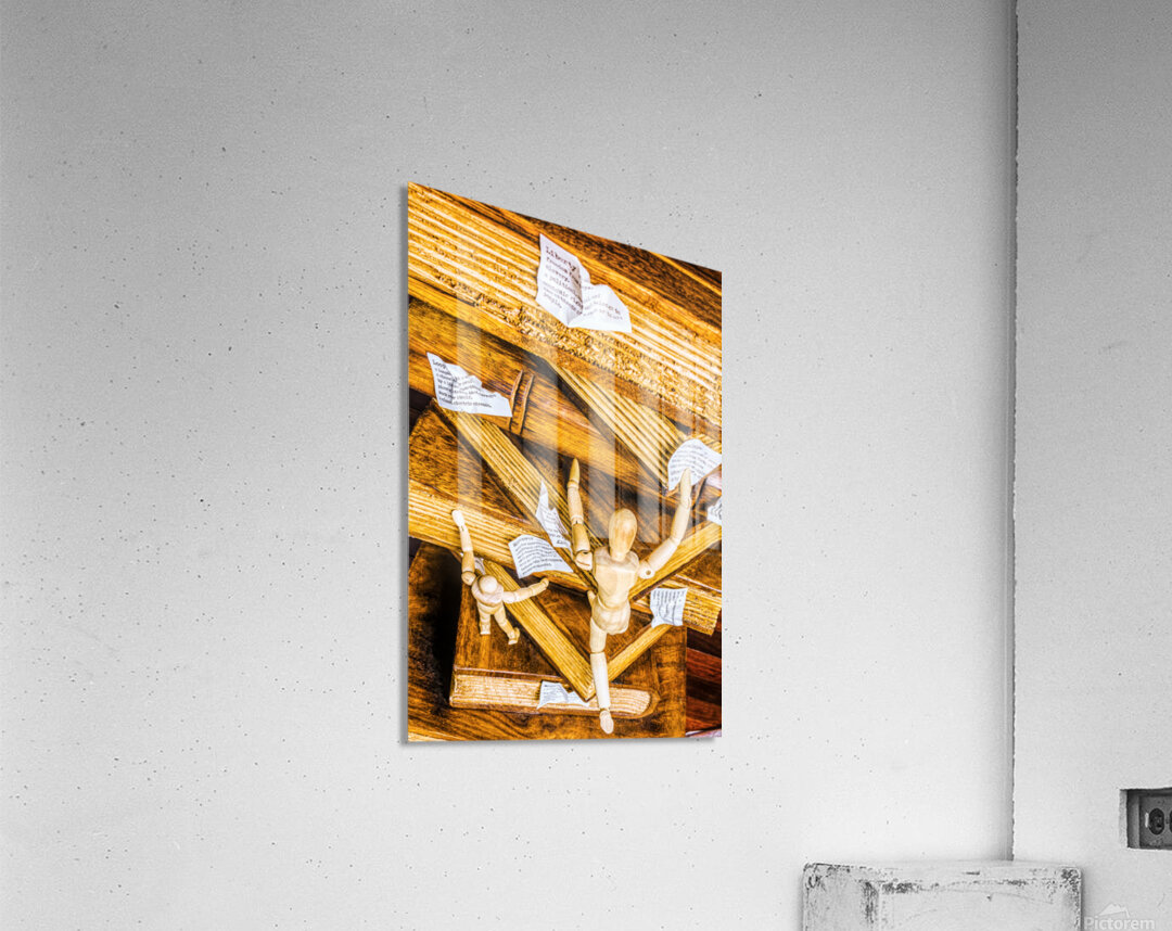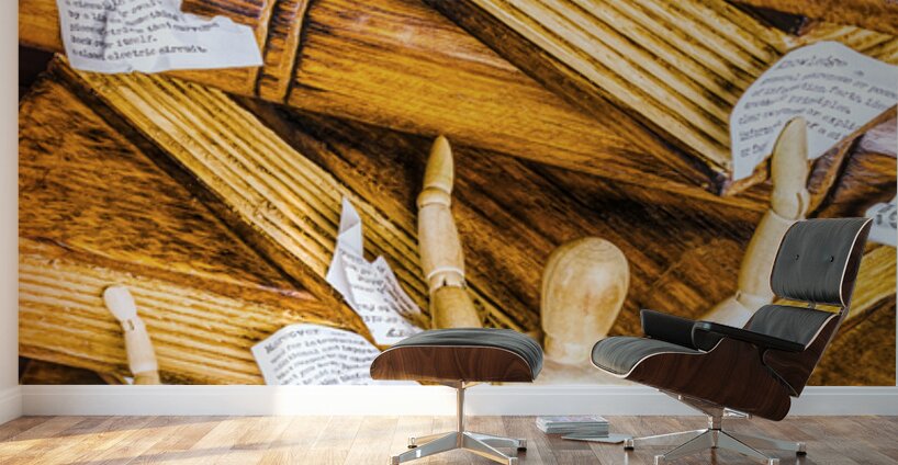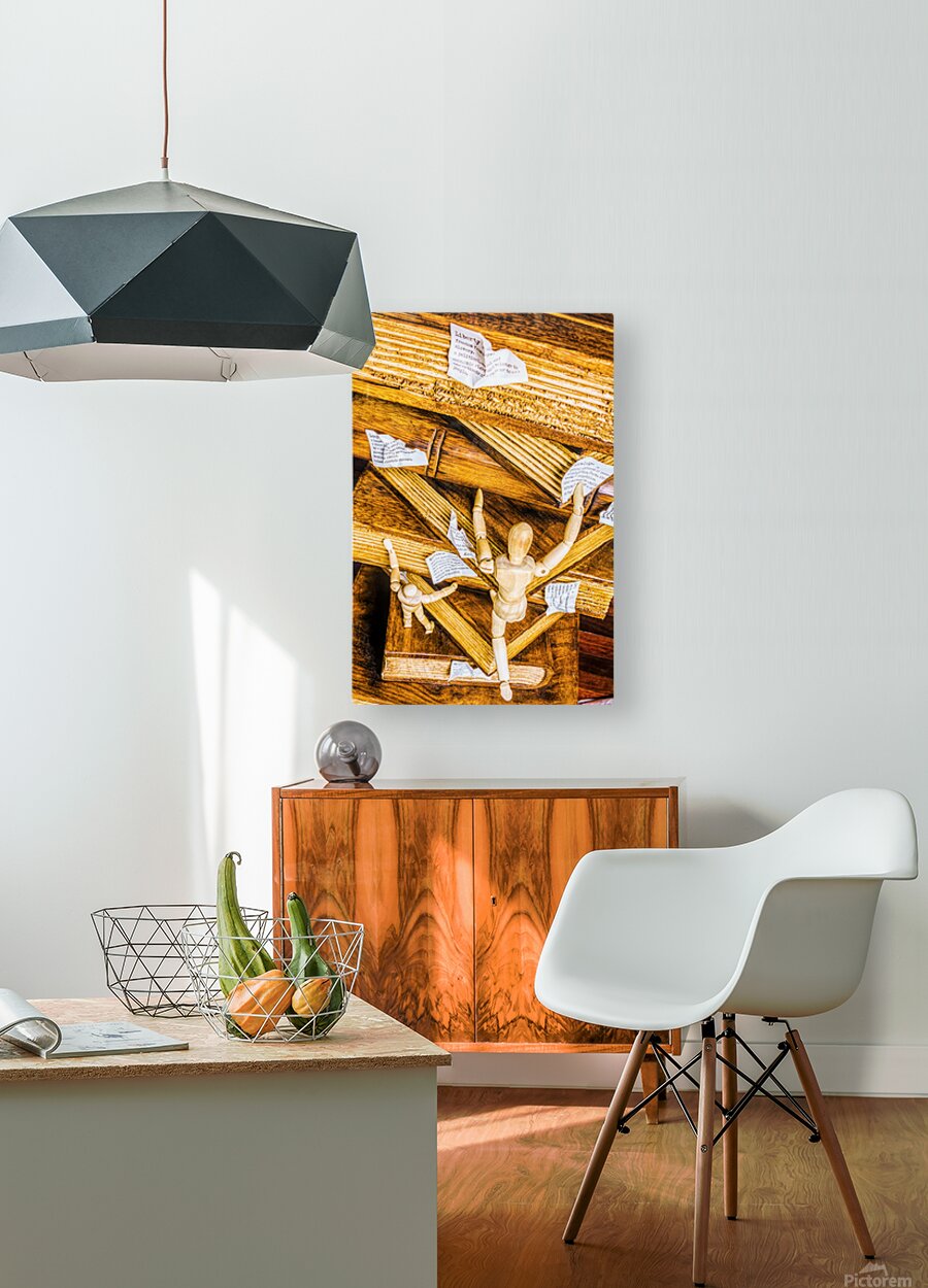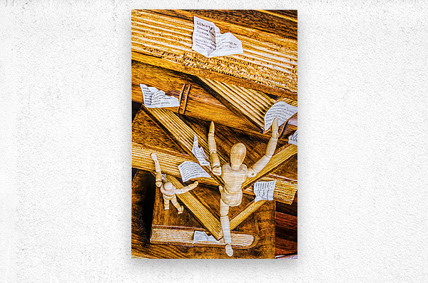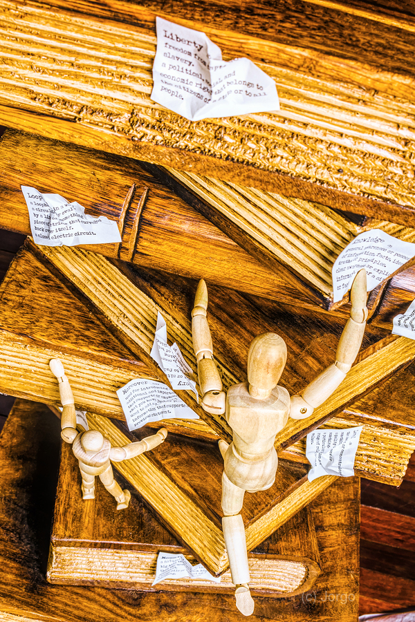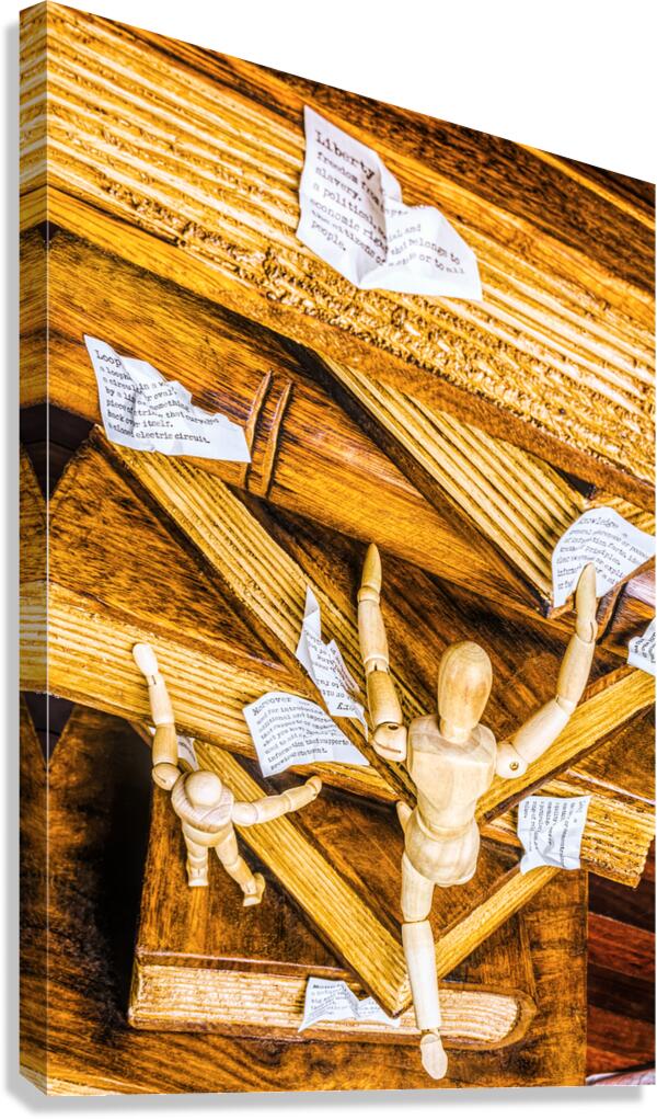 A played out scene many stories high as wooden toy figures take flight from knowledge unbounded trekking up a novel staircases in a release of the mind