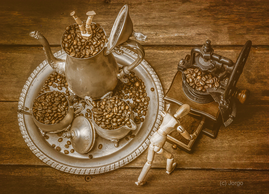 A creative take of catering imaginations with wooden hospitality staff making coffees and make believe
