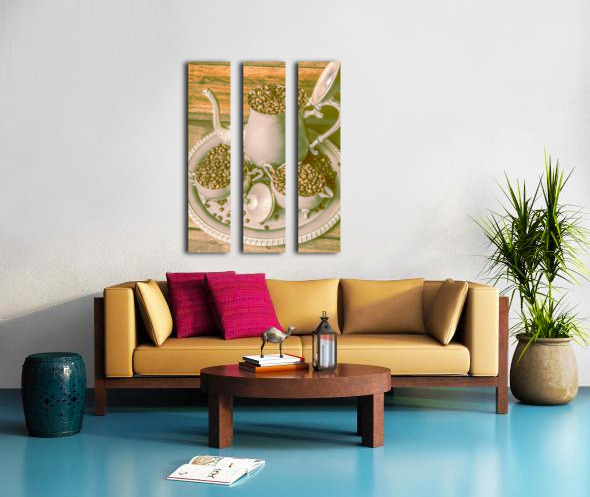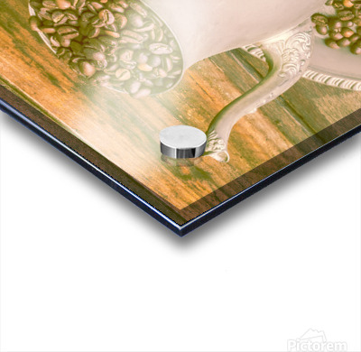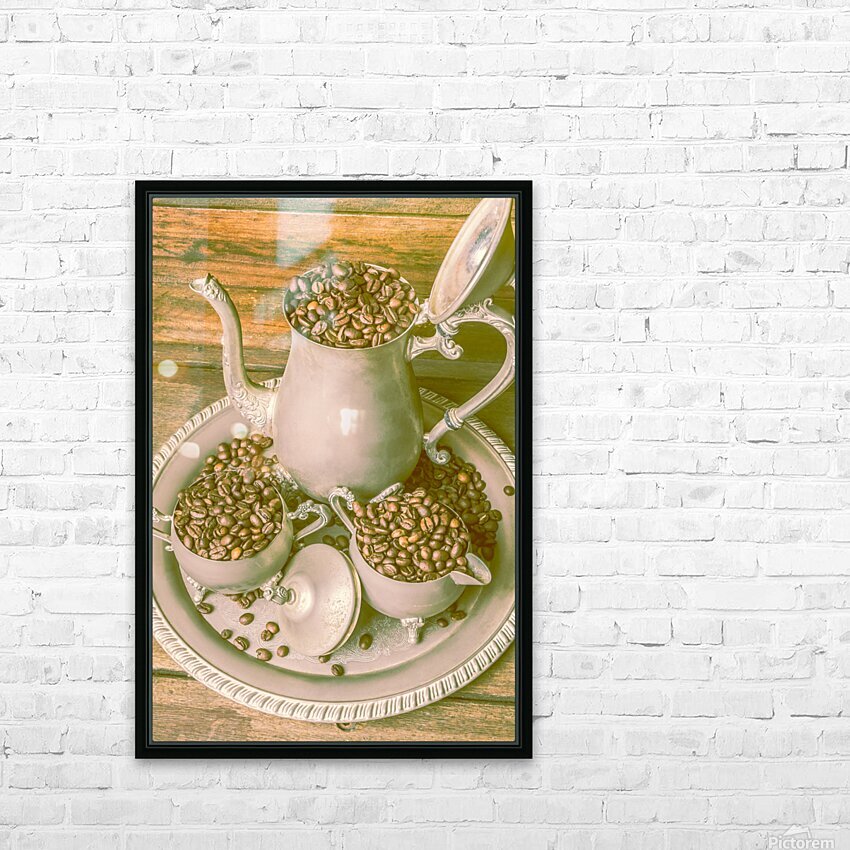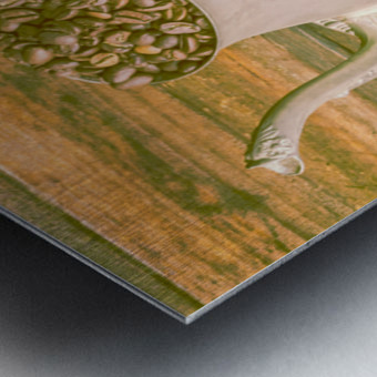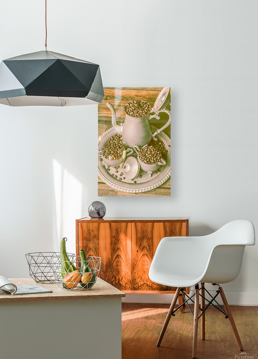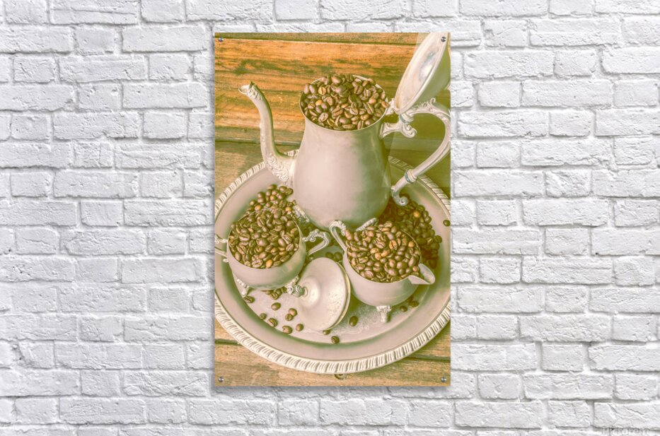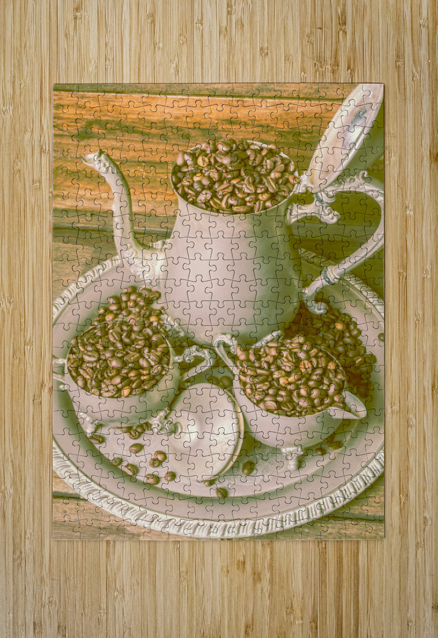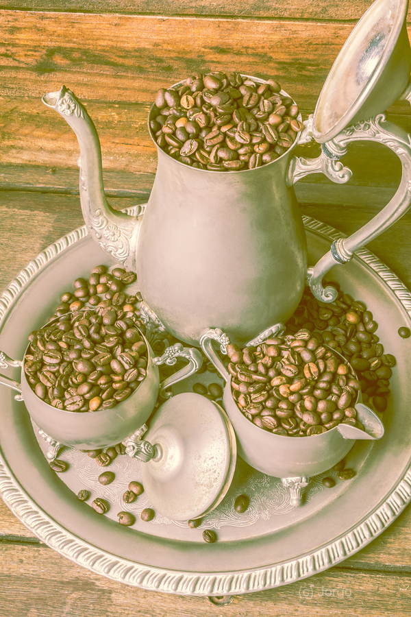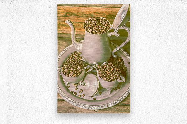 In a rustic setting a stylish silver coffeepot and matching vessels overflow with aromatic bean display in a retro high tea setting of distinguished e...[+]