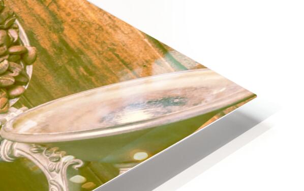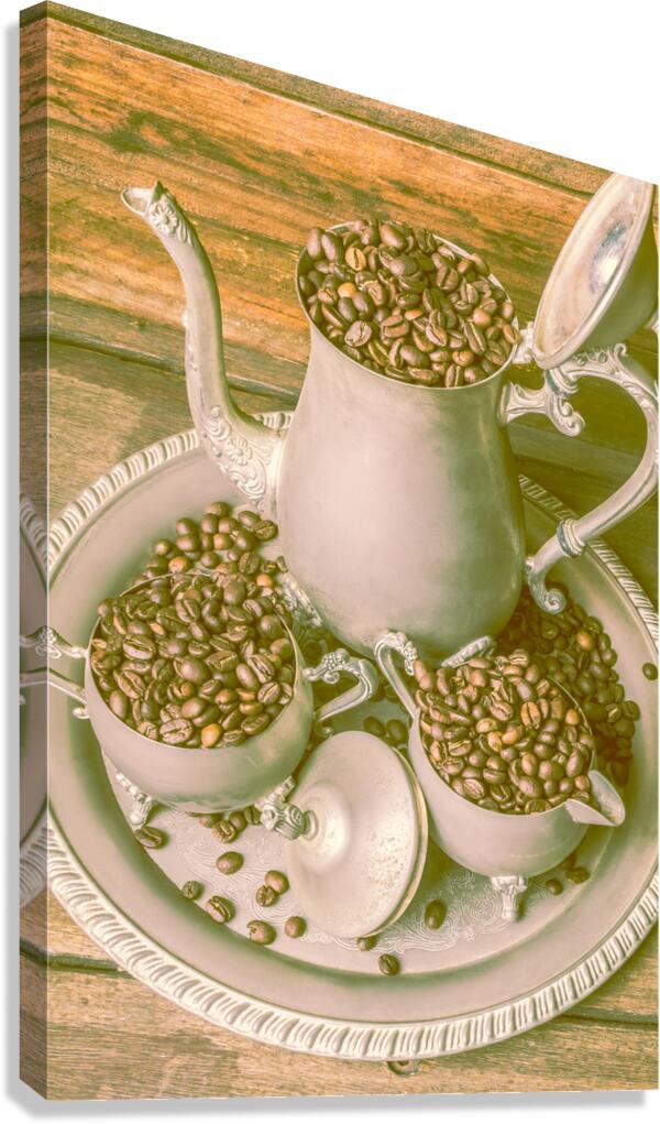 In a rustic setting a stylish silver coffeepot and matching vessels overflow with aromatic bean display in a retro high tea setting of distinguished elegance