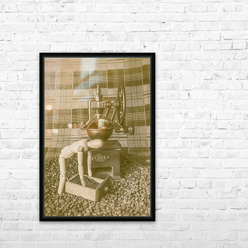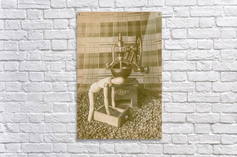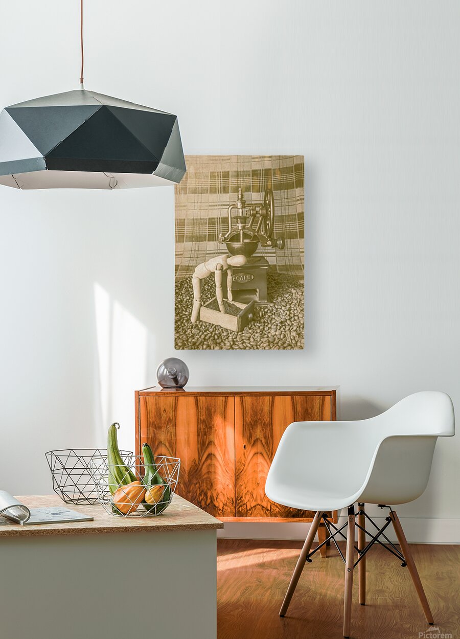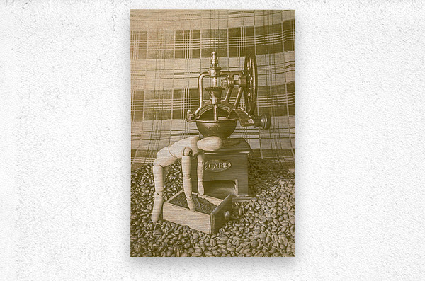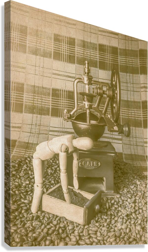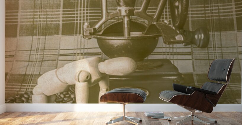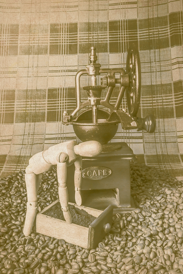 A artistic take of faded coffee blends with wooden barista doing the daily grind with old heritage mill