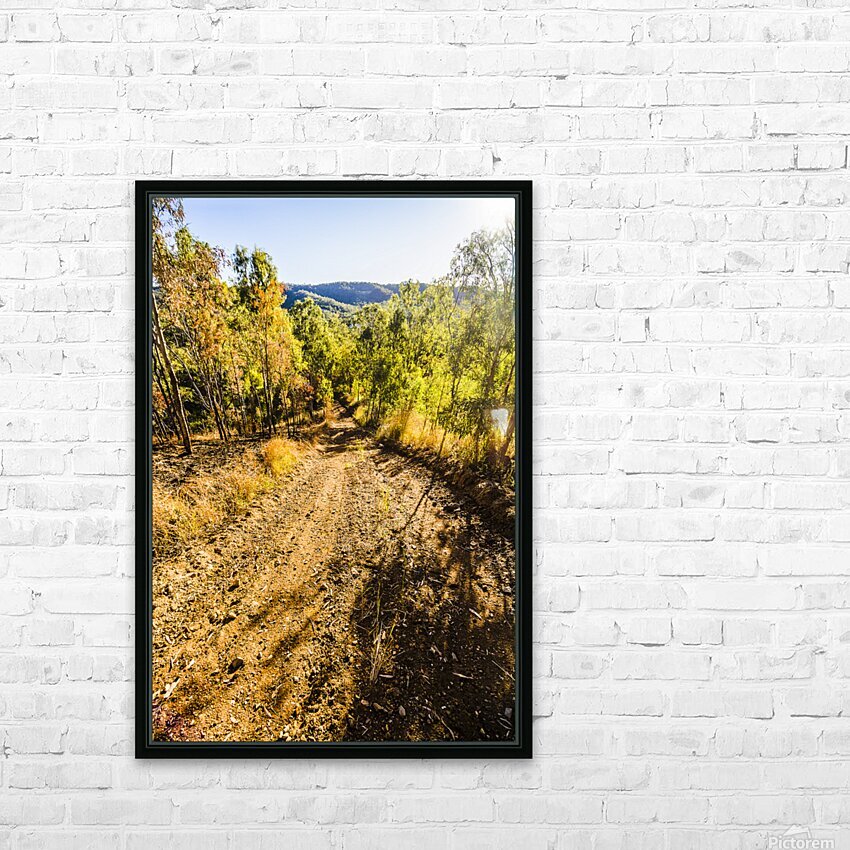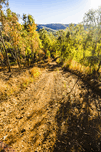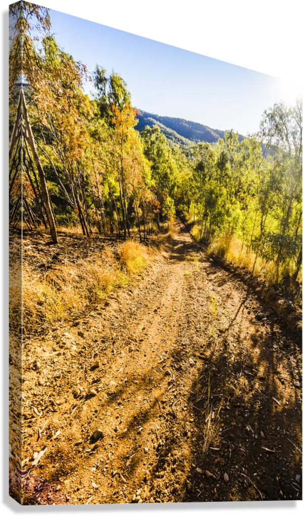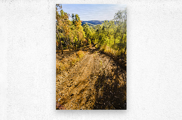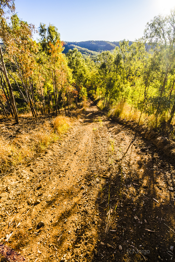 Descending rural route leading into a valley of picturesque outback terrain with distant hills and rugged dynamics. Mount Perry Queensland Australia