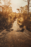 A sunbaked dirt road trails through a golden glow of Queensland countryside. Taken in Mount Perry Queensland Australia