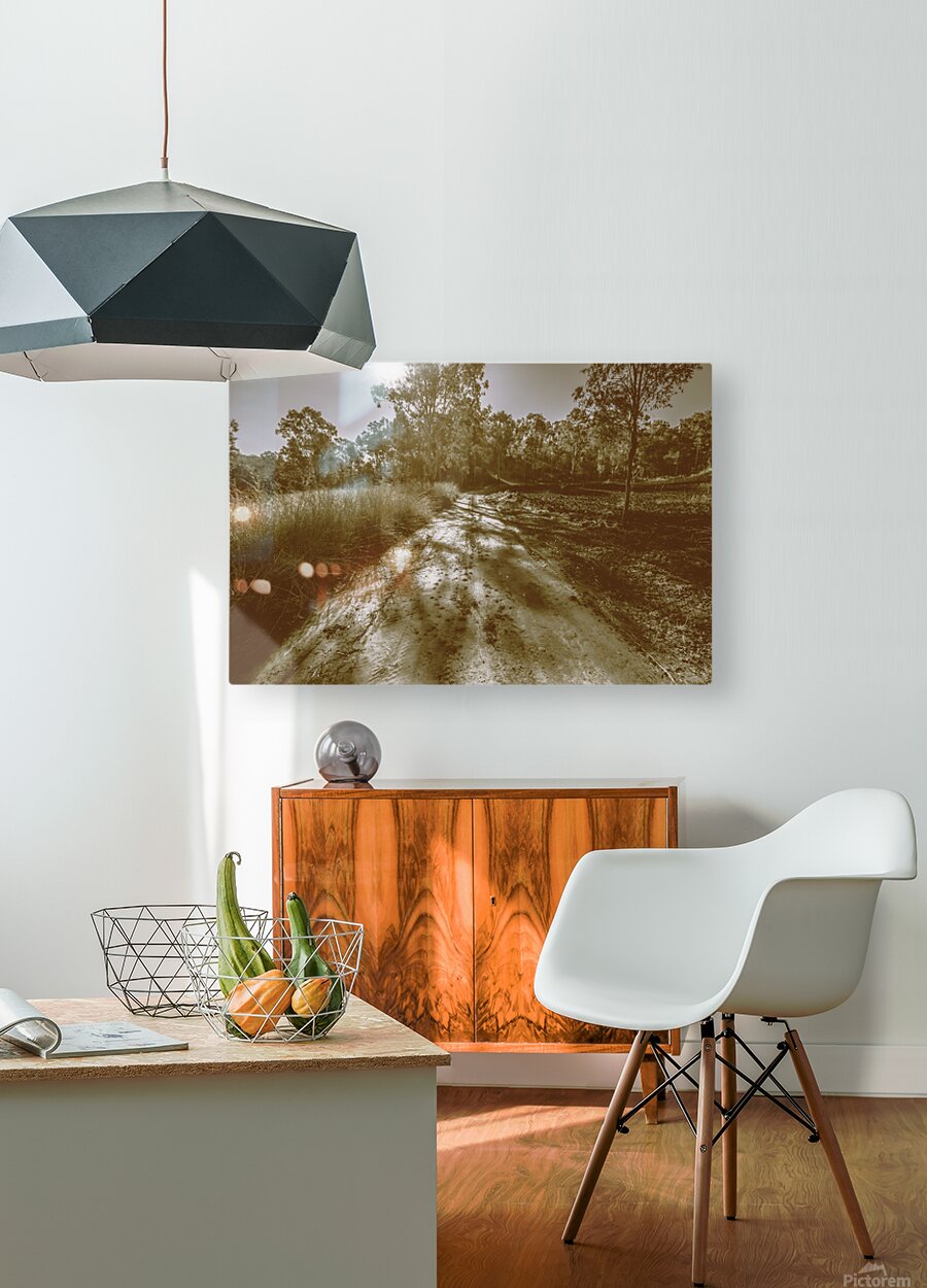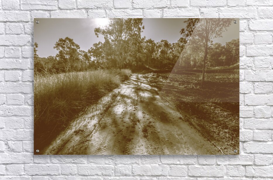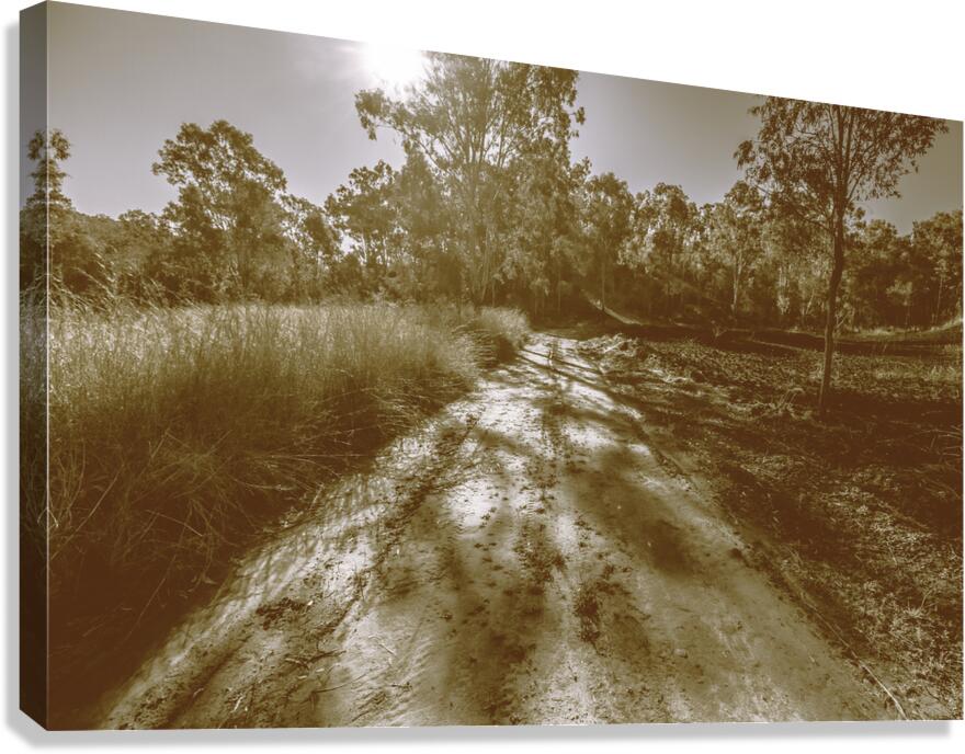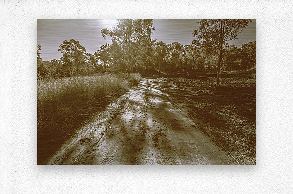 Rural road running headlong into an outback setting of winter country sunset adorned by trees and shadows. Captured: Mt Perry Queensland Australia