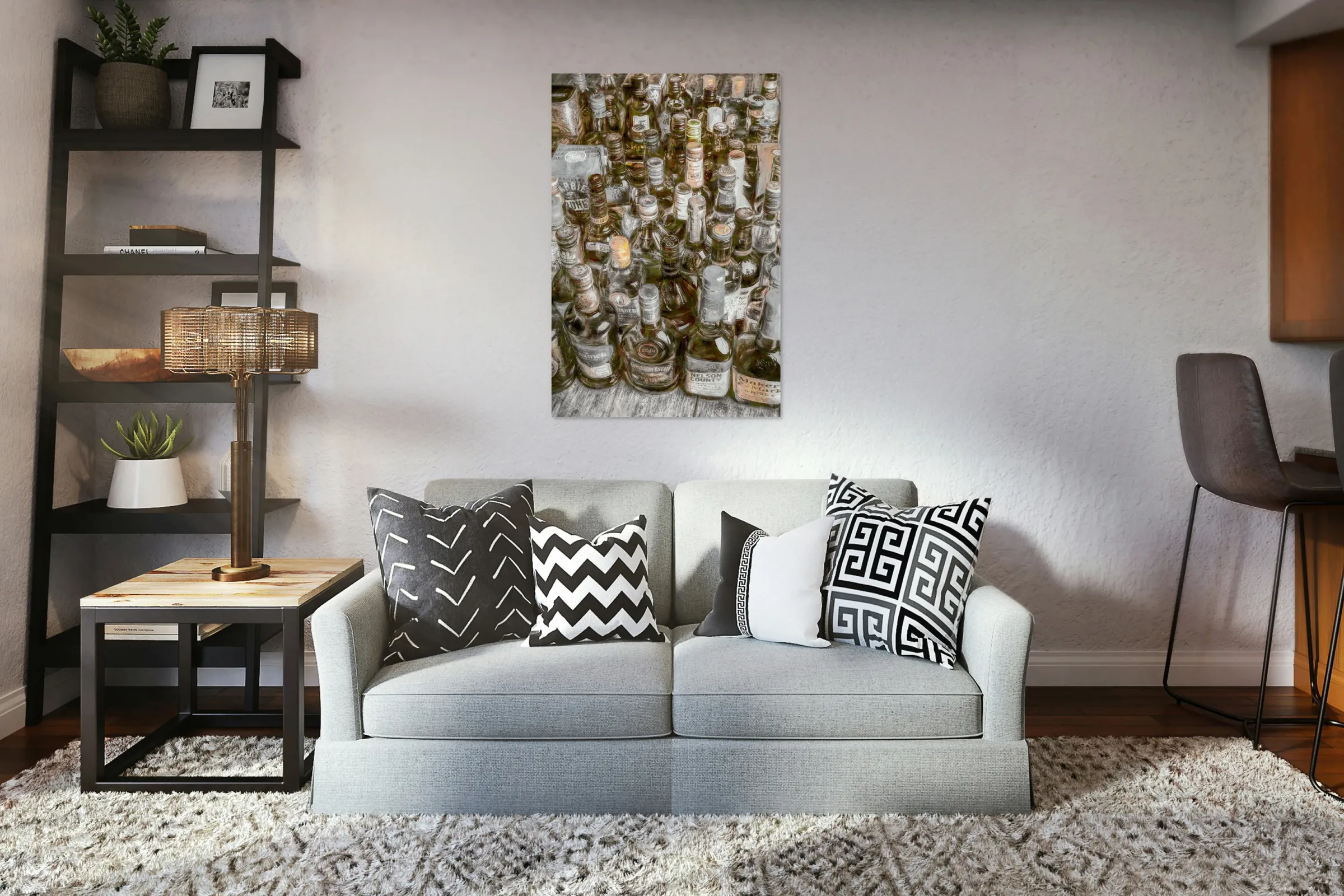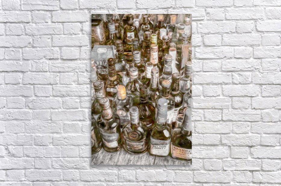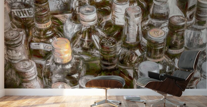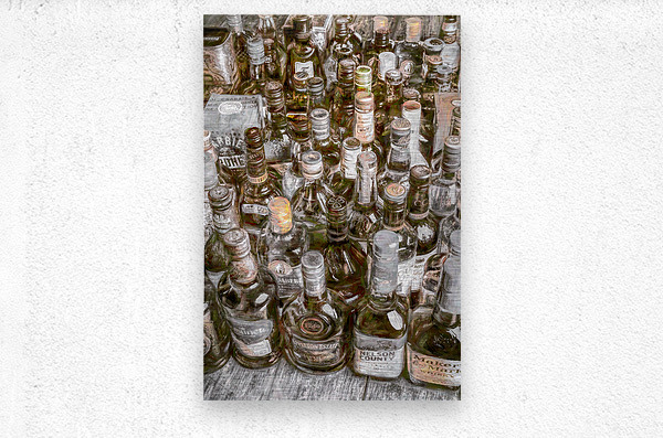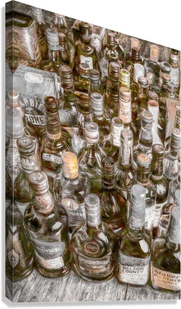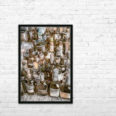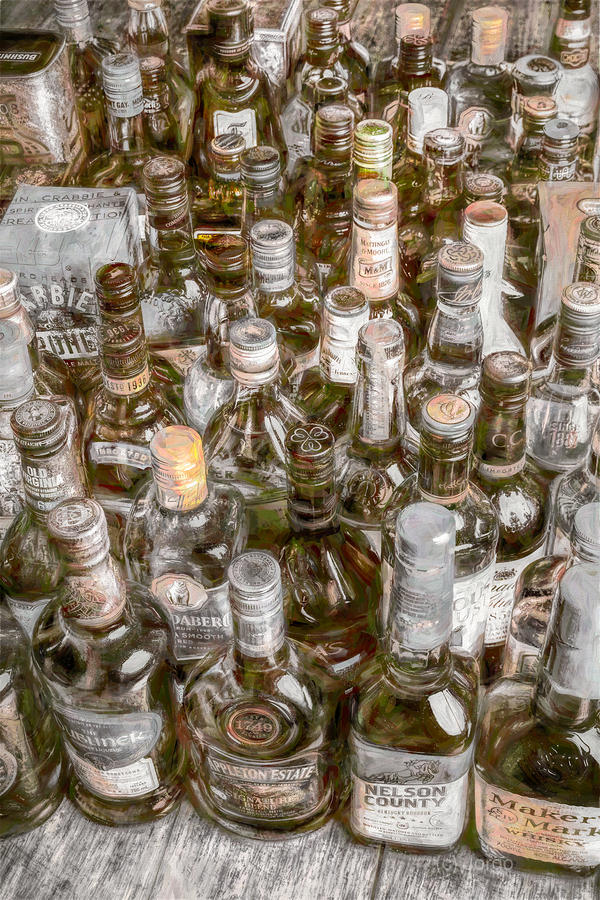 Painterly art on a collectable batch of bar bottles in a weathered wash of stowaway styling