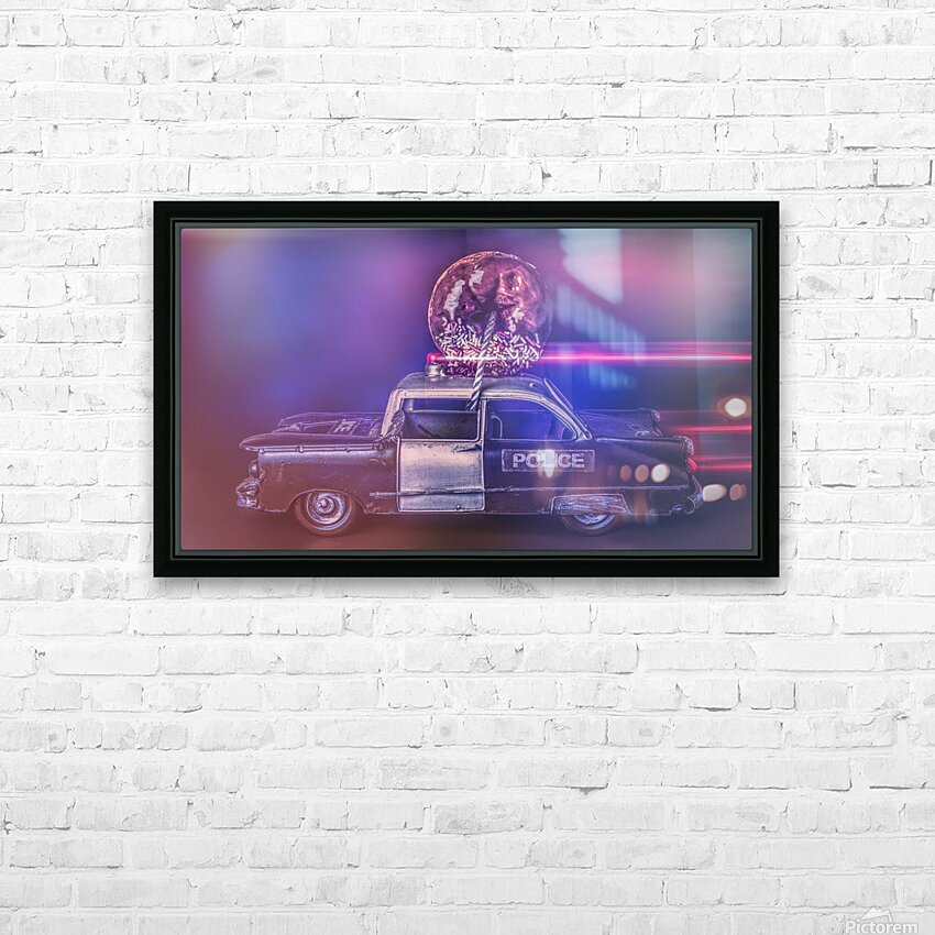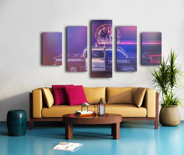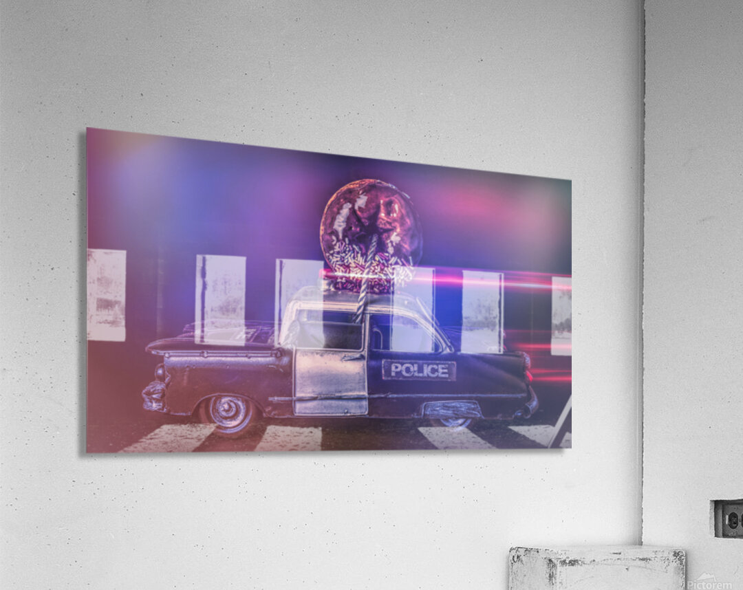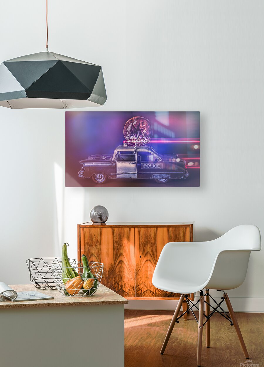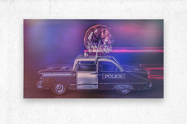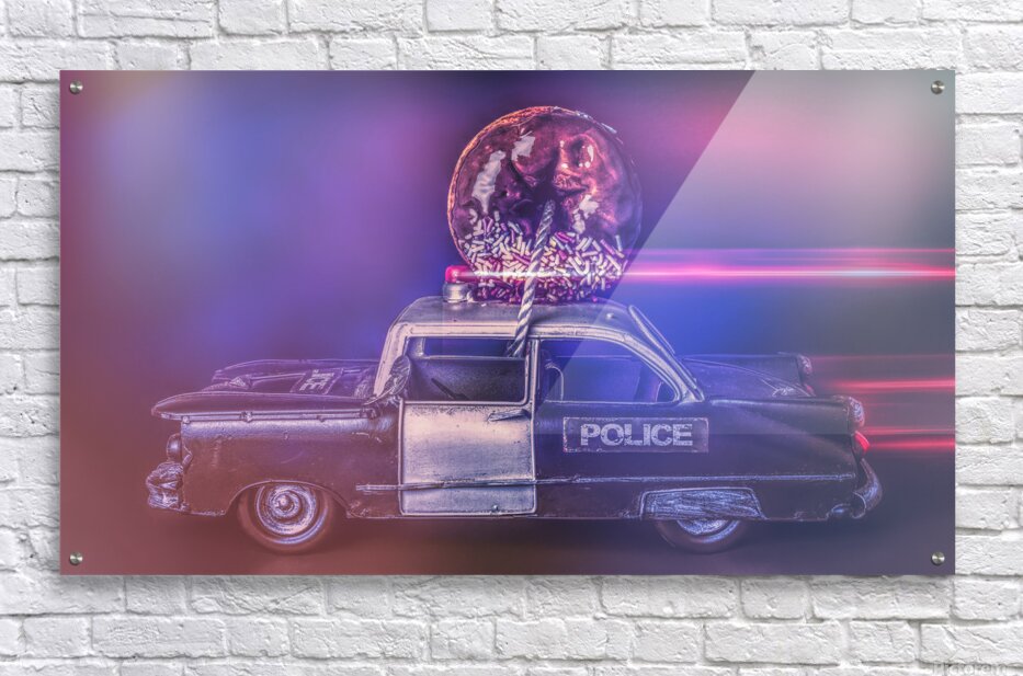 In an scene of search and seizure a pop art cop car takes hold of a massive doughnut in neon noir