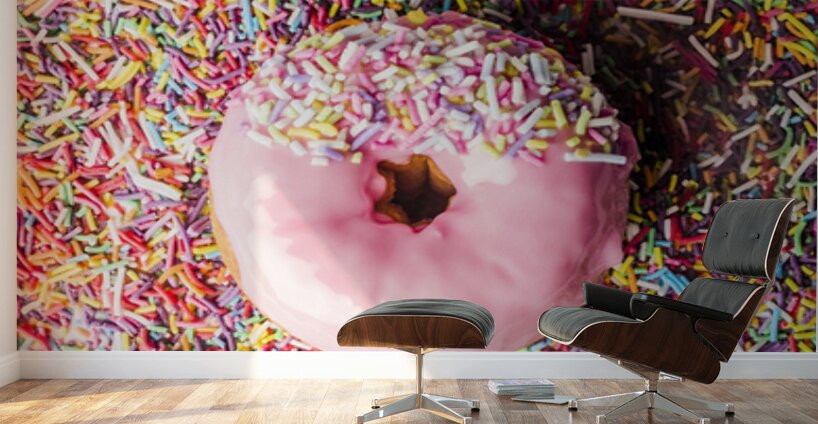 A sprinkled still life photograph of colorful candy bar dynamics with a single strawberry doughnut on cake decorating flakes