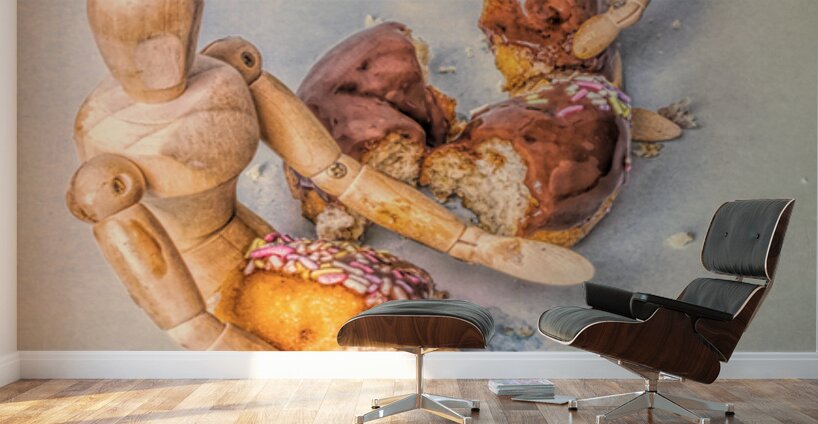 Played out scene of cute confectionery fun with mannequin dolls and donut birthday party cakes in clarified retro styling