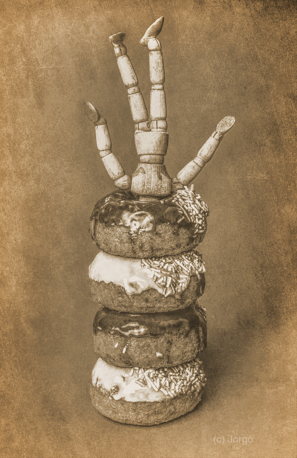 A creative vintage styled composition of a donut obsessed wooden mannequin diving headfirst in a tower of donuts