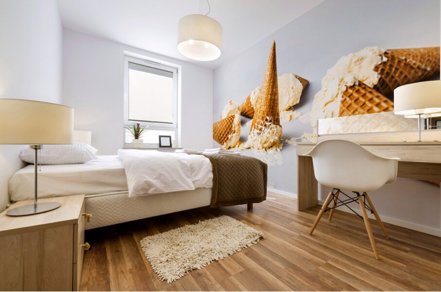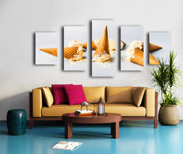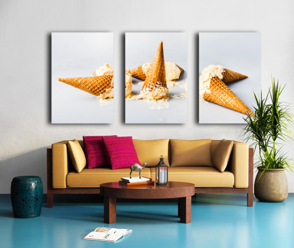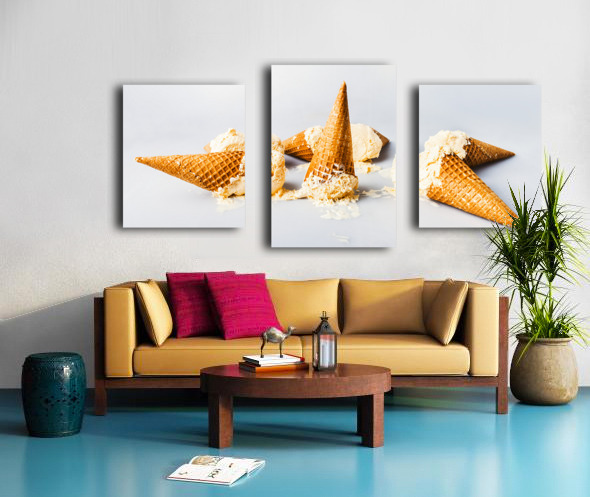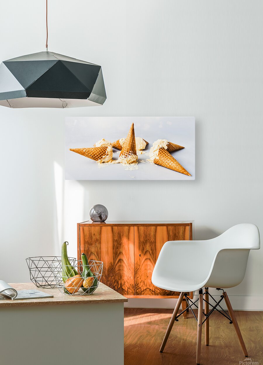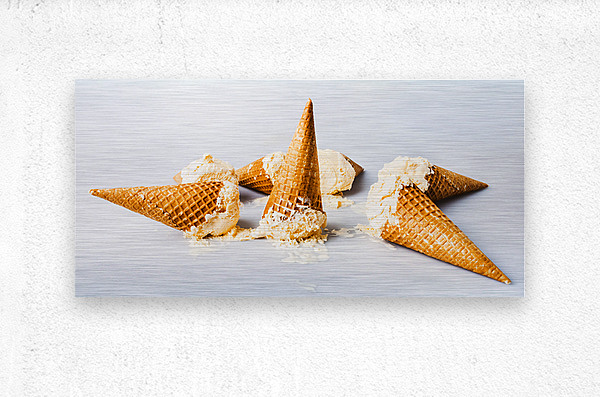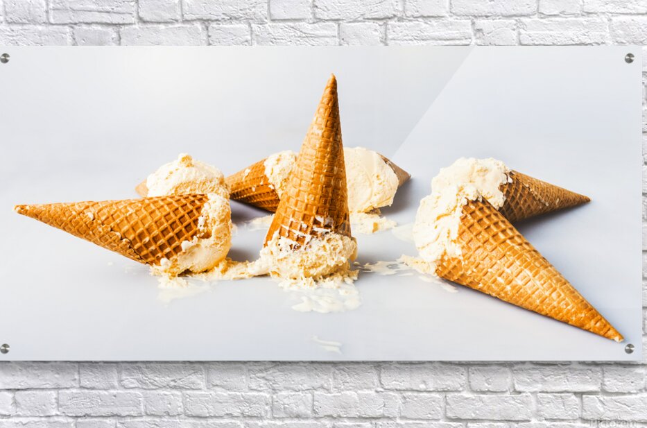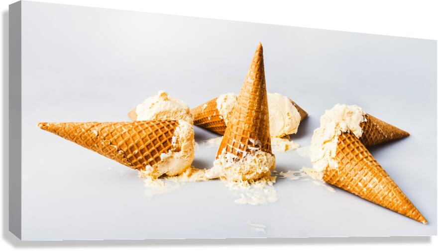 A contemporary take in sweet summer visuals as a spillage of ice-cream cones melt in delicious style on light blue background