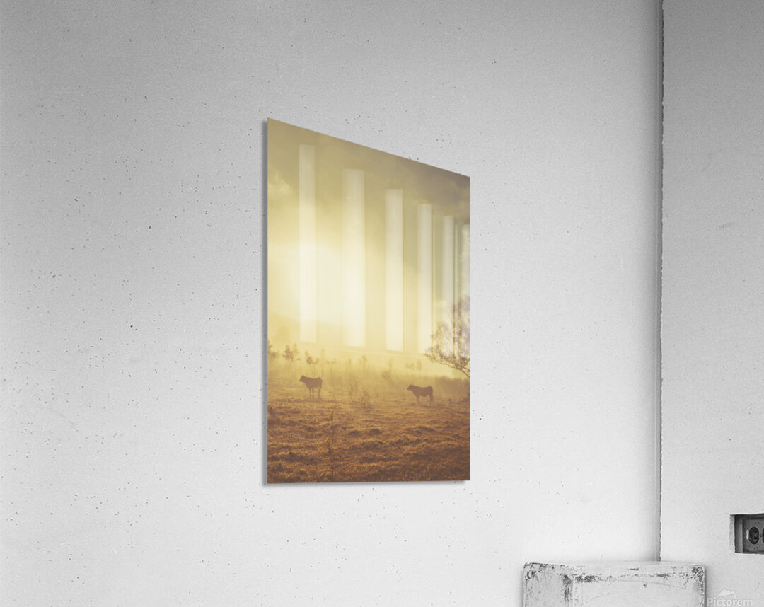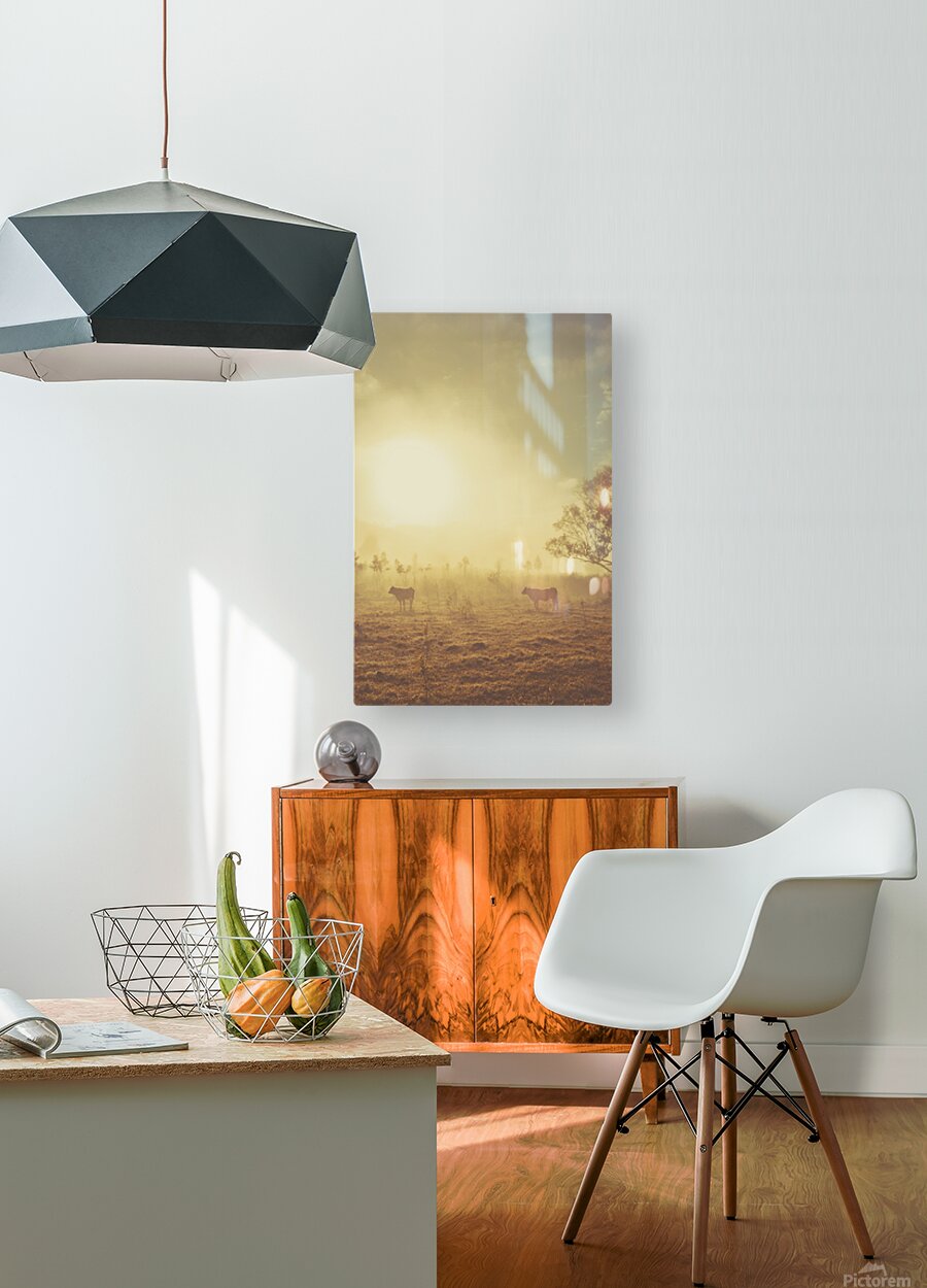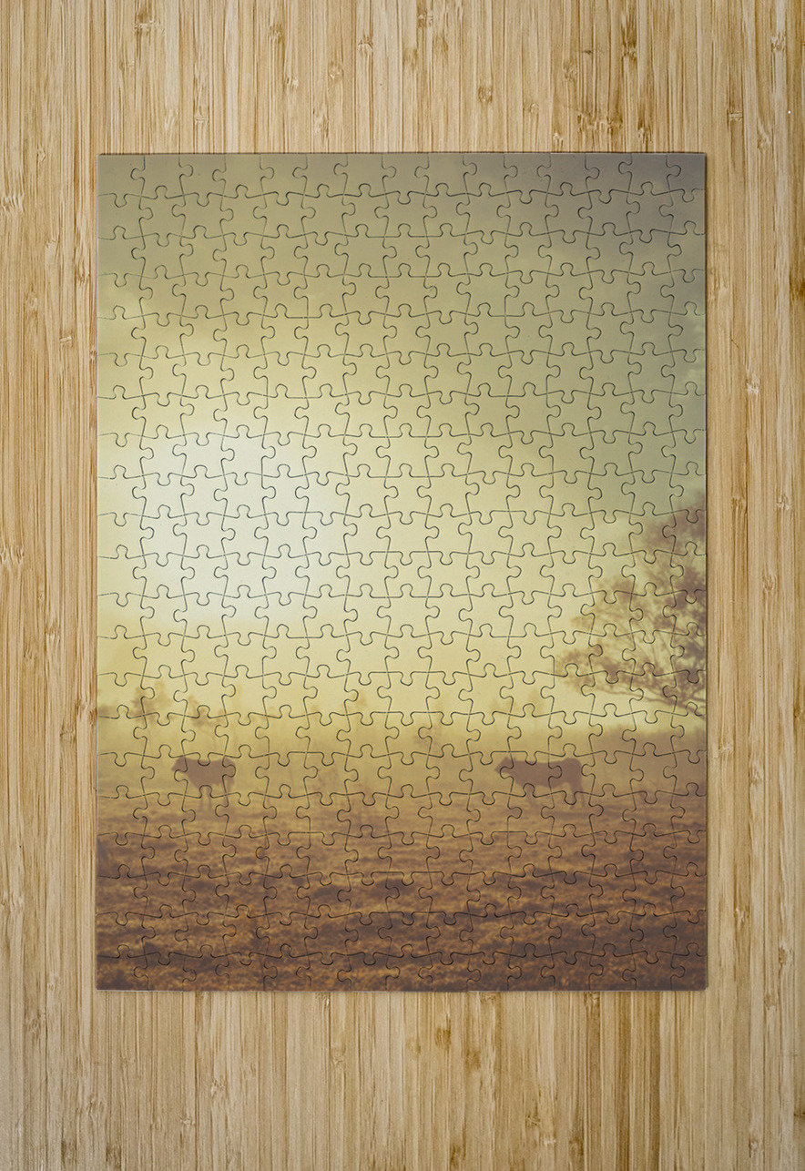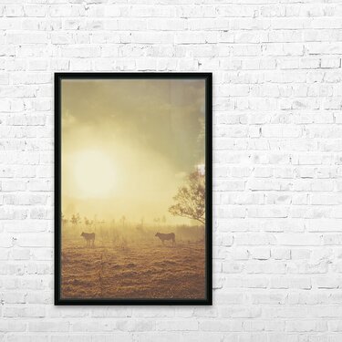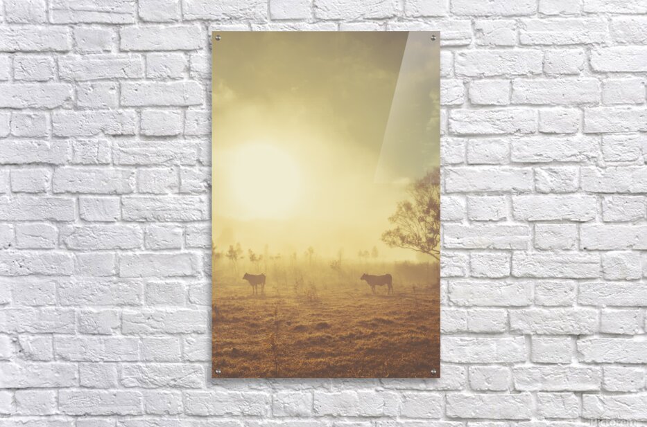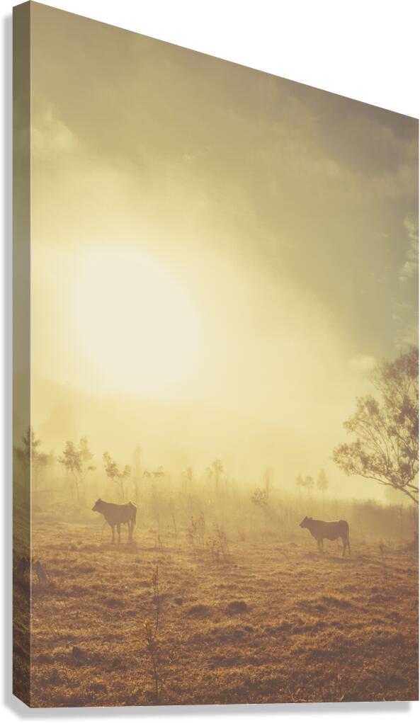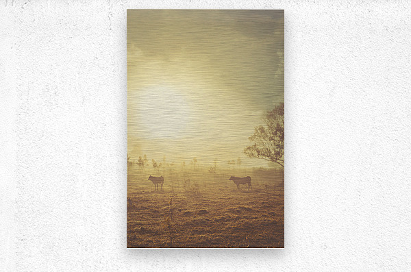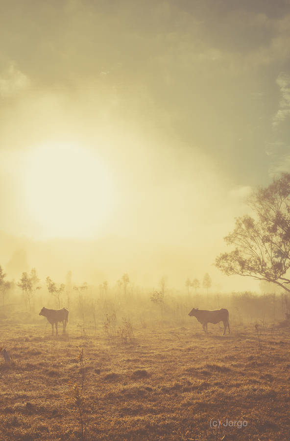 Soft yet crisp country view of cattle and fog sweeping across a grassland of golden hues and natural beauty. Taken: Mount Perry Queensland Australia