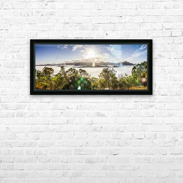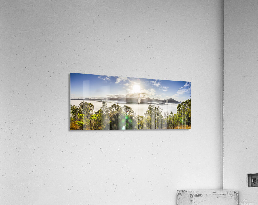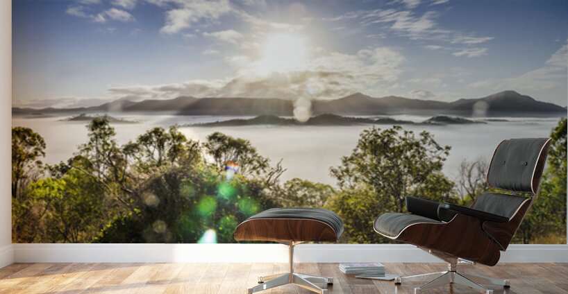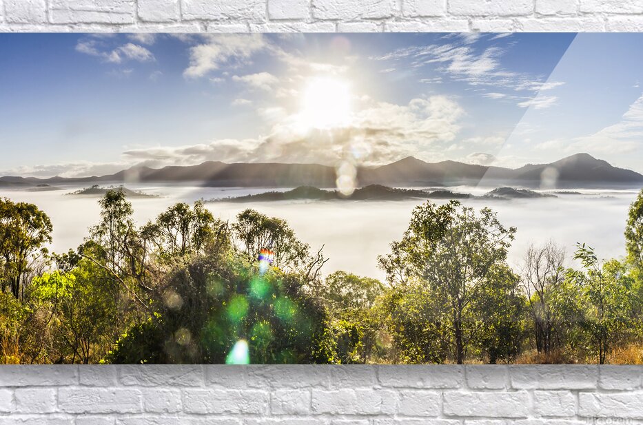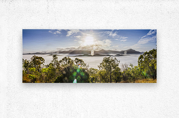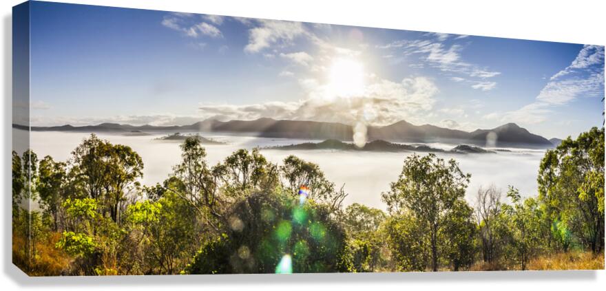 Wide open panoramic landscape of fog swept mountain range complete with lens flare and oncoming sun perspective. Mt Perry Queensland Australia