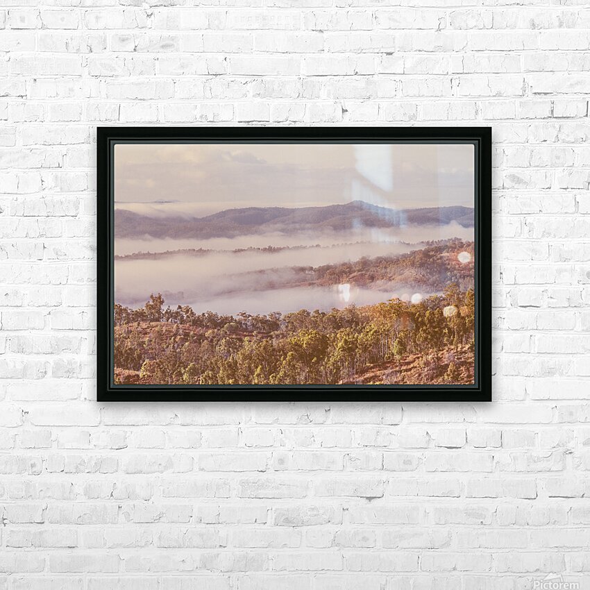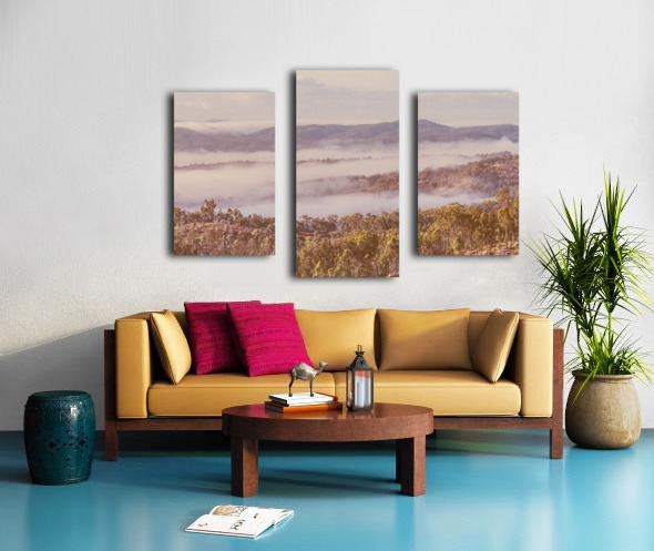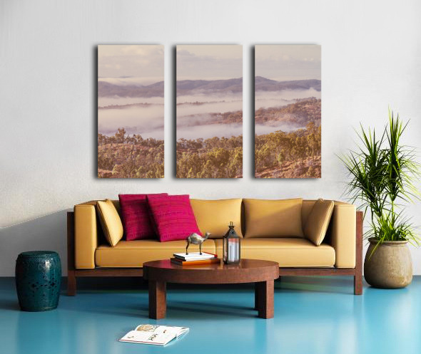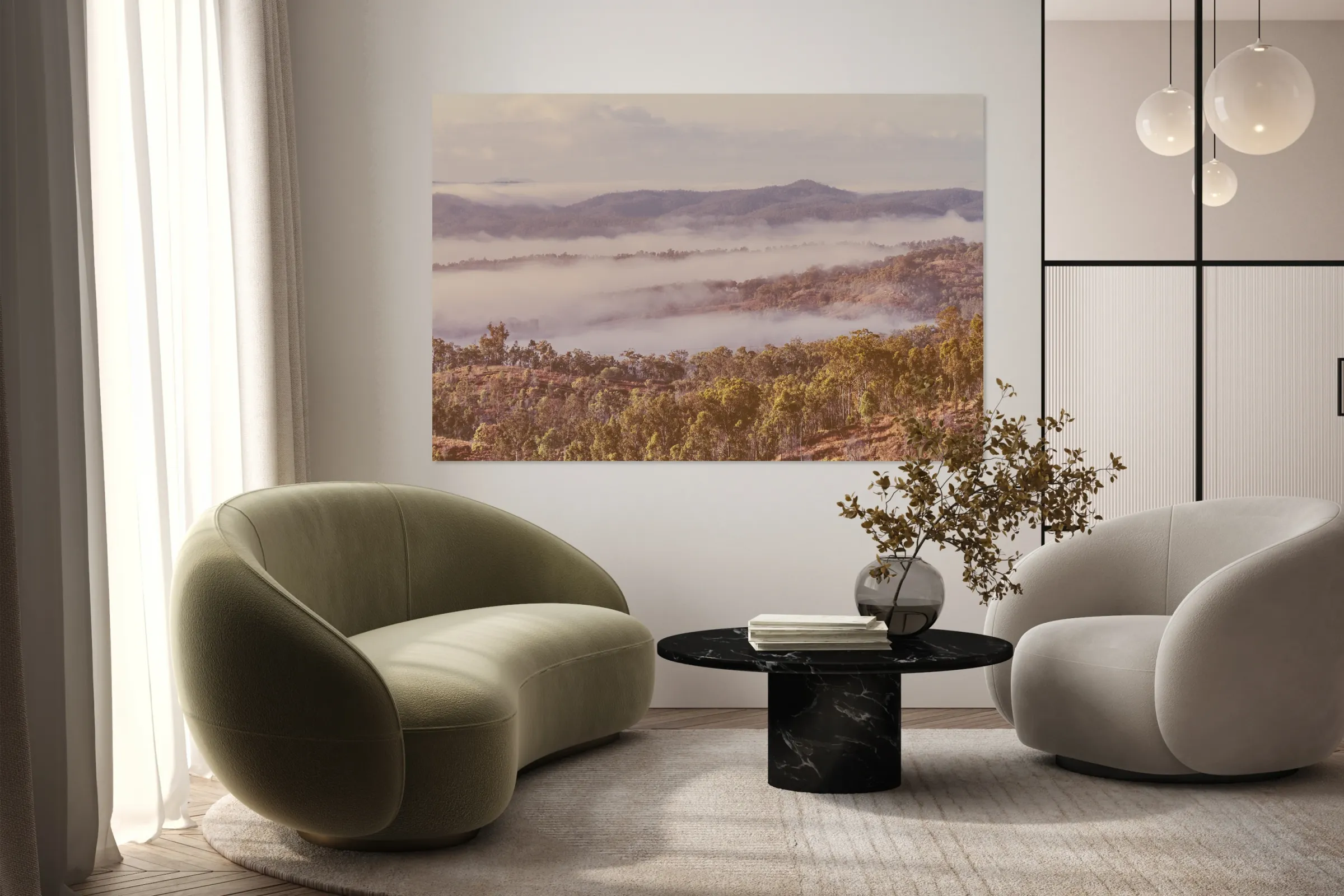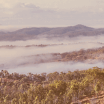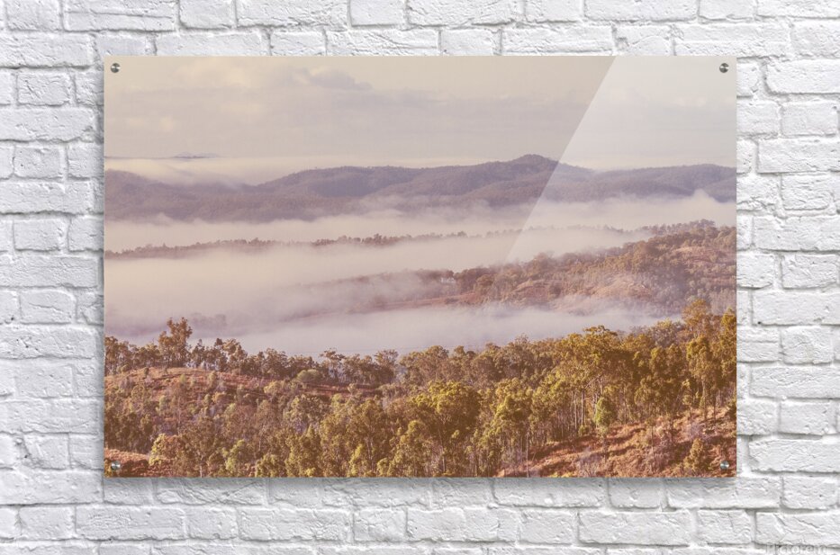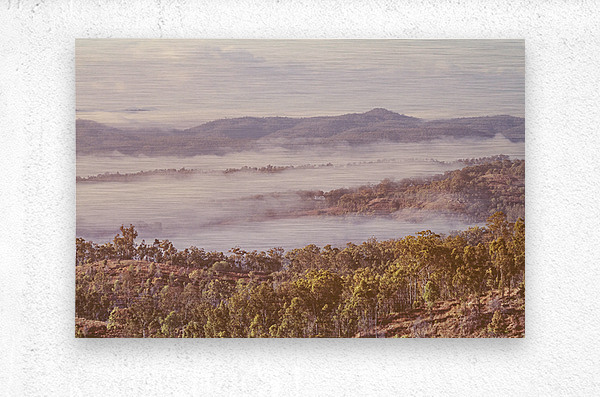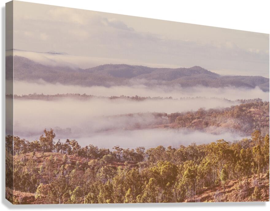 Pastel palette of cool country colours with wooded wilderness fog rising harmoniously with the morning light. Mt Perry Queensland Australia